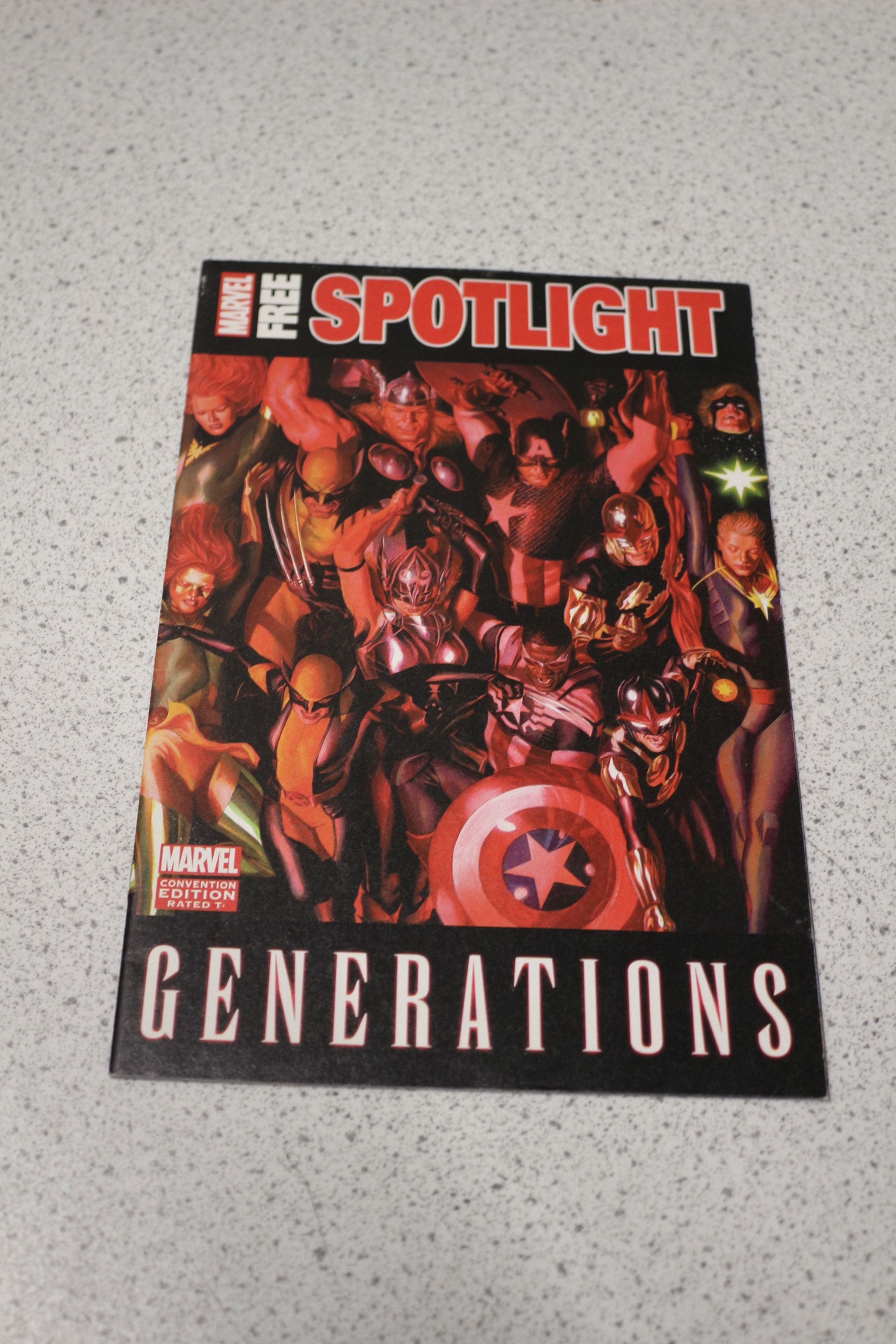 A Marvel comic book titled ‘MARVEL FREE SPOTLIGHT GENERATIONS, ‘ featuring a dark cover with various colourful superhero characters and labelled ‘CONVENTION EDITION RATED T.’
