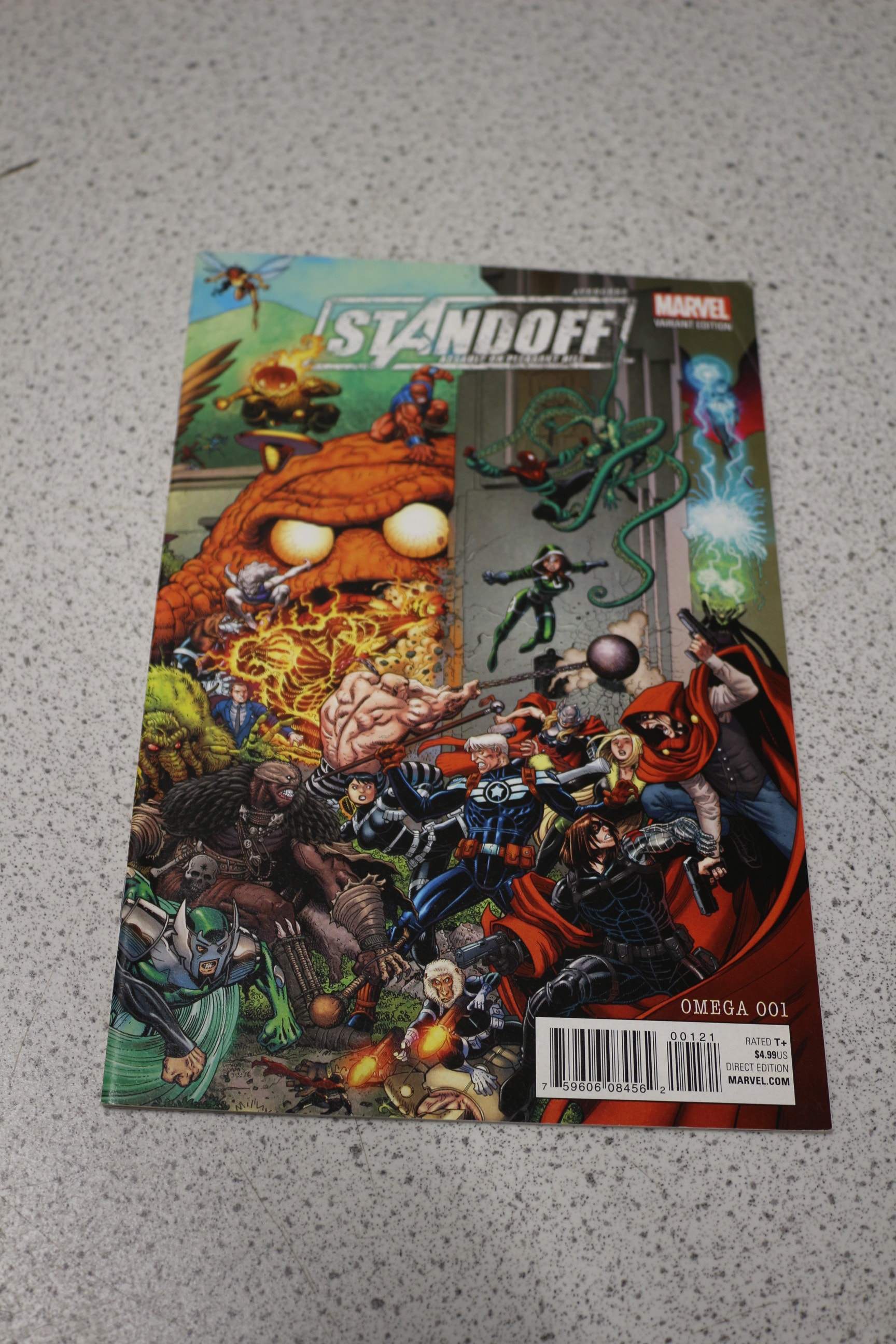 A multi-coloured Marvel comic book titled “STANDOFF”, identified as “VARIANT EDITION” and “OMEGA 001”, with visible text “RATED T+”, “DIRECT EDITION”, and “MARVEL.COM”, priced at $4.99US.