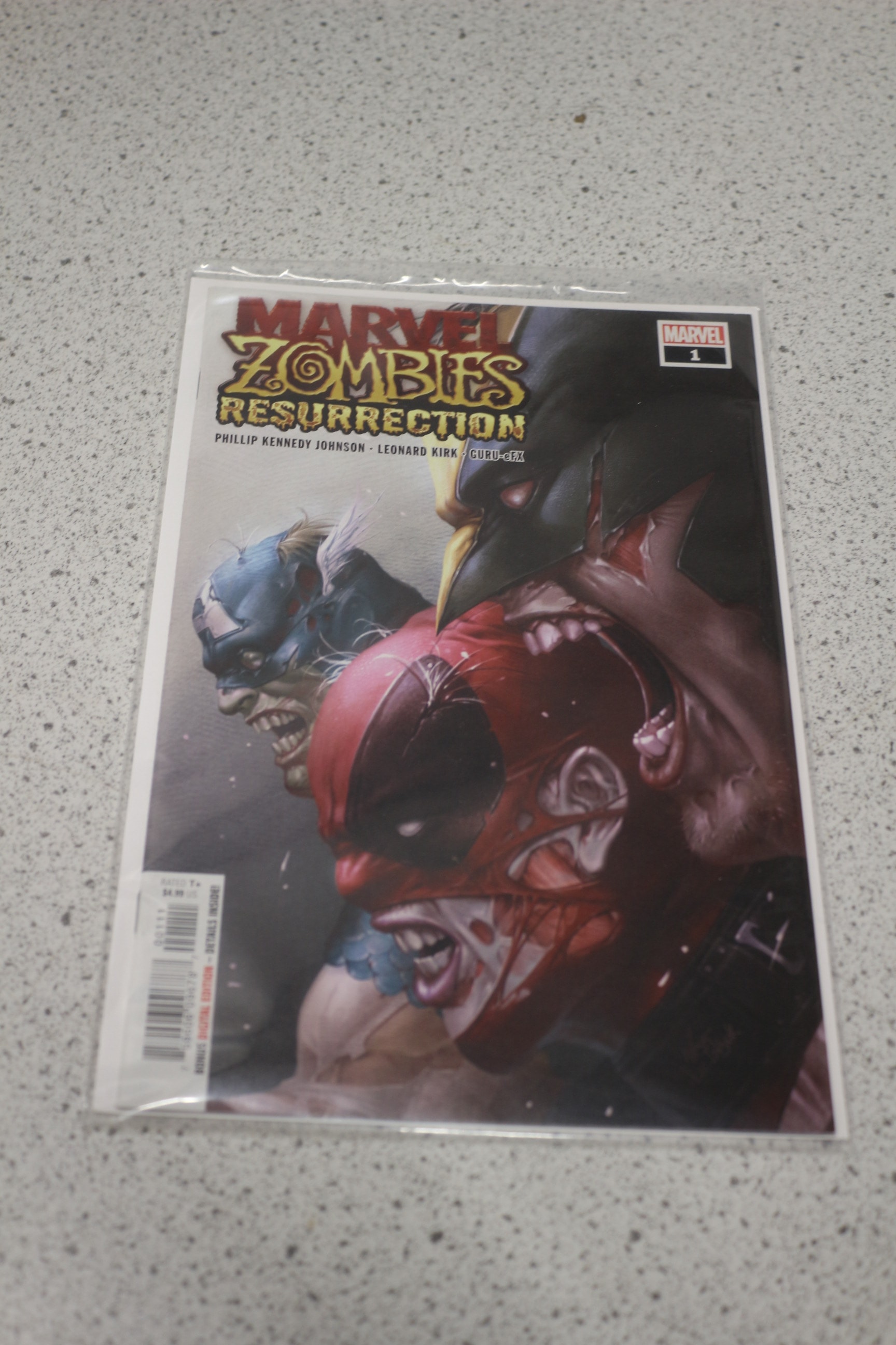 A Marvel Zombies Resurrection comic book, issue #1, featuring a multi-coloured cover with zombie versions of Marvel characters, marked ‘RATED T+’, ‘BONUS DIGITAL EDITION – DETAILS INSIDE!’, and a price of $4.99 US.