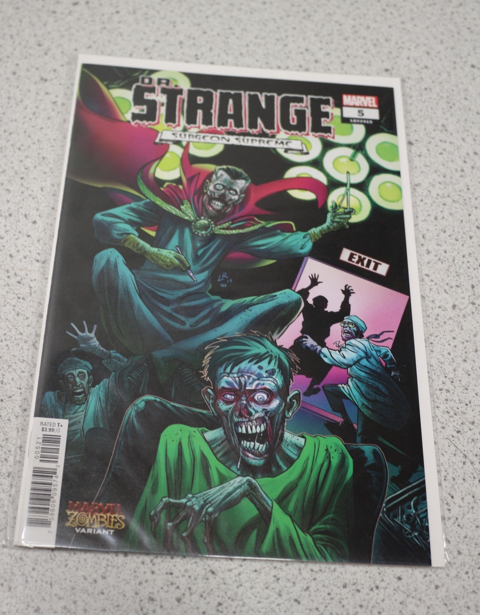 A single comic book, “DR. STRANGE SURGEON SUPREME” #5 (MARVEL), features a zombie variant cover with green, red, and blue hues, labeled “MARVEL ZOMBIES VARIANT” and priced at $3.99US.