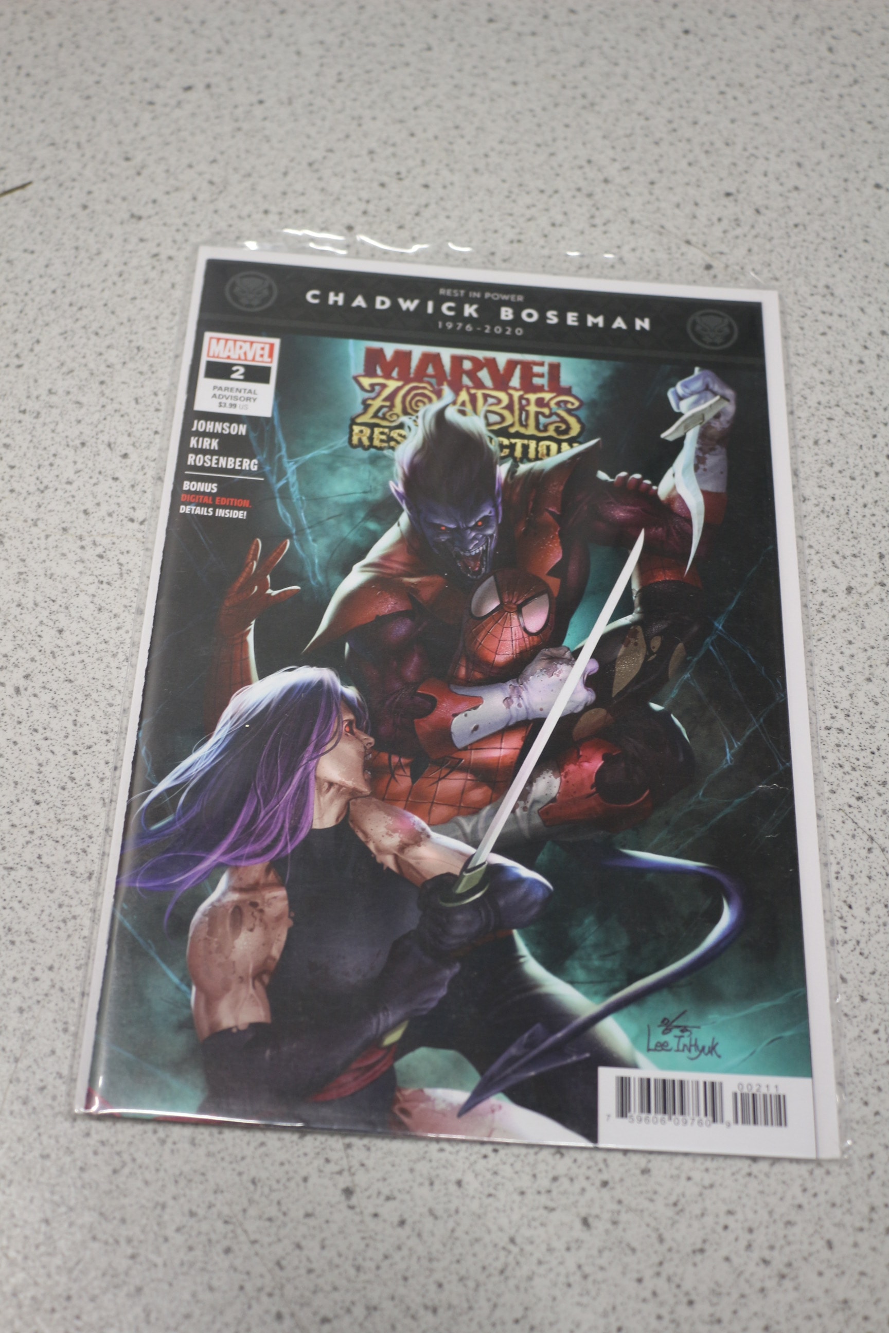 A multi-coloured Marvel Zombies Resurrection comic book, issue #2, featuring a dark blue/green, red, and purple cover, with visible text including “REST IN POWER CHADWICK BOSEMAN 1976-2020”, “MARVEL”, “PARENTAL ADVISORY”, “$3.99 US”, “JOHNSON KIRK ROSENBERG”, “BONUS DIGITAL EDITION. DETAILS INSIDE!”, and the artist’s signature “Lee Inhyuk”.