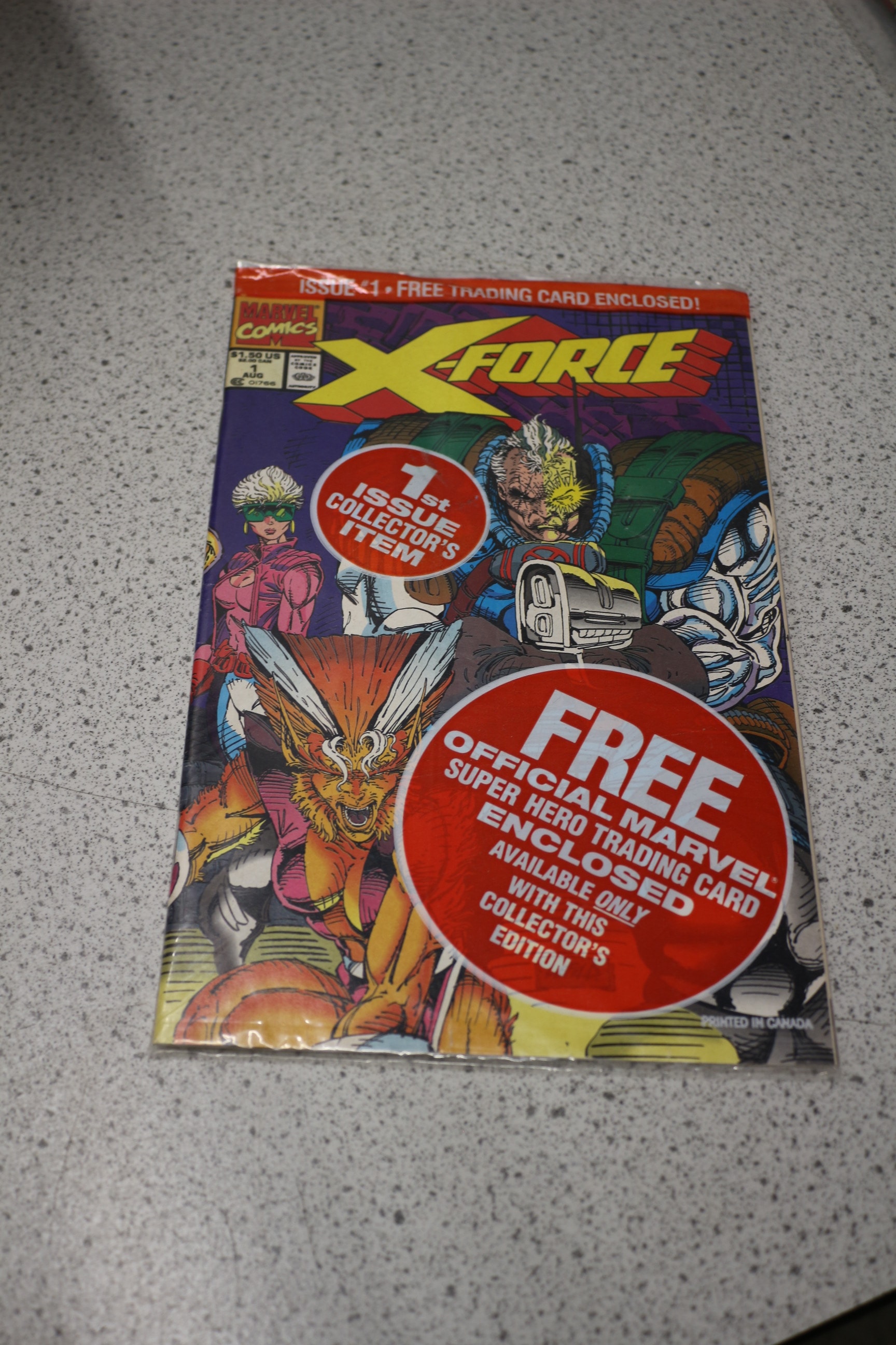 A multi-coloured Marvel X-Force #1 comic book, sealed in plastic, includes a ‘1st ISSUE COLLECTOR’S ITEM’ sticker and a free official Marvel Super Hero trading card, priced at $1.50 US / $2.00 CAN and printed in Canada.