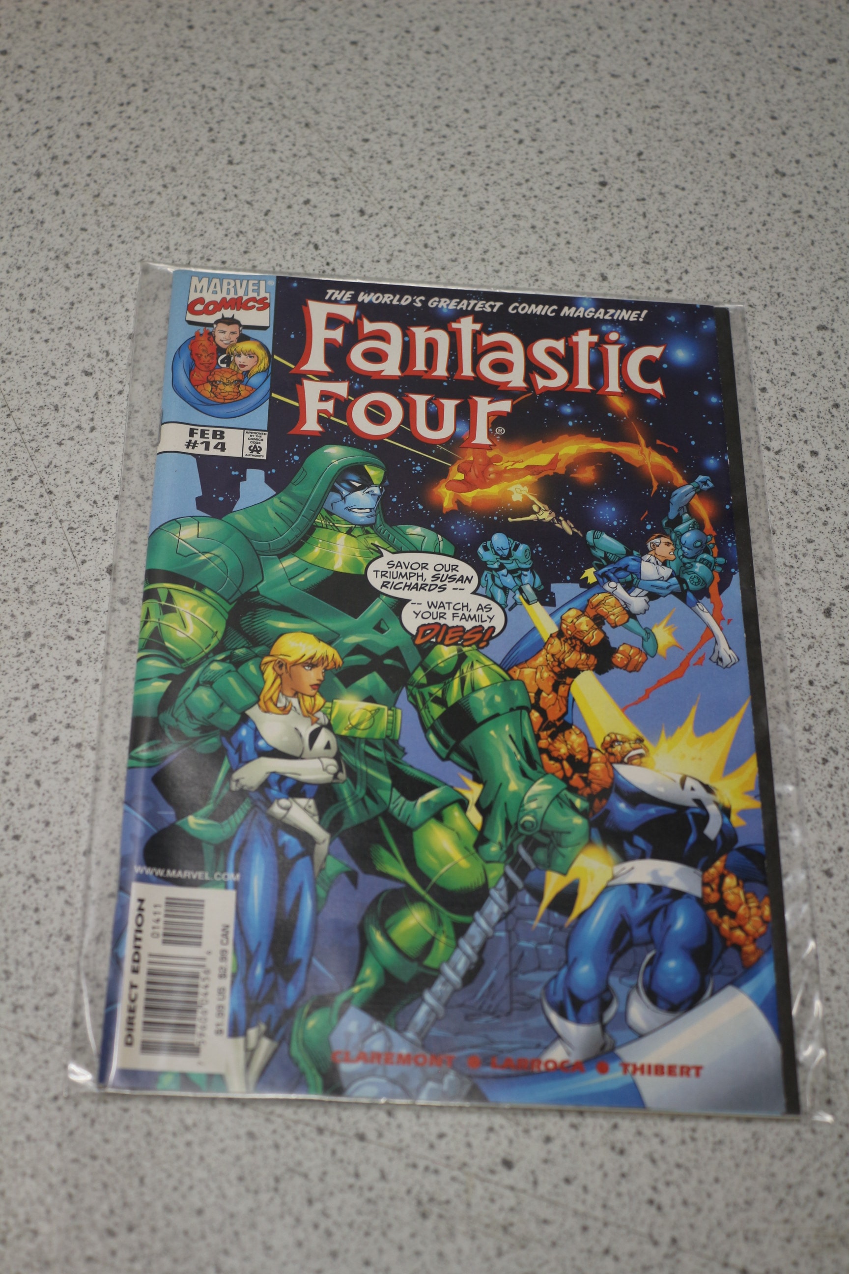 A Marvel Comics “Fantastic Four” comic book, issue #14 from February, featuring blue and green characters in a cosmic battle, with creator names “CLAREMONT • LARROCA • THIBERT”, marked “DIRECT EDITION” and priced at $1.99 US.