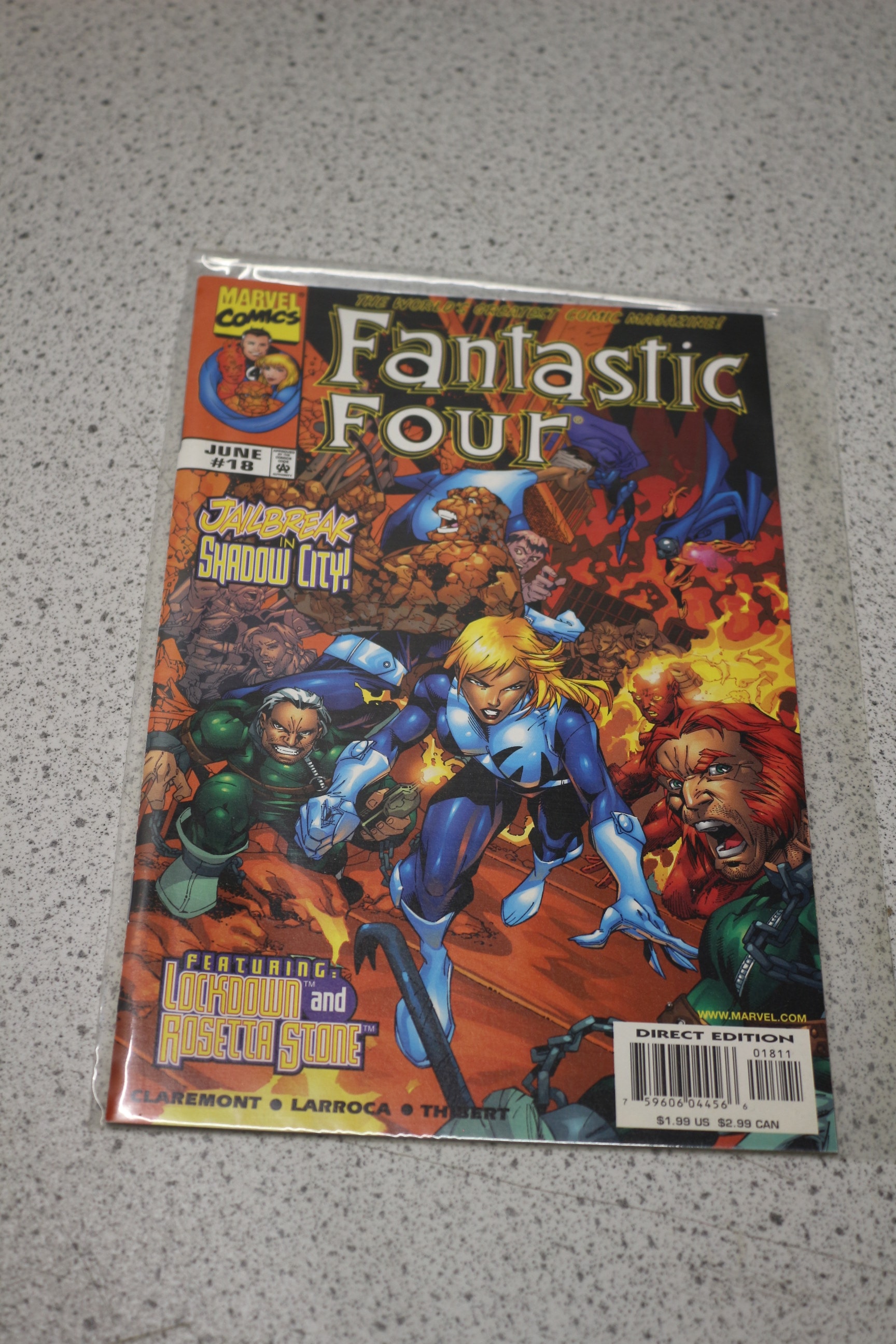 A multi-coloured Marvel Comics ‘Fantastic Four’ issue #18 comic book from June 1998, featuring ‘JAILBREAK IN SHADOW CITY!’ and creators CLAREMONT • LARROCA • THIBERT, with a ‘DIRECT EDITION’ label.