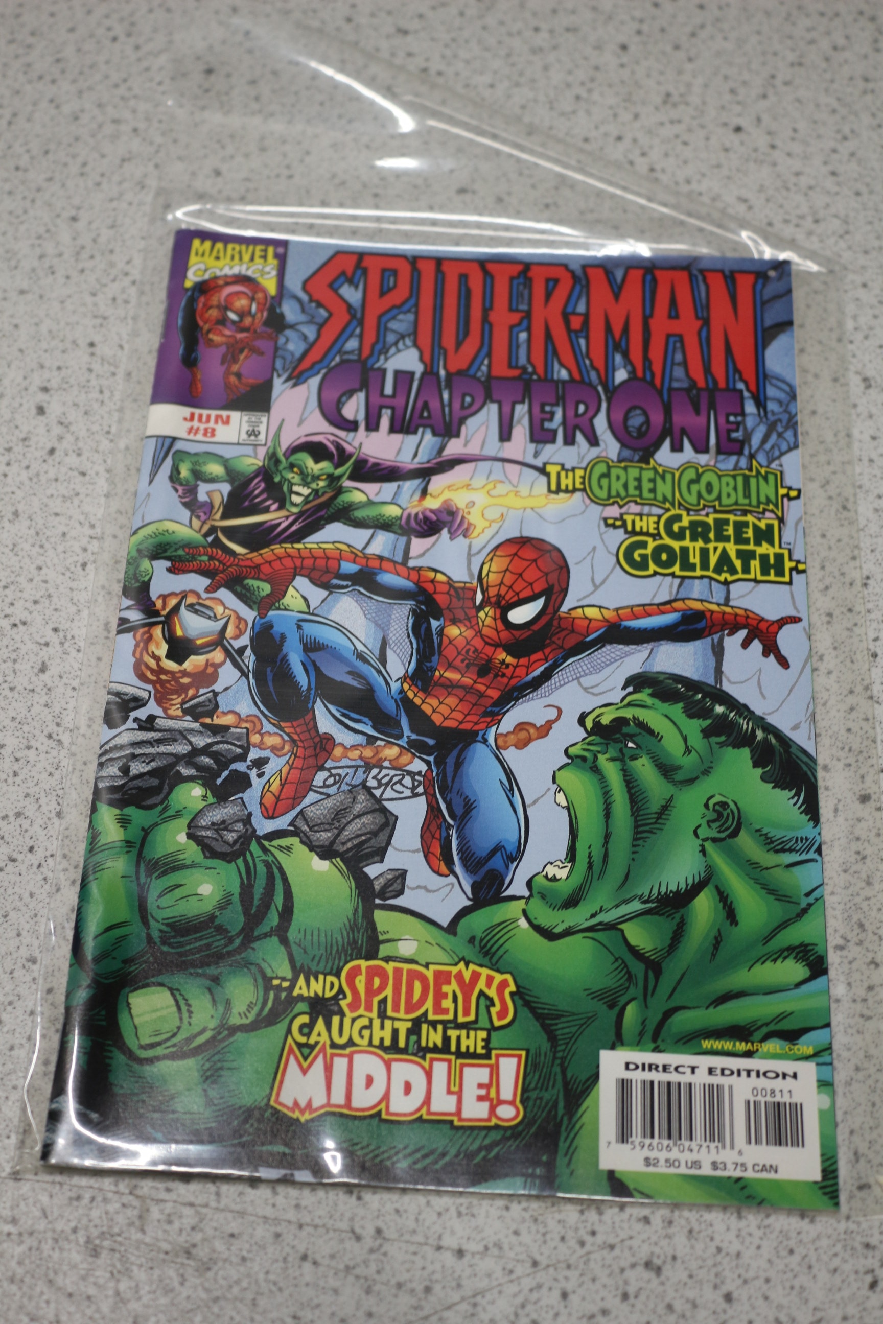 A single Marvel Comics “Spider-Man Chapter One” issue #8 comic book from June, featuring Spider-Man, Green Goblin, and Hulk, marked $2.50 US.