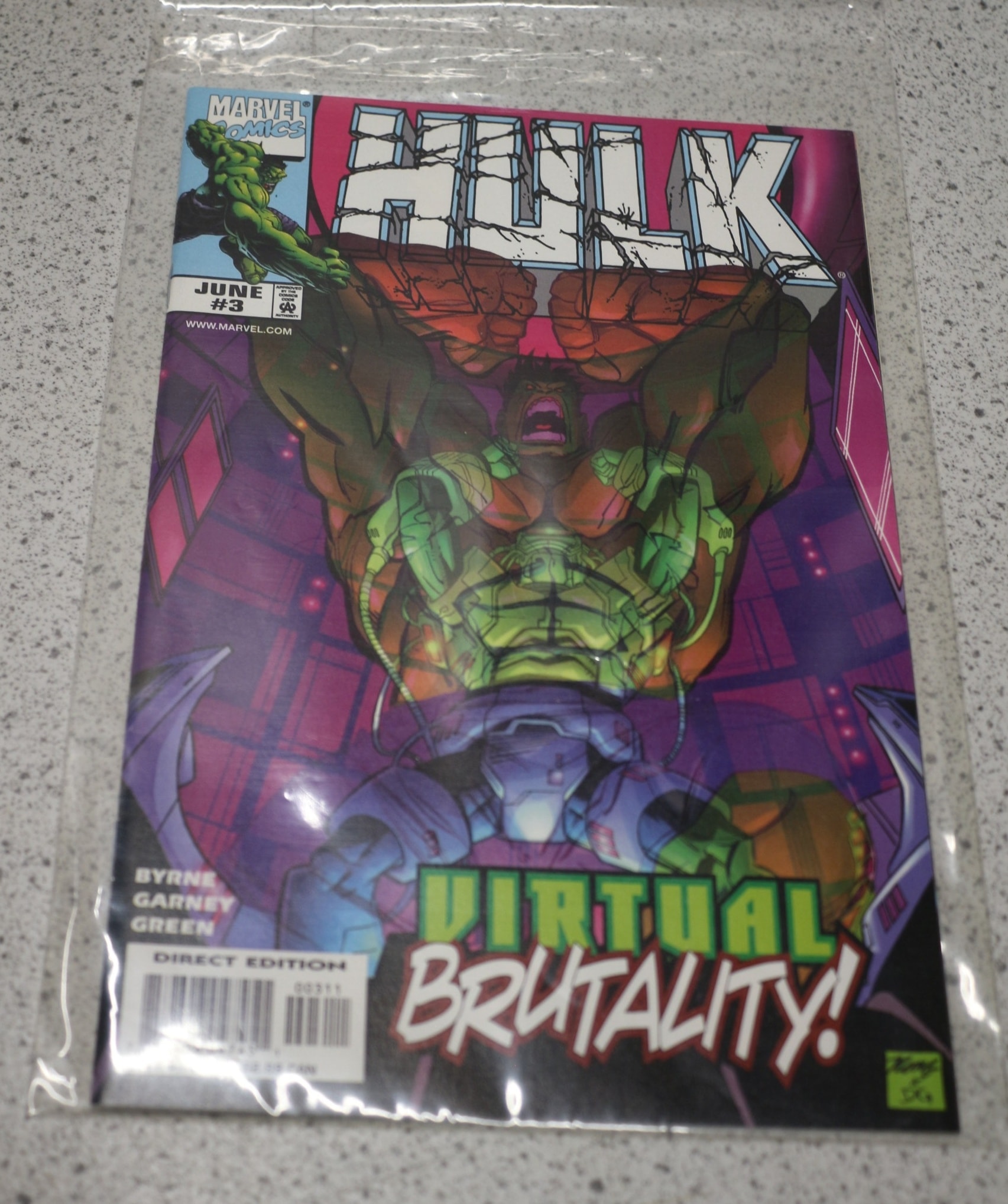 A green, purple, and blue Marvel Comics ‘Hulk’ comic book, issue #3 from June, featuring the story ‘Virtual Brutality!’ with credits ‘Byrne Garney Green’, an artist’s signature (Andy K.), ‘Direct Edition’ with code ‘00311’, and a visible price of $2.99 US.
