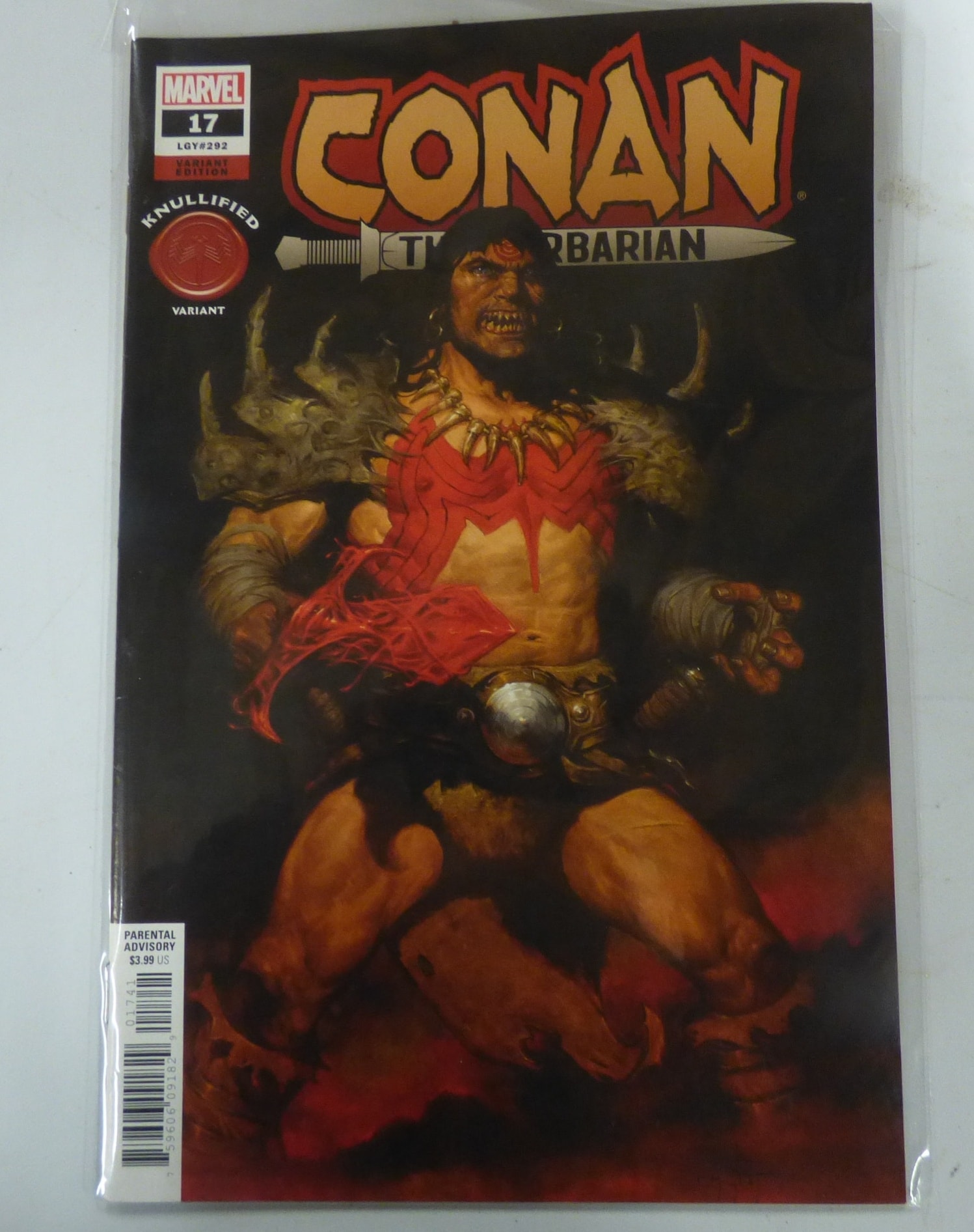 One dark-toned Marvel comic book, “Conan the Barbarian” issue #17, a “Knullified Variant Edition” with visible text “LGY#292,” “Parental Advisory, ” and a price of $3.99 US.
