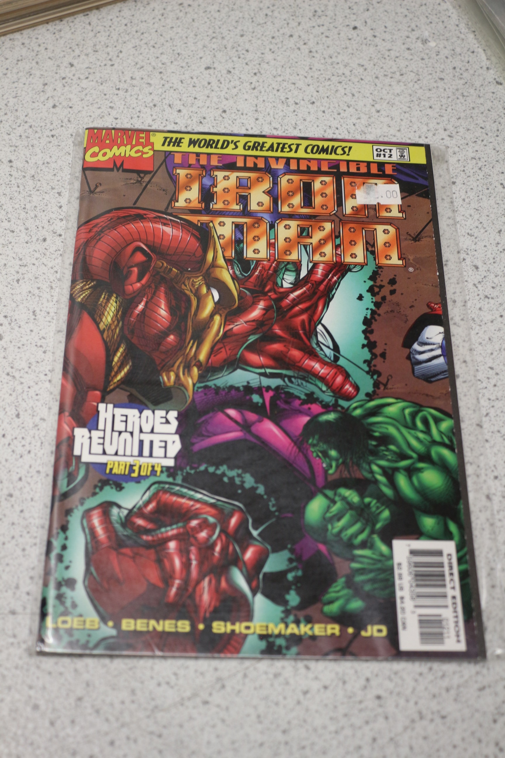 A Marvel Comics ‘The Invincible Iron Man’ Issue #12 comic book, featuring red and gold Iron Man and a green Hulk on the cover, with ‘HEROES REUNITED PART 3 OF 4’ inscription.