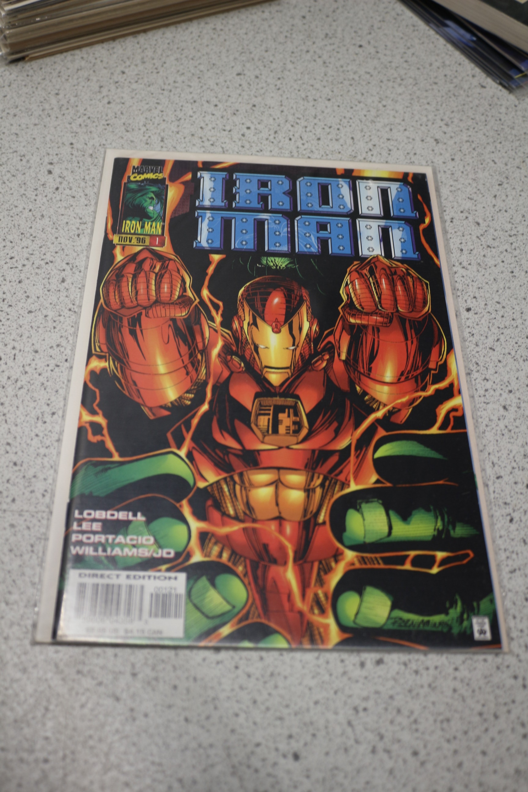 A Marvel Comics “Iron Man” issue #1 from November ’96, featuring a red and orange Iron Man suit, green Hulk hands, a blue title, and marked “DIRECT EDITION” with a price of US $1.95.