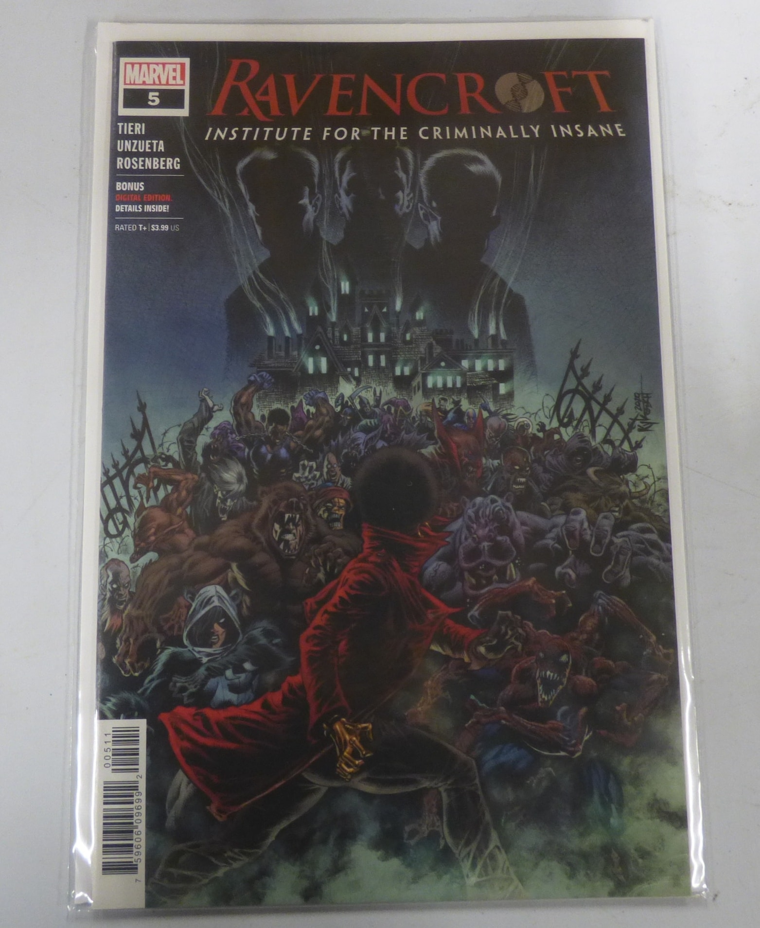 A Marvel comic book, ‘Ravencroft Institute for the Criminally Insane’ issue #5, primarily dark blue, green, and red, marked RATED T+ with a $3.99 US price.