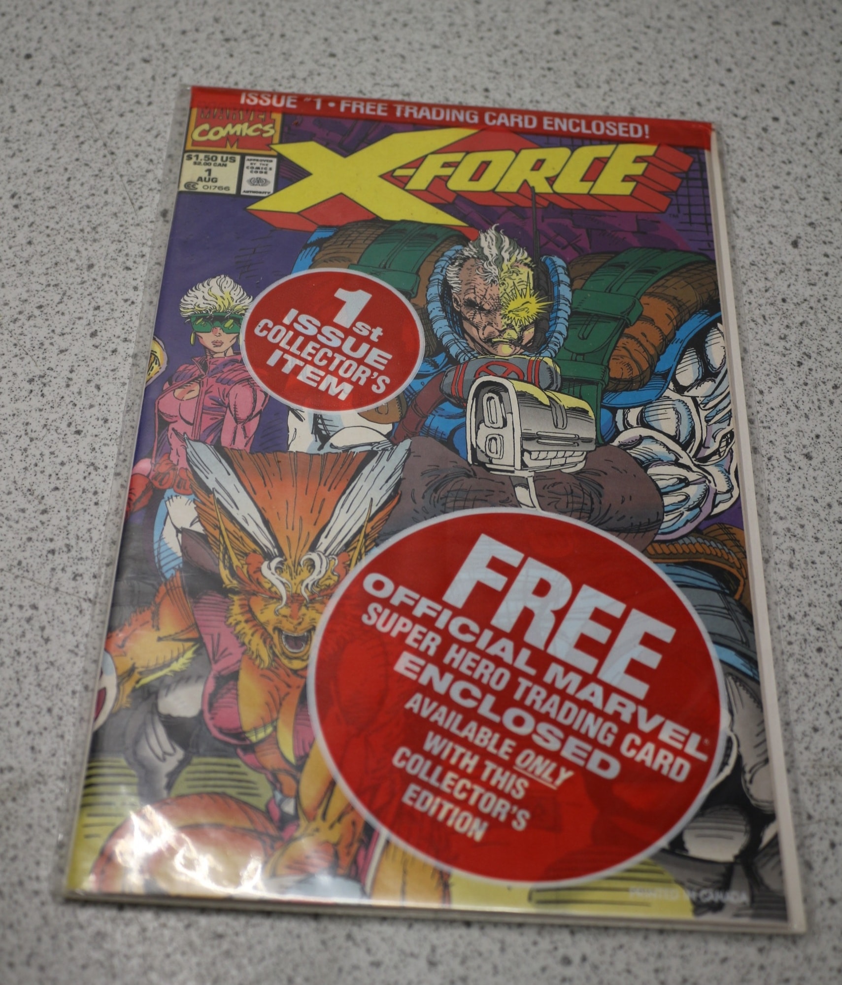 A multi-coloured Marvel Comics X-FORCE comic book, Issue #1 from August, includes a free official Marvel Super Hero trading card, marked $1.50 US / $2.00 CAN.