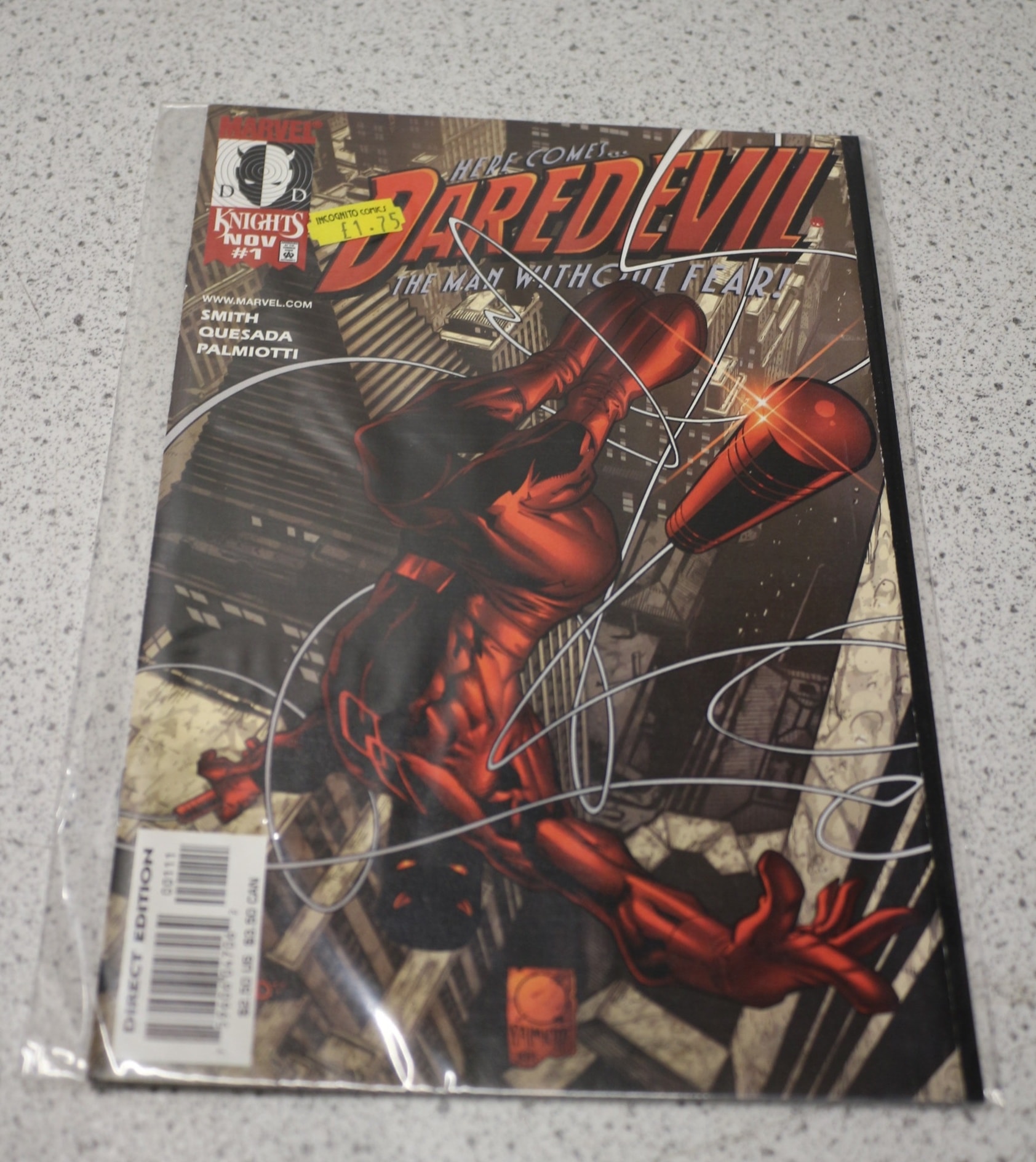 A Marvel Knights comic book titled ‘DAREDEVIL THE MAN WITHOUT FEAR!’, issue #1 (November), featuring a red, black, and tan colour scheme and creators Smith, Quesada, Palmiotti.
