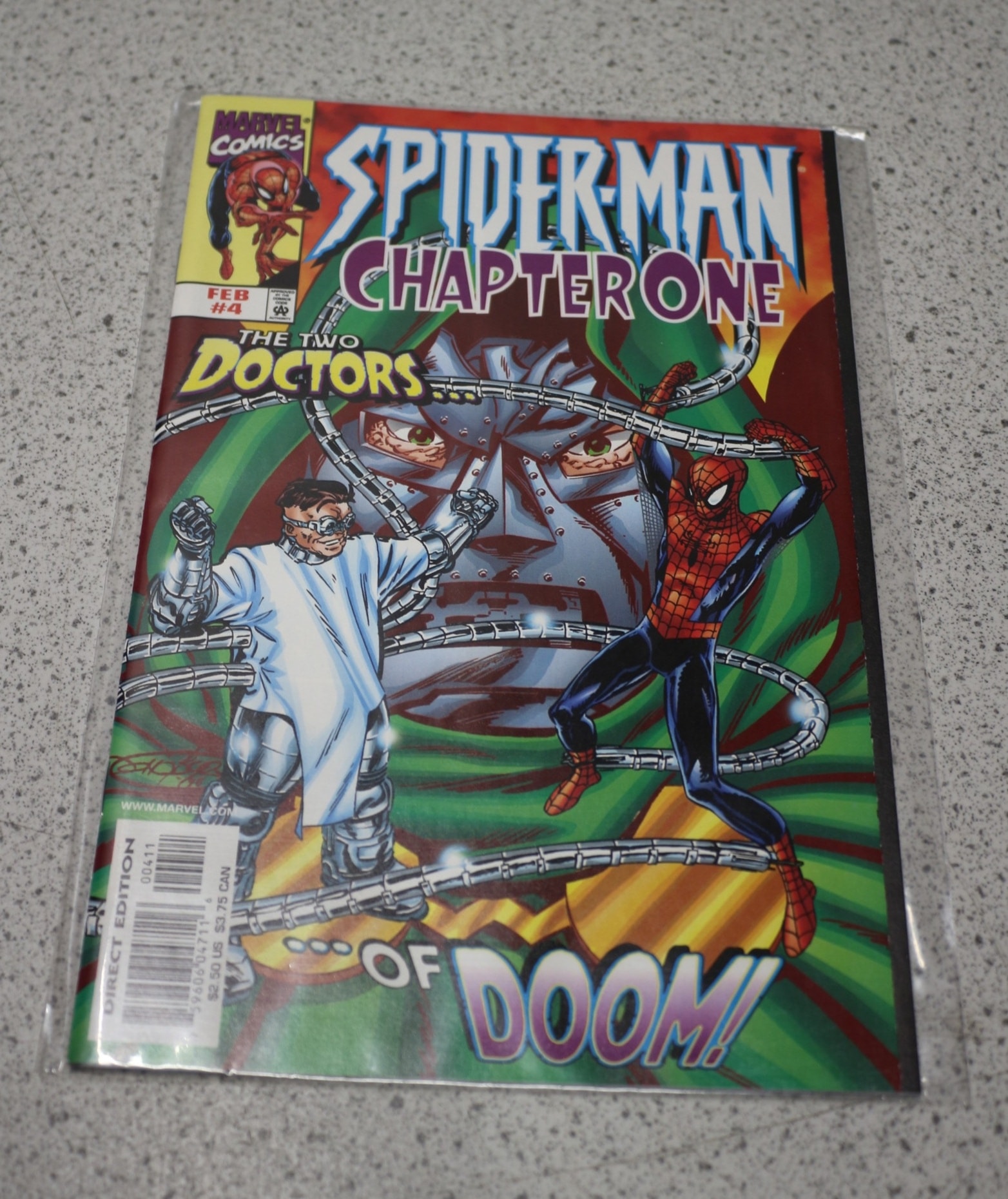 A multi-coloured comic book, predominantly red, blue, green, yellow, and black, titled “SPIDER-MAN CHAPTER ONE THE TWO DOCTORS OF DOOM!”, a “Marvel Comics” publication marked “FEB #4” and “DIRECT EDITION”, priced at “$2.50 US” and “$3.75 CAN”.