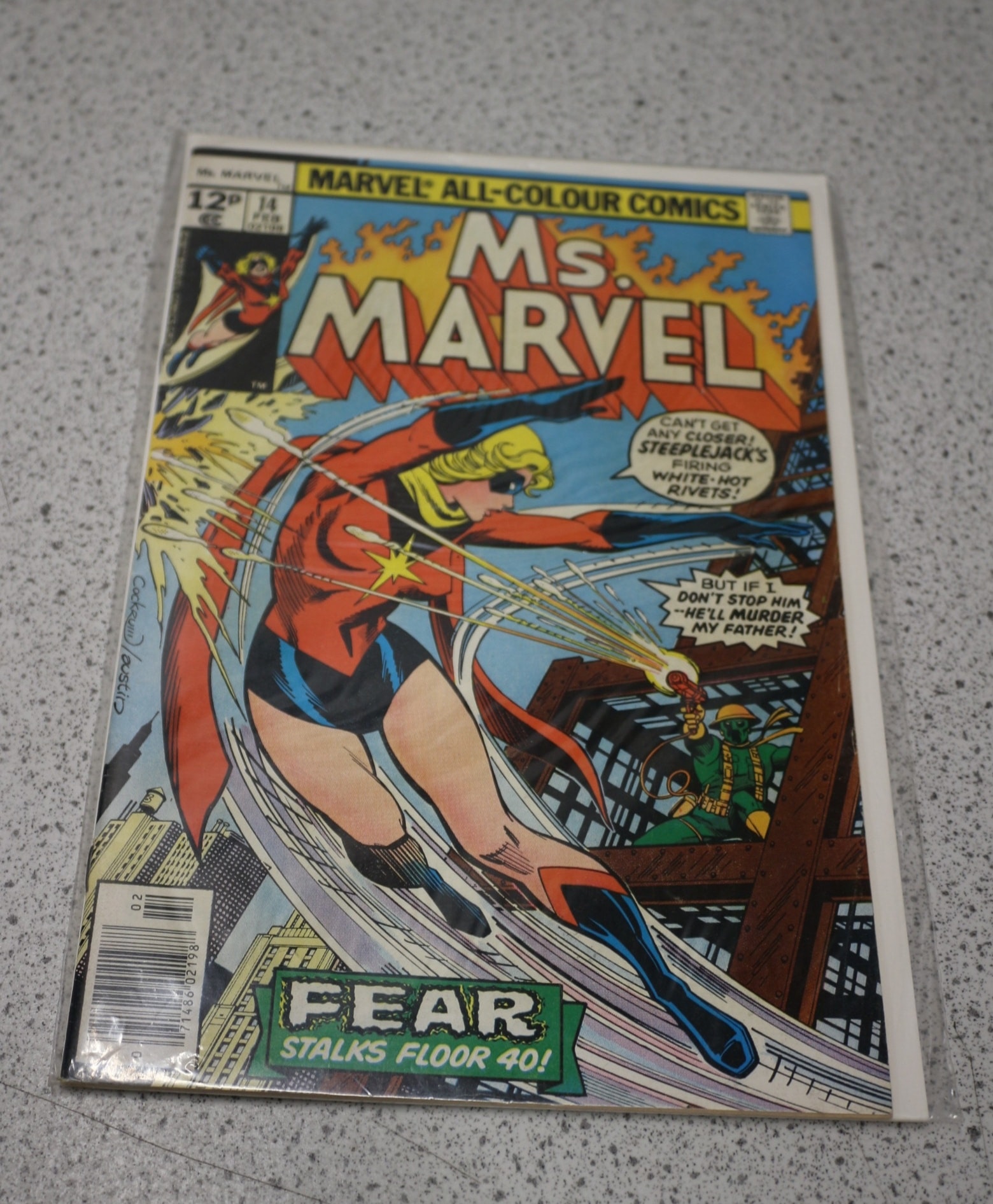 One Ms. Marvel comic book, Issue #14, February, in red, blue, yellow, and white, featuring Ms. Marvel in action, with visible text ‘MARVEL ALL-COLOUR COMICS’, ’12P’, and ‘FEAR STALKS FLOOR 40!’, credited to Cockrum / Giusto.