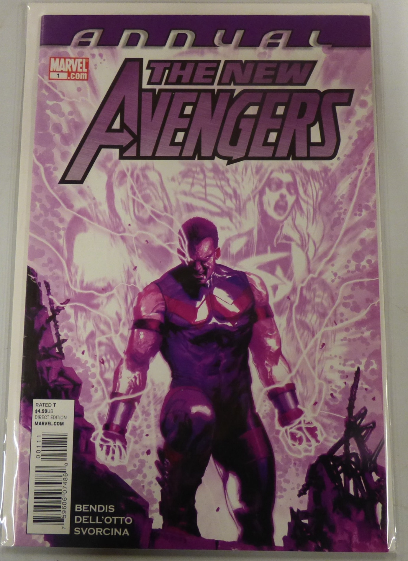 A Marvel ‘ANNUAL THE NEW AVENGERS’ comic book, predominantly purple and white, featuring a purple-clad character, with labels ‘RATED T’, ‘DIRECT EDITION’, ‘MARVEL.COM’, ‘BENDIS’, ‘DELL’OTTO’, ‘SVORCINA’, and priced at $4.99US.