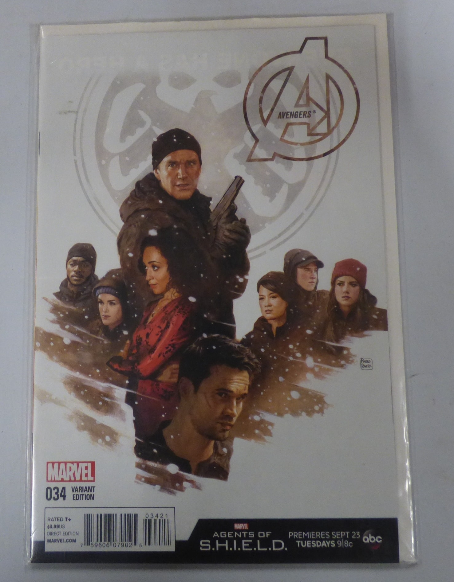 A white and multi-coloured Marvel ‘Avengers’ comic book, issue 034 Variant Edition, features a cover with ‘Agents of S.H.I.E.L.D.’ characters in a snowy setting, signed ‘Paolo Rivera’, and displays text including ‘AVENGERS®’, ‘MARVEL’, ‘RATED T+’, ‘DIRECT EDITION’, ‘MARVEL.COM’, ‘AGENTS OF S.H.I.E.L.D.’, ‘PREMIERES SEPT 23 TUESDAYS 9|8c’, ‘abc’, and is priced at $3.99US.
