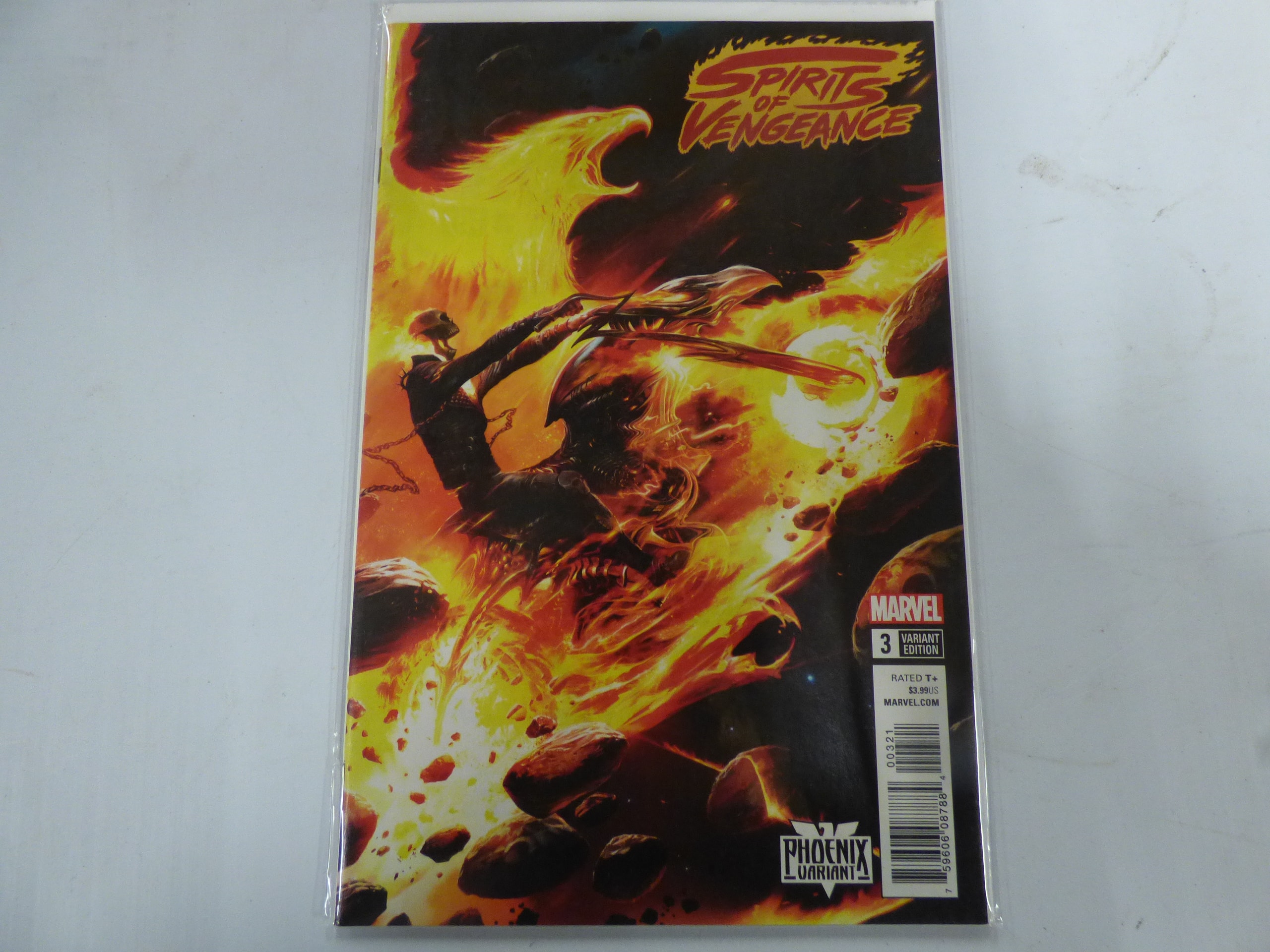 A single comic book, titled ‘Spirits of Vengeance #3 Variant Edition’ by Marvel, featuring a Ghost Rider-like figure and a phoenix in fiery red, orange, and yellow colors, marked ‘Rated T+’ and ‘$3.99US’ with a ‘Phoenix Variant’ logo.