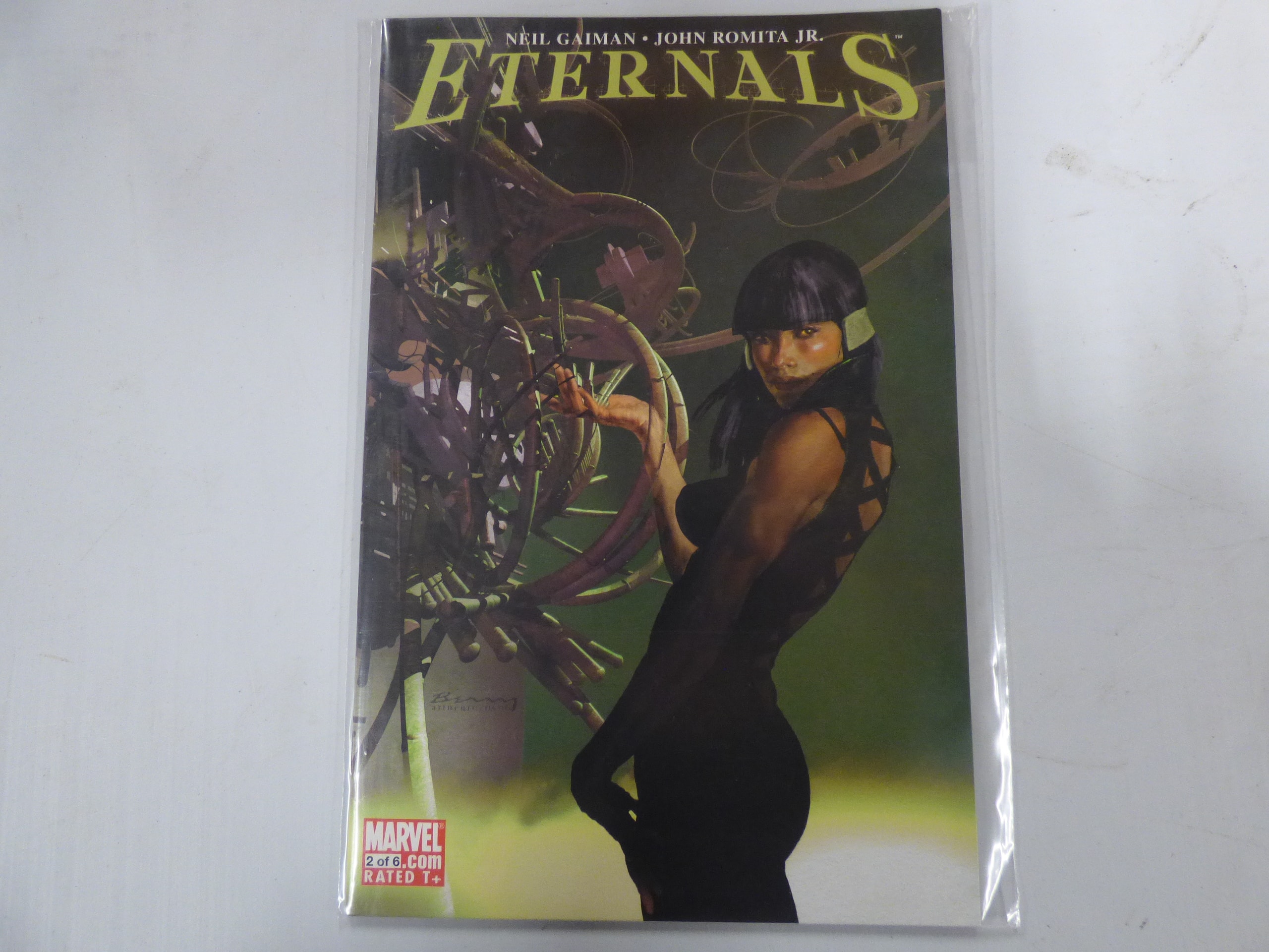 One dark green and black Marvel Eternals comic book, issue 2 of 6, by Neil Gaiman and John Romita Jr., rated T+, with a visible Jae Lee signature.