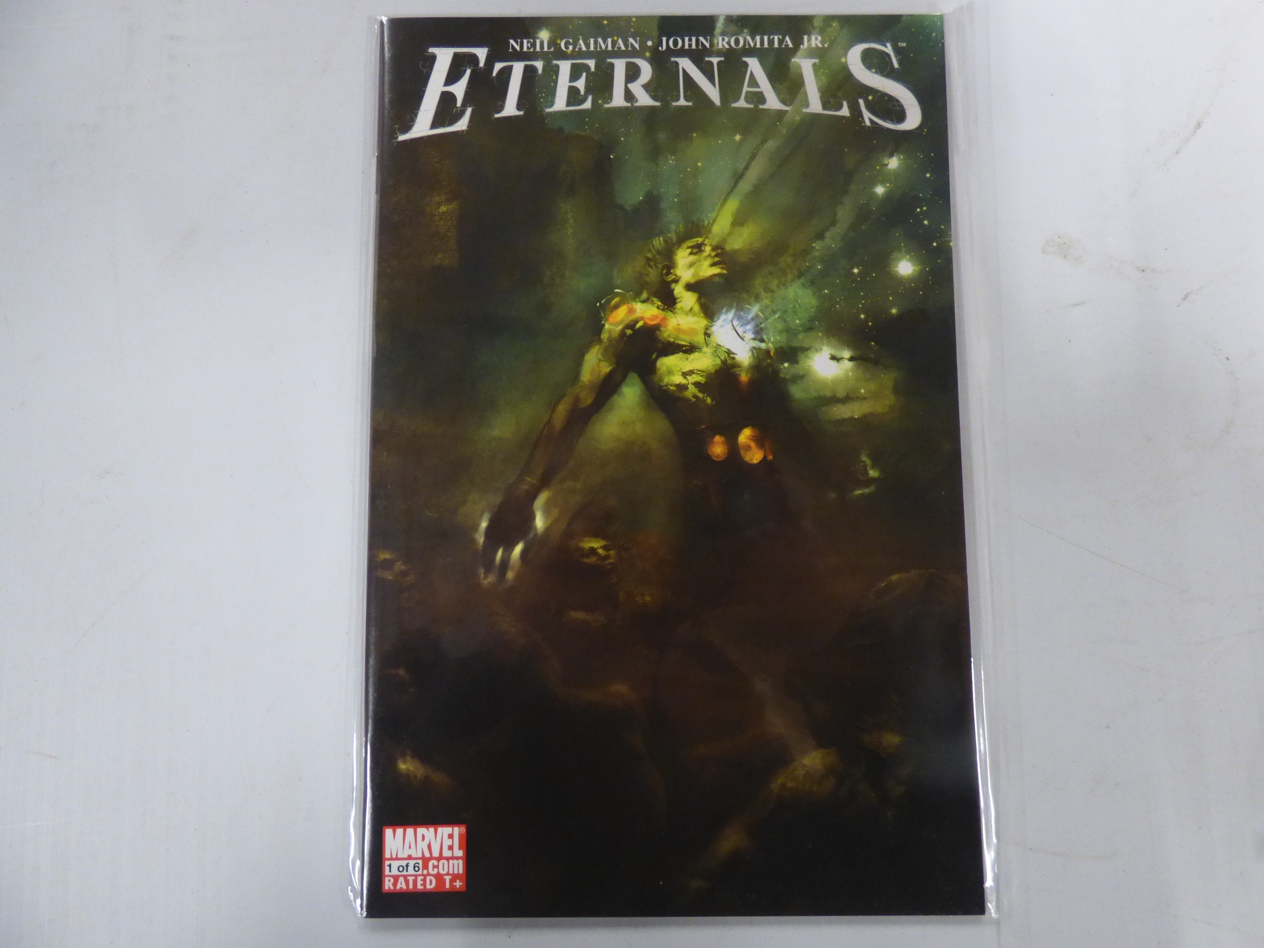 A single comic book titled “ETERNALS” by Neil Gaiman and John Romita Jr., featuring a dark green and black cover with yellow and bright accents, and “MARVEL”, “1 of 6.COM”, and “RATED T+” text on the bottom left.