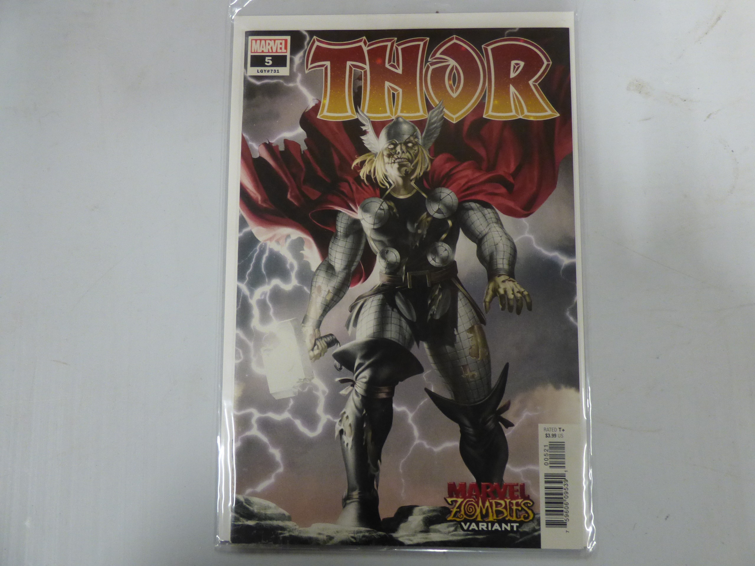 A single MARVEL THOR issue 5 comic book, featuring a Marvel Zombies variant cover depicting a zombie-like Thor in silver armour and red cape, marked LGY#731, RATED T+, and priced at $3.99 US.