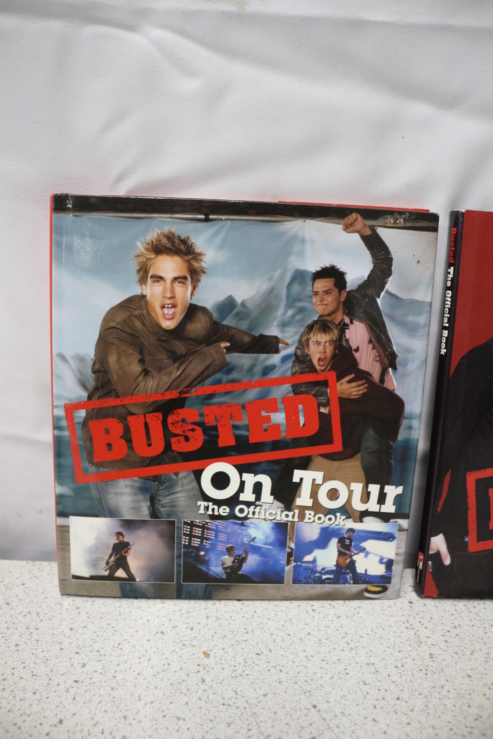 Two softcover Busted band books, ‘On Tour The Official Book’ (light blue/brown, ISBN 0-7535-0739-X) and ‘Official Book’ (red/black, ISBN 0-7535-0818-3), both published by Virgin books.