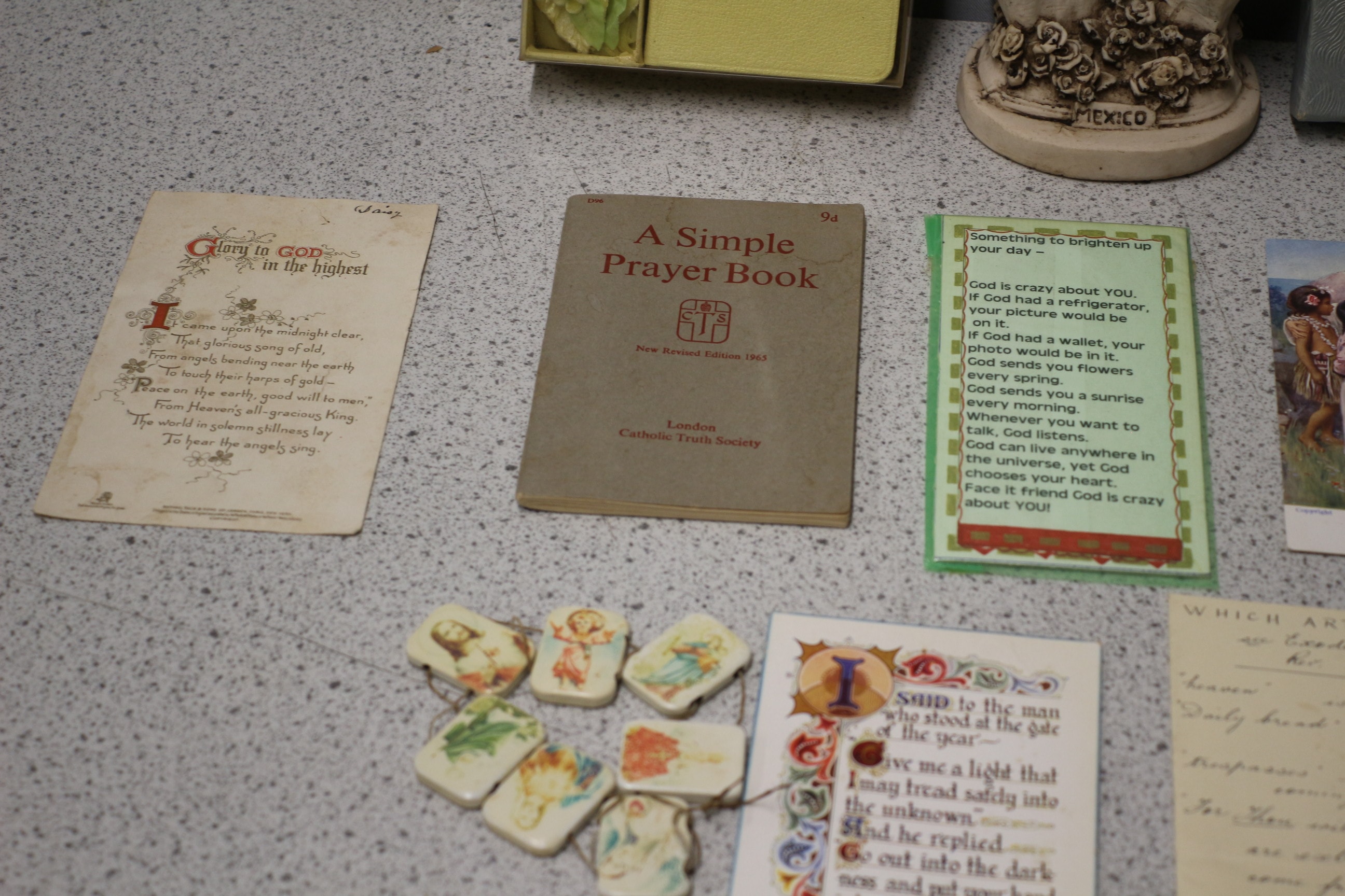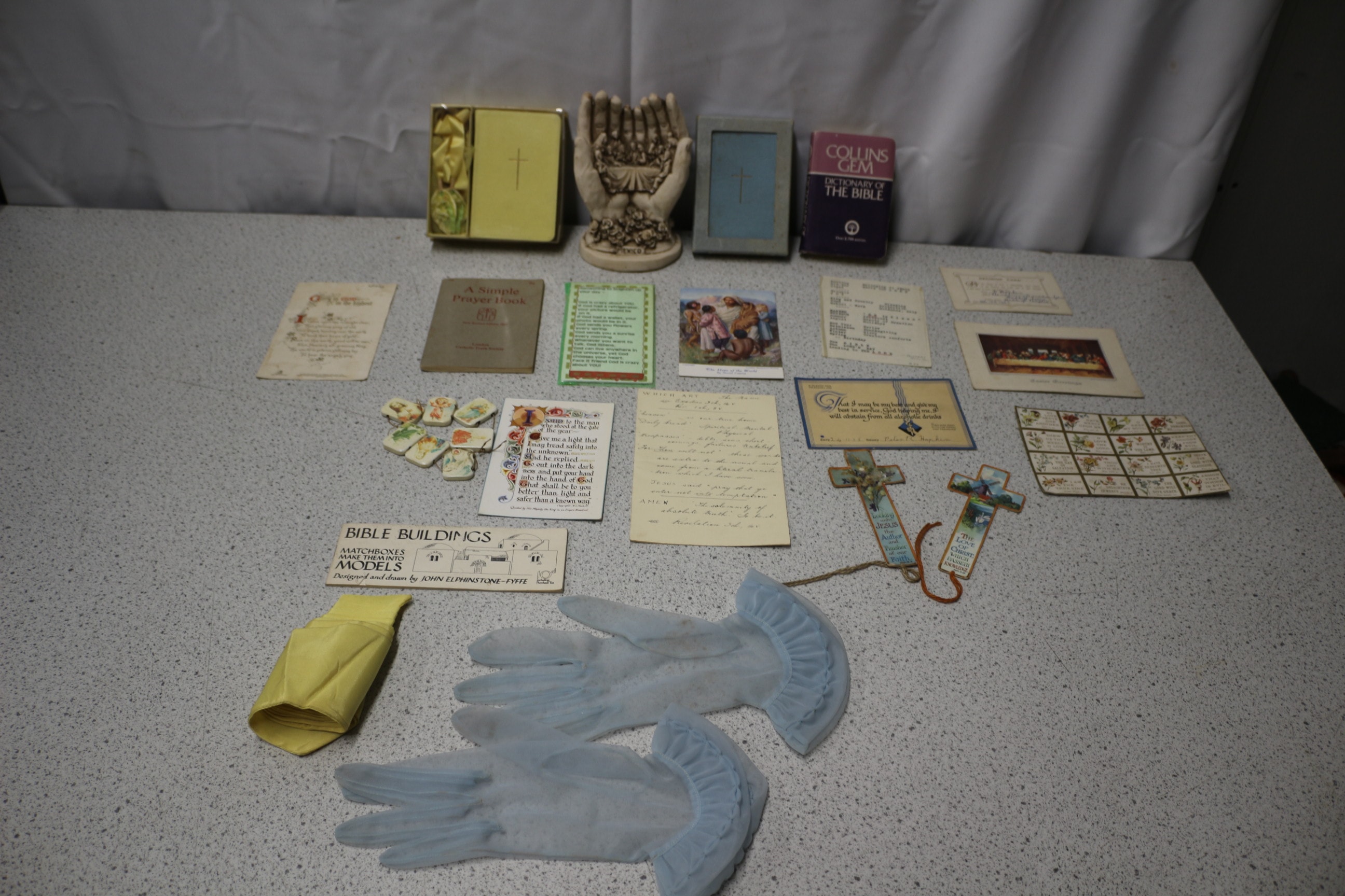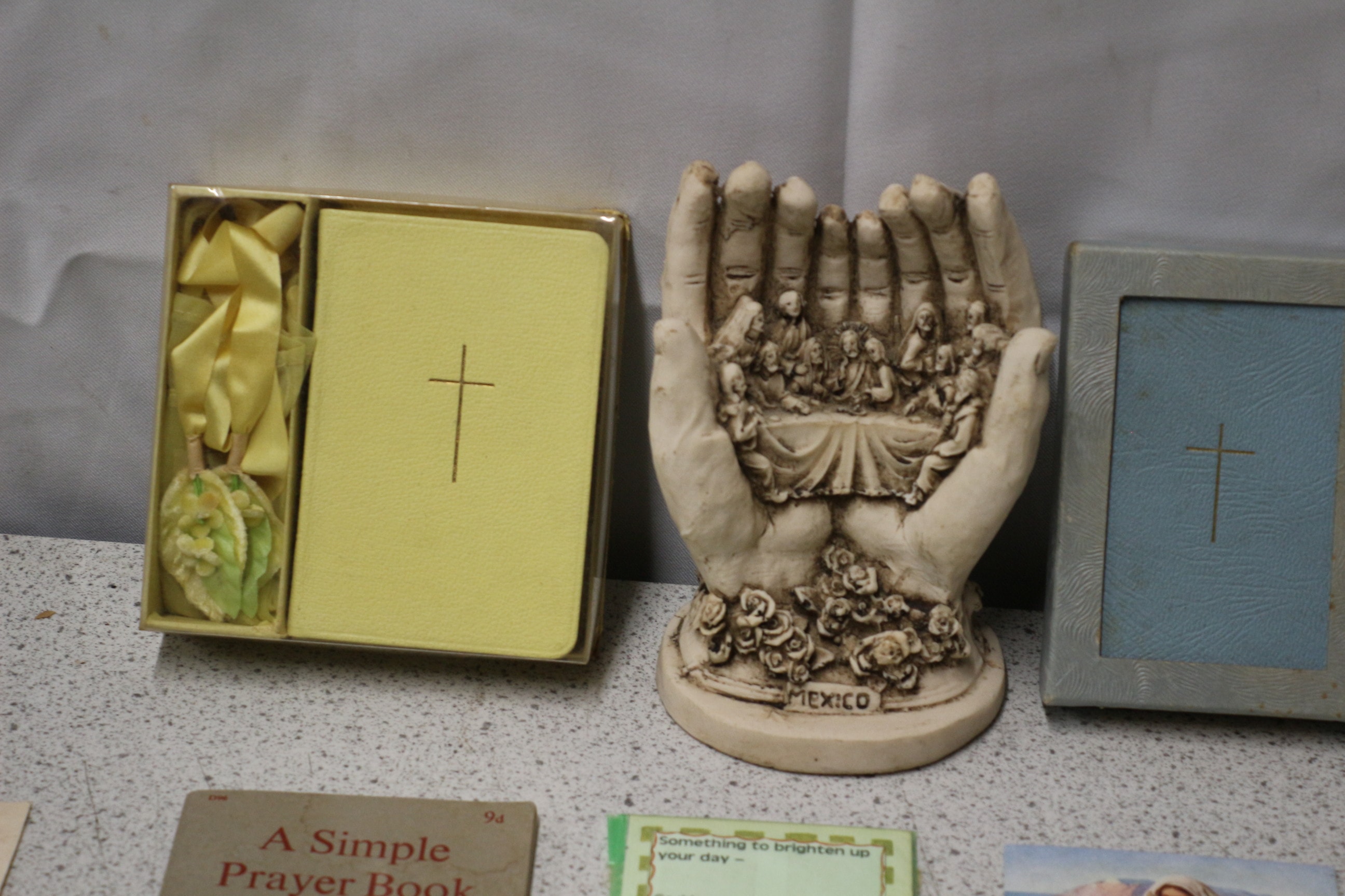 A collection of vintage religious items including “A Simple Prayer Book” (1963), “Collins Gem Dictionary of the Bible”, a “MEXICO” marked sculpture, various holy cards, pictures, and a pair of gloves.