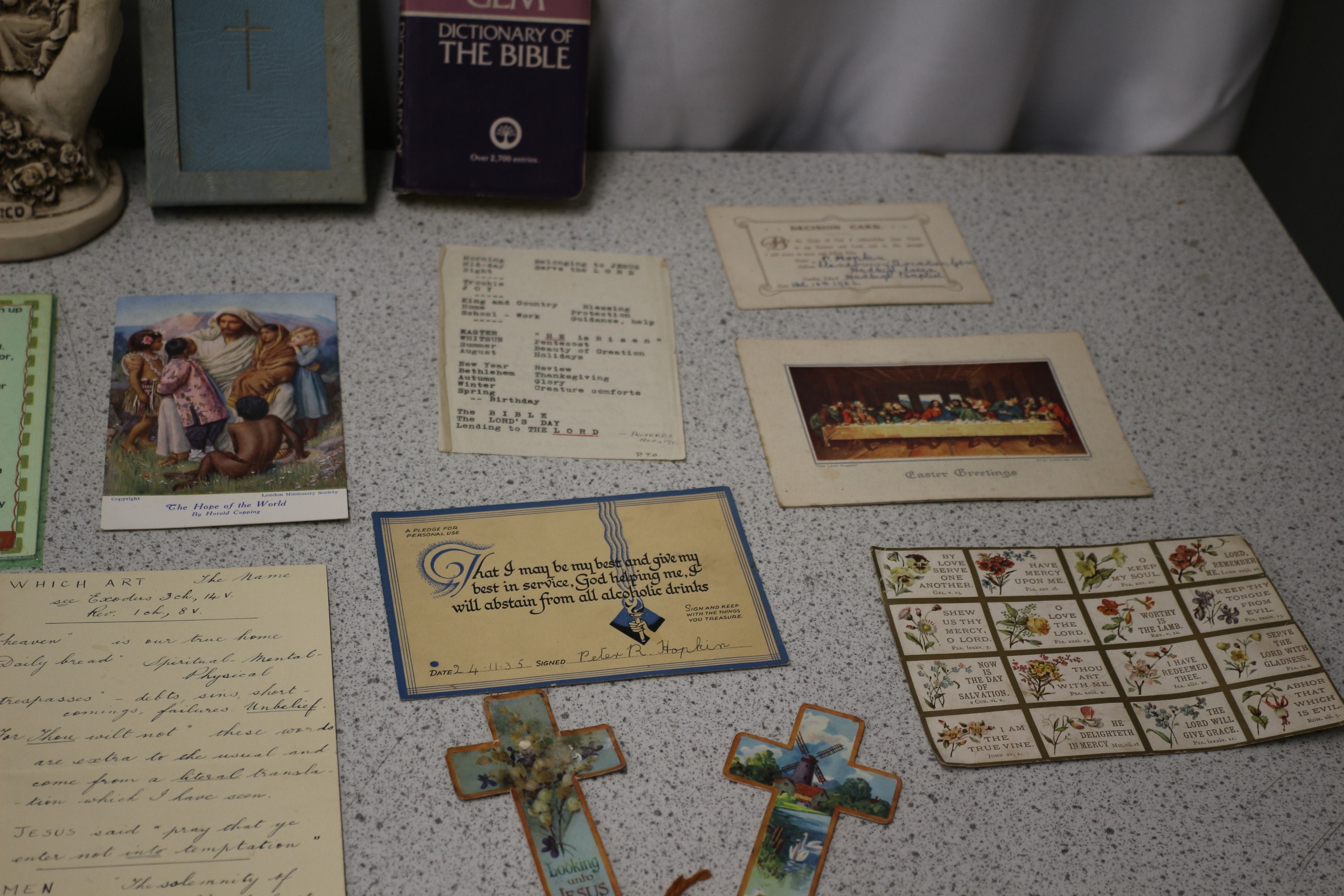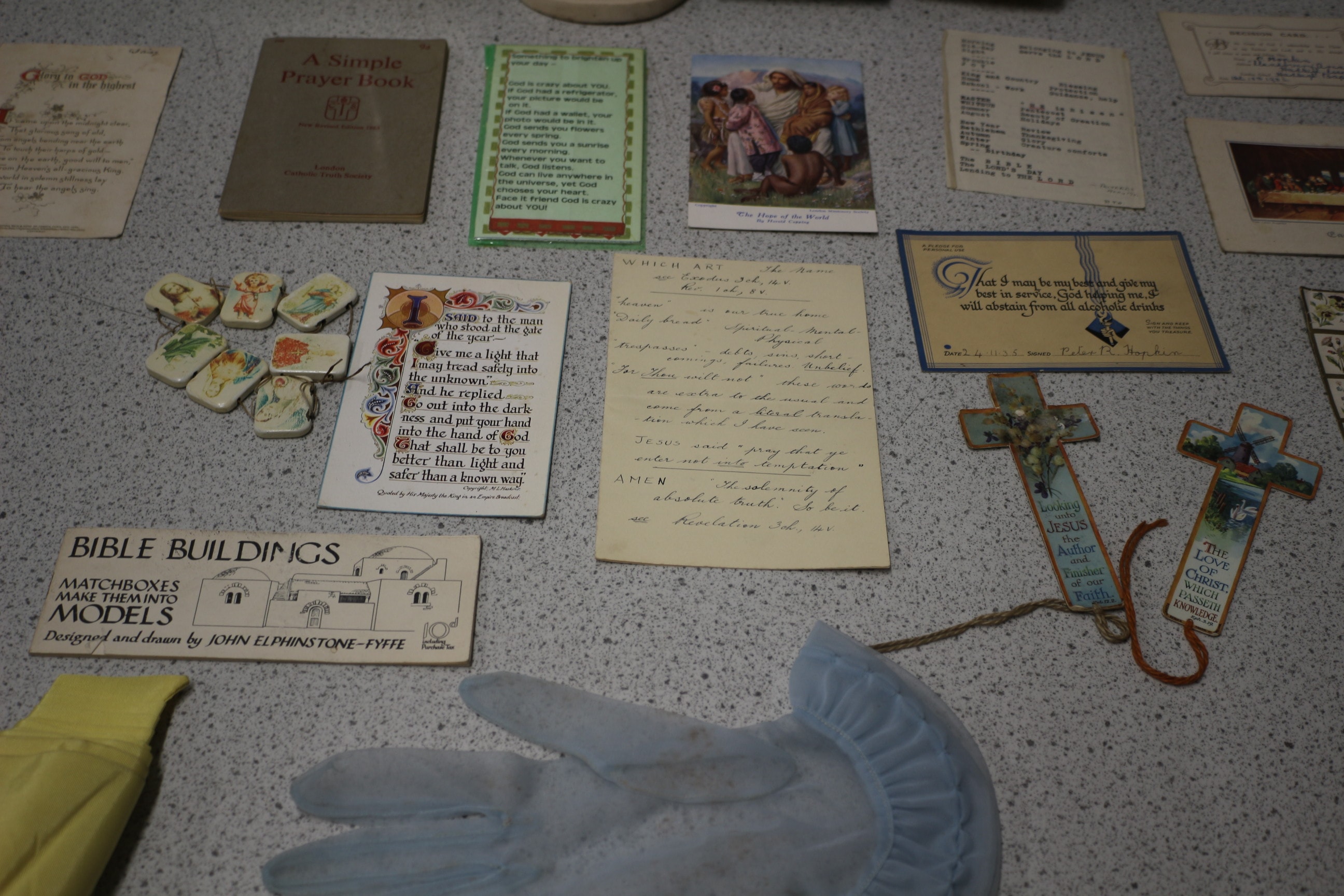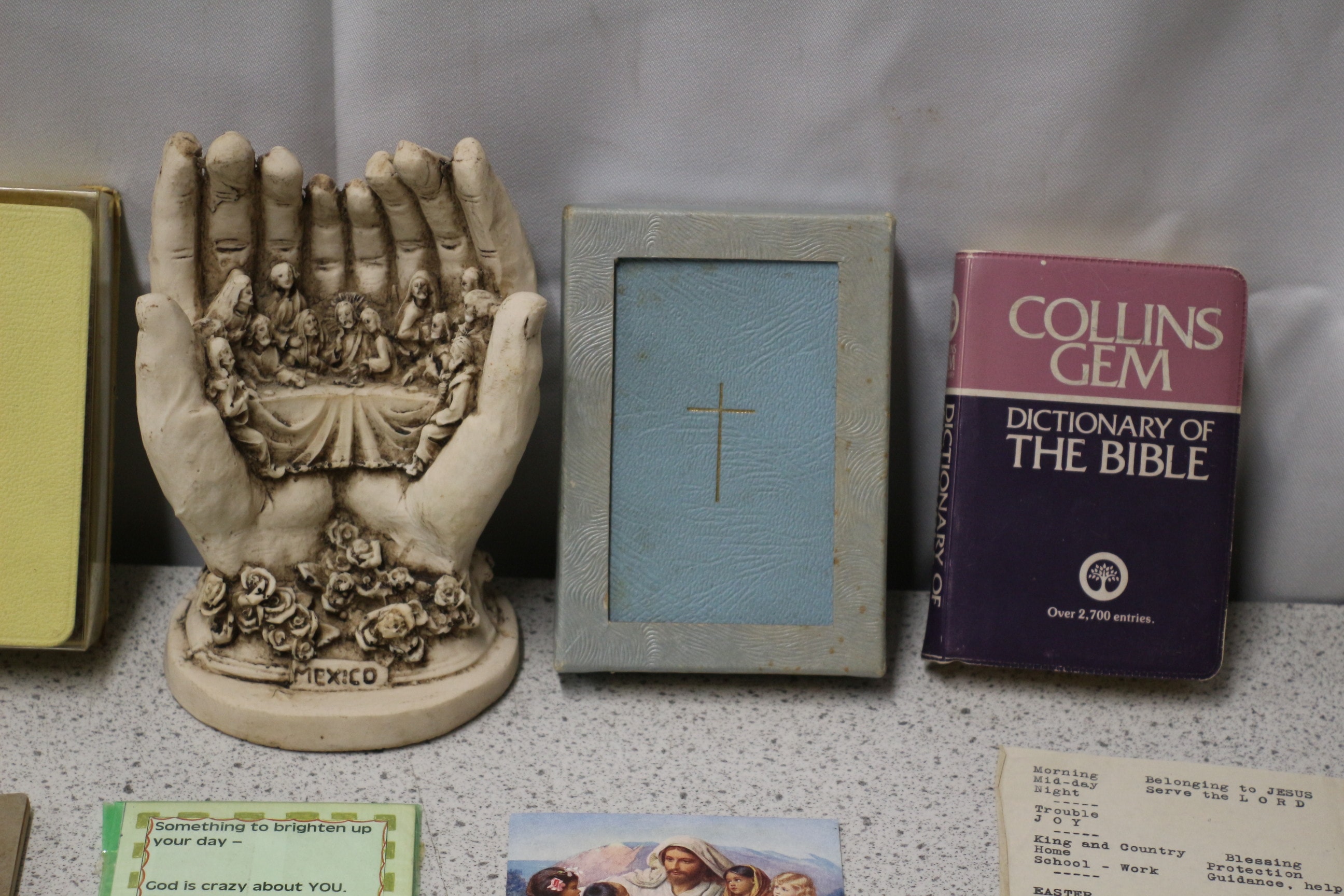 A collection of vintage religious items including “A Simple Prayer Book” (1963), “Collins Gem Dictionary of the Bible”, a “MEXICO” marked sculpture, various holy cards, pictures, and a pair of gloves.