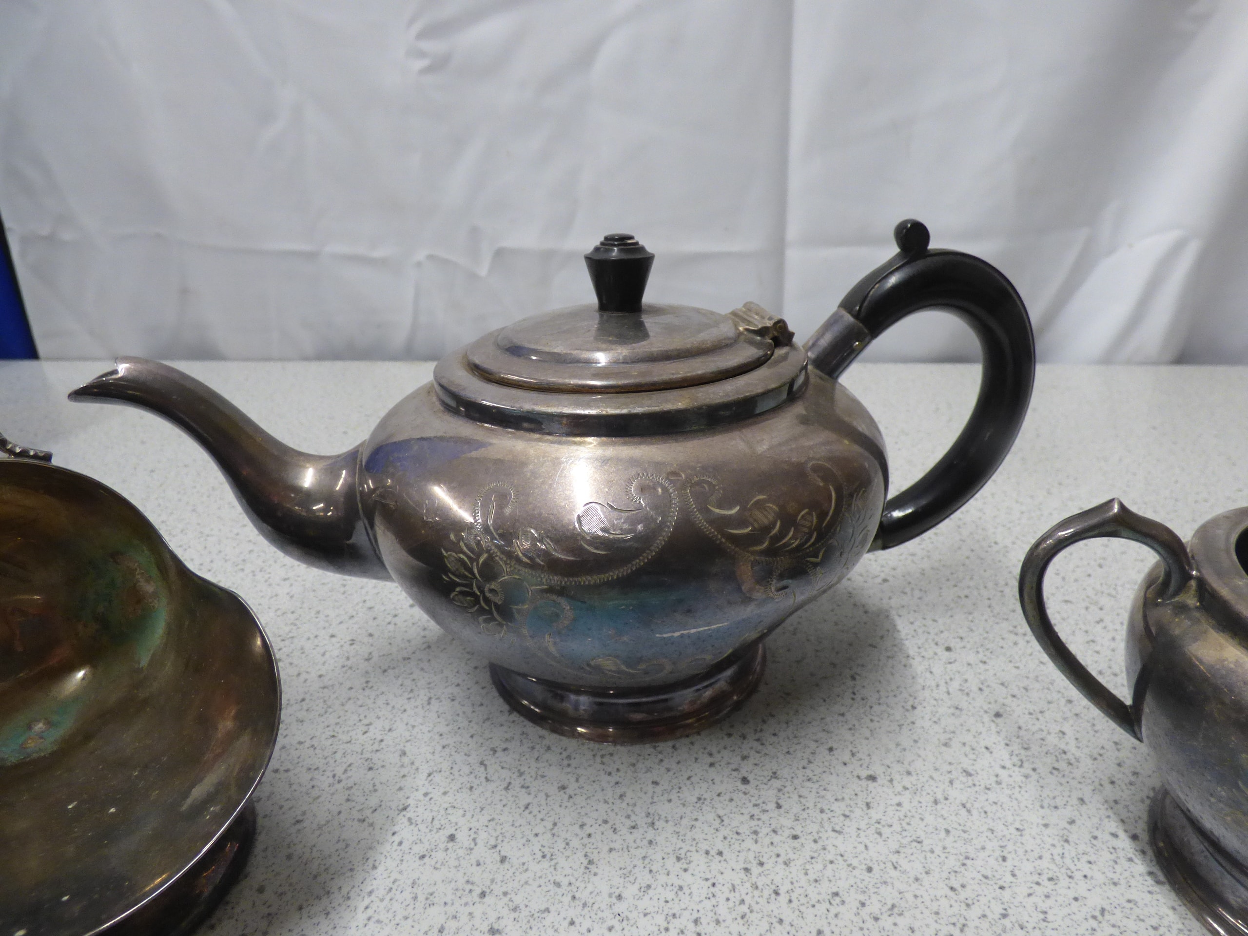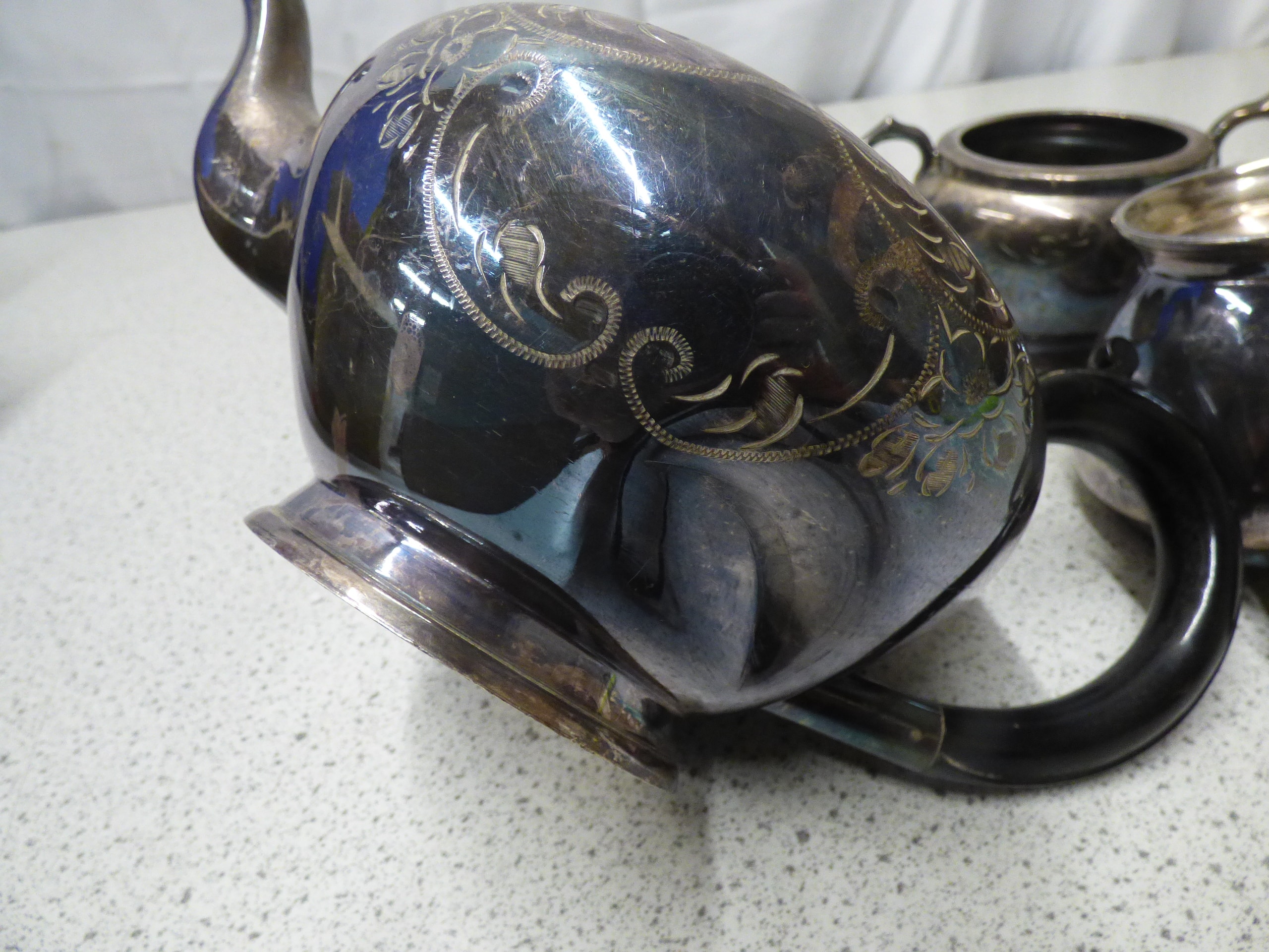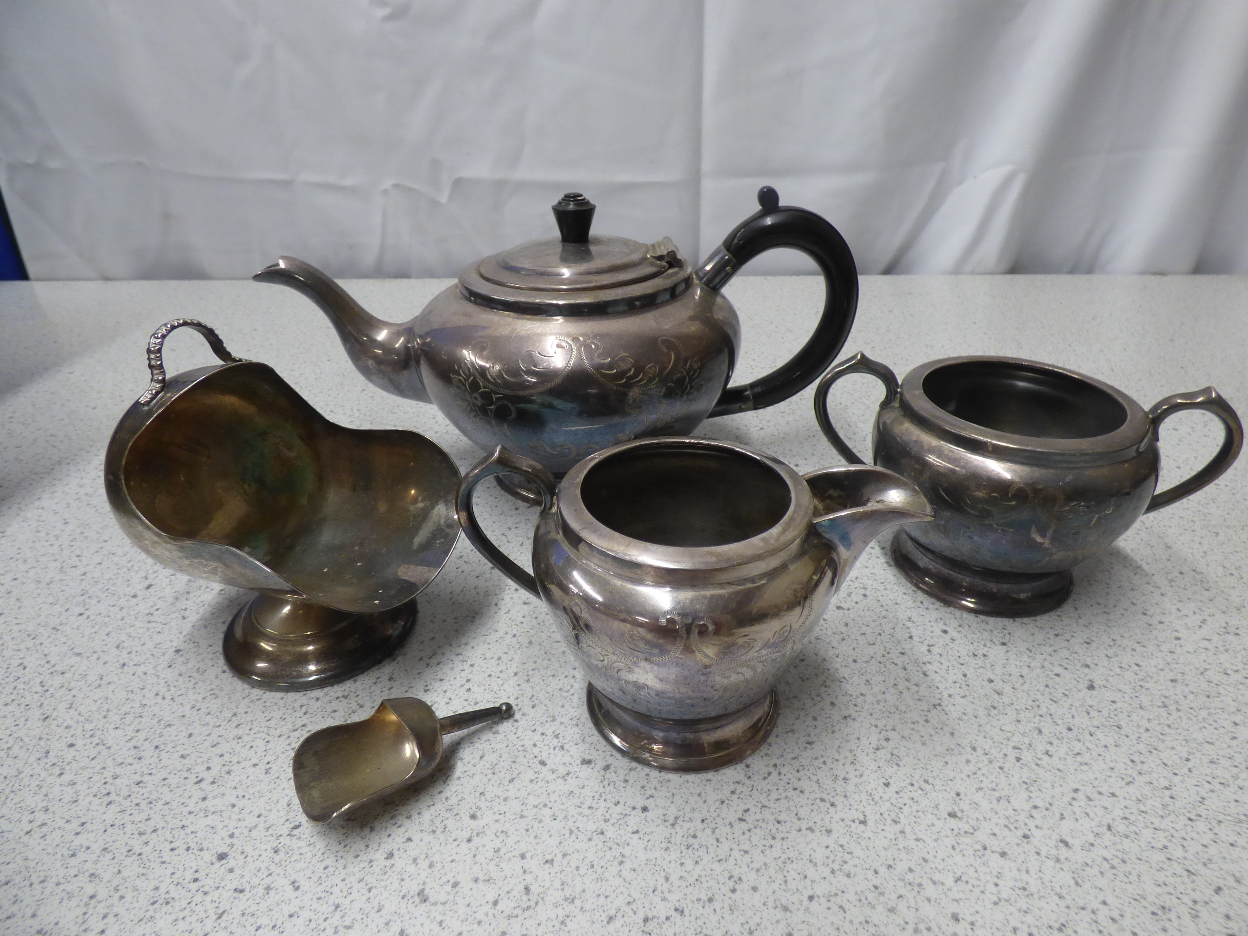 A five-piece silver-coloured tea set, comprising a teapot with black accents, a sugar scuttle, a lidded sugar bowl, a creamer, and a small scoop, with the creamer and sugar bowl bottoms marked “E.P.B.M SHEFFIELD” and the sugar bowl additionally marked “ITALIAN 710”.