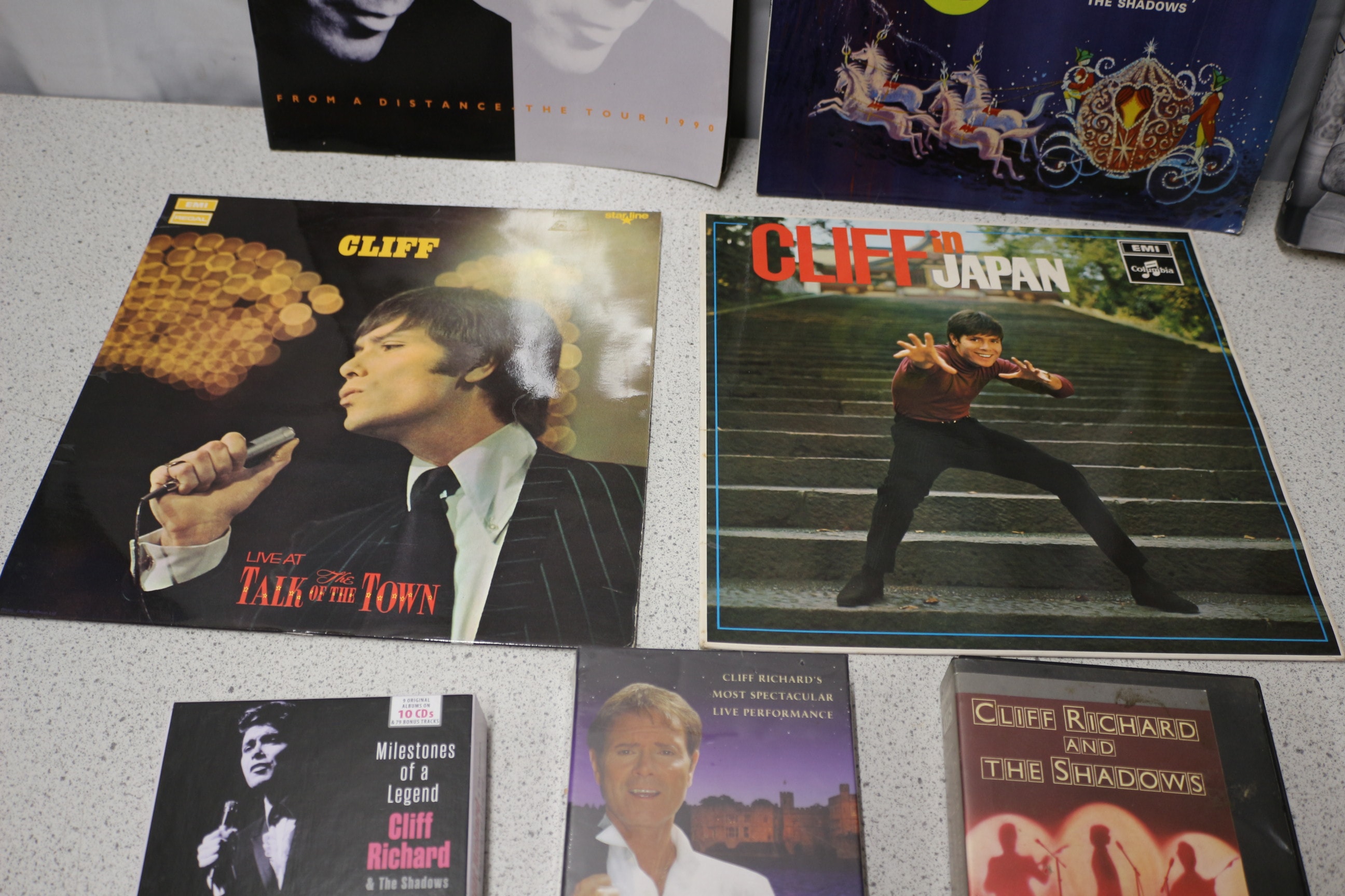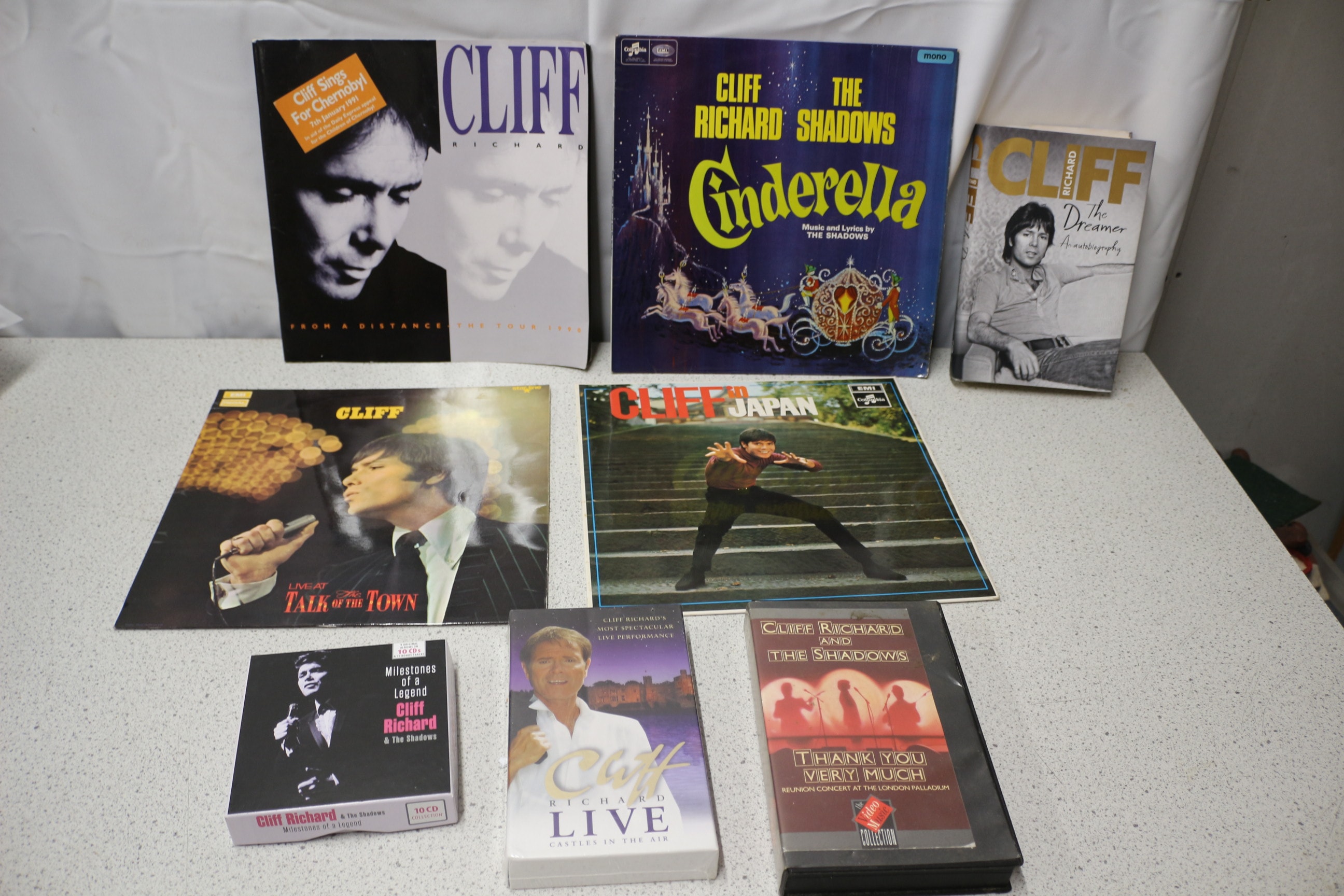 A collection of Cliff Richard vinyl albums, CD box set, book, and videos, including ‘Cliff In Japan’ and ‘Cinderella’.