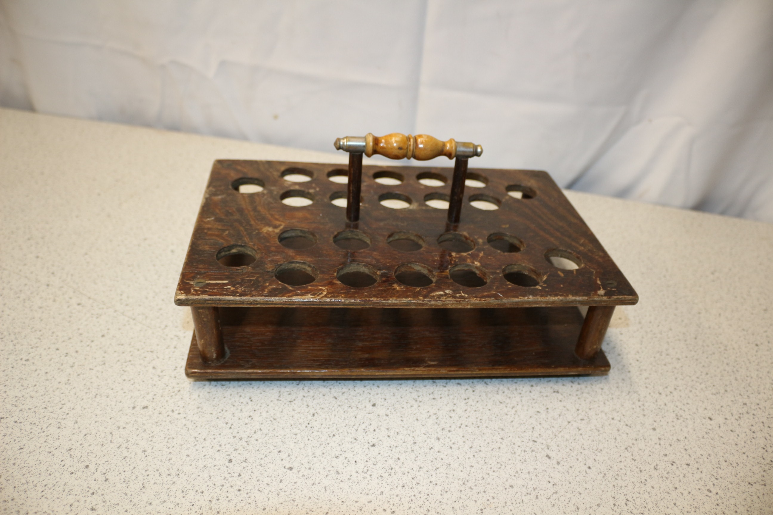 A vintage dark brown wooden communion tray or test tube rack with a light brown wooden handle with silver ends, showing no visible labels or markings. 28×18.5cm, 14cm tall