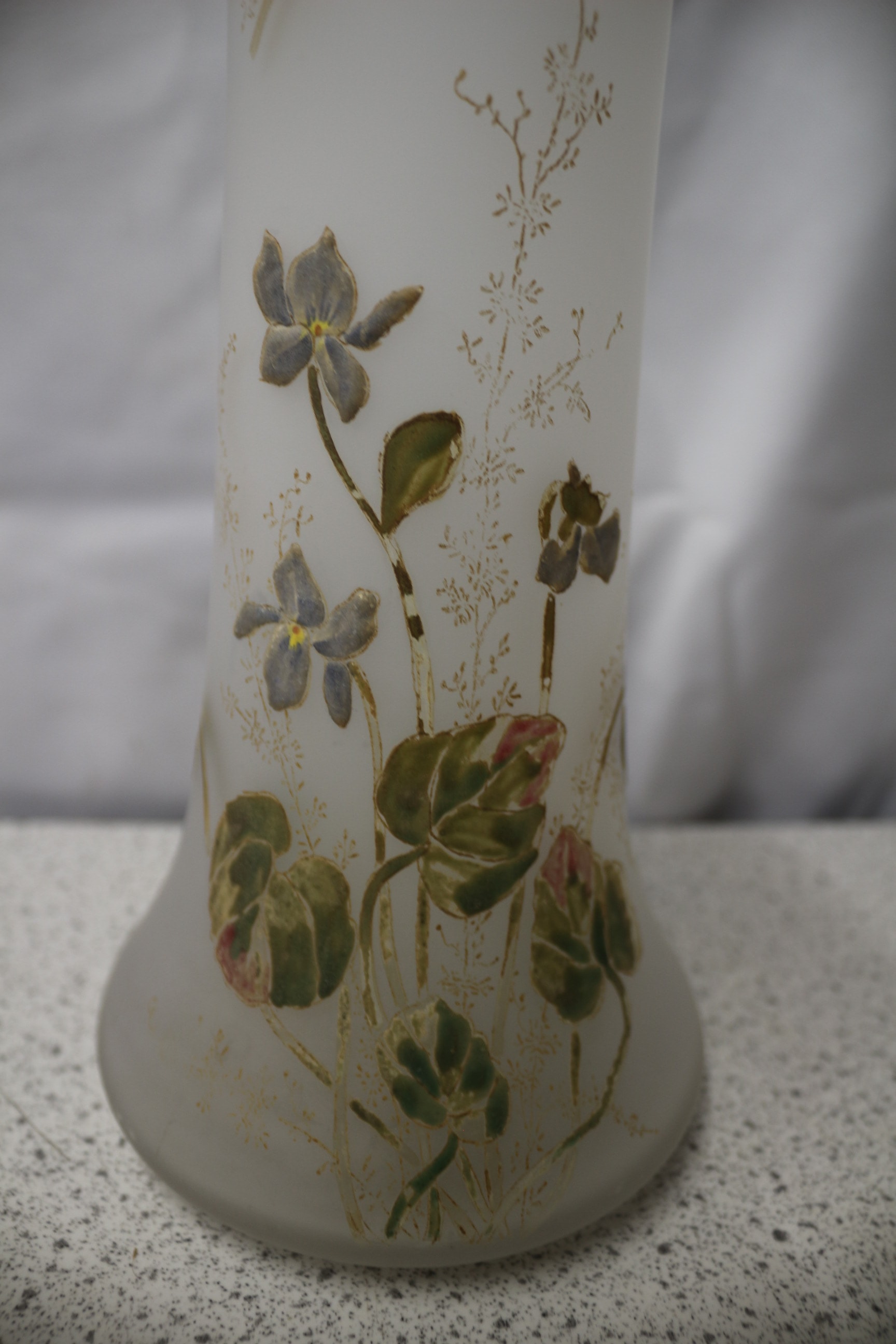 A satin glass Legras Art Nouveau white vase features purple-grey, green, pinkish-brown, and gold floral decoration, with no visible labels or inscriptions. 25cm tall
