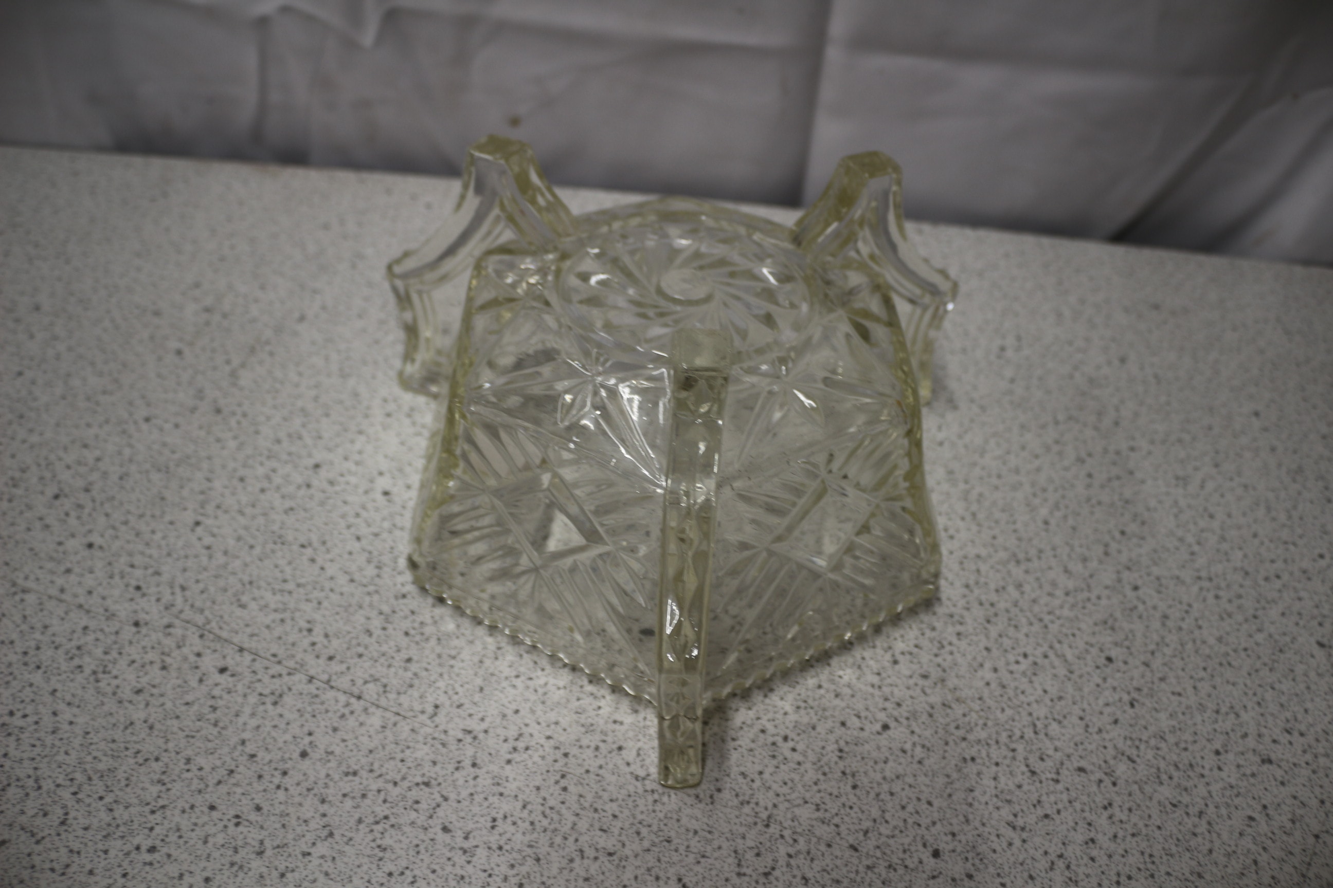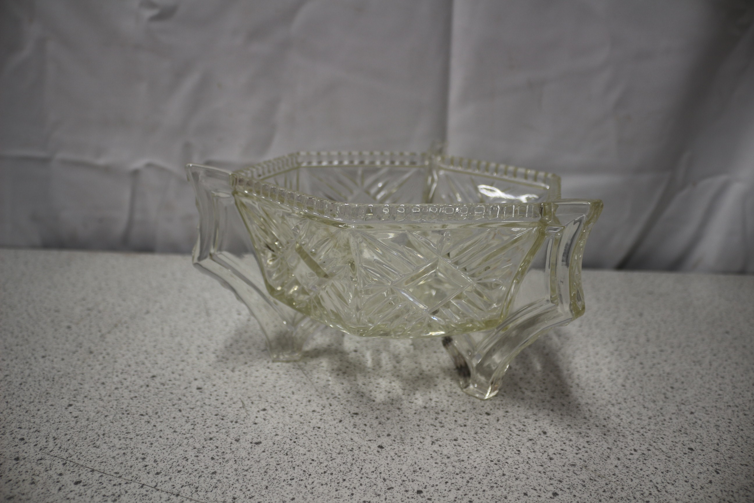 A clear, hexagonal, footed, pressed glass, divided candy dish or serving bowl with a geometric pattern.
