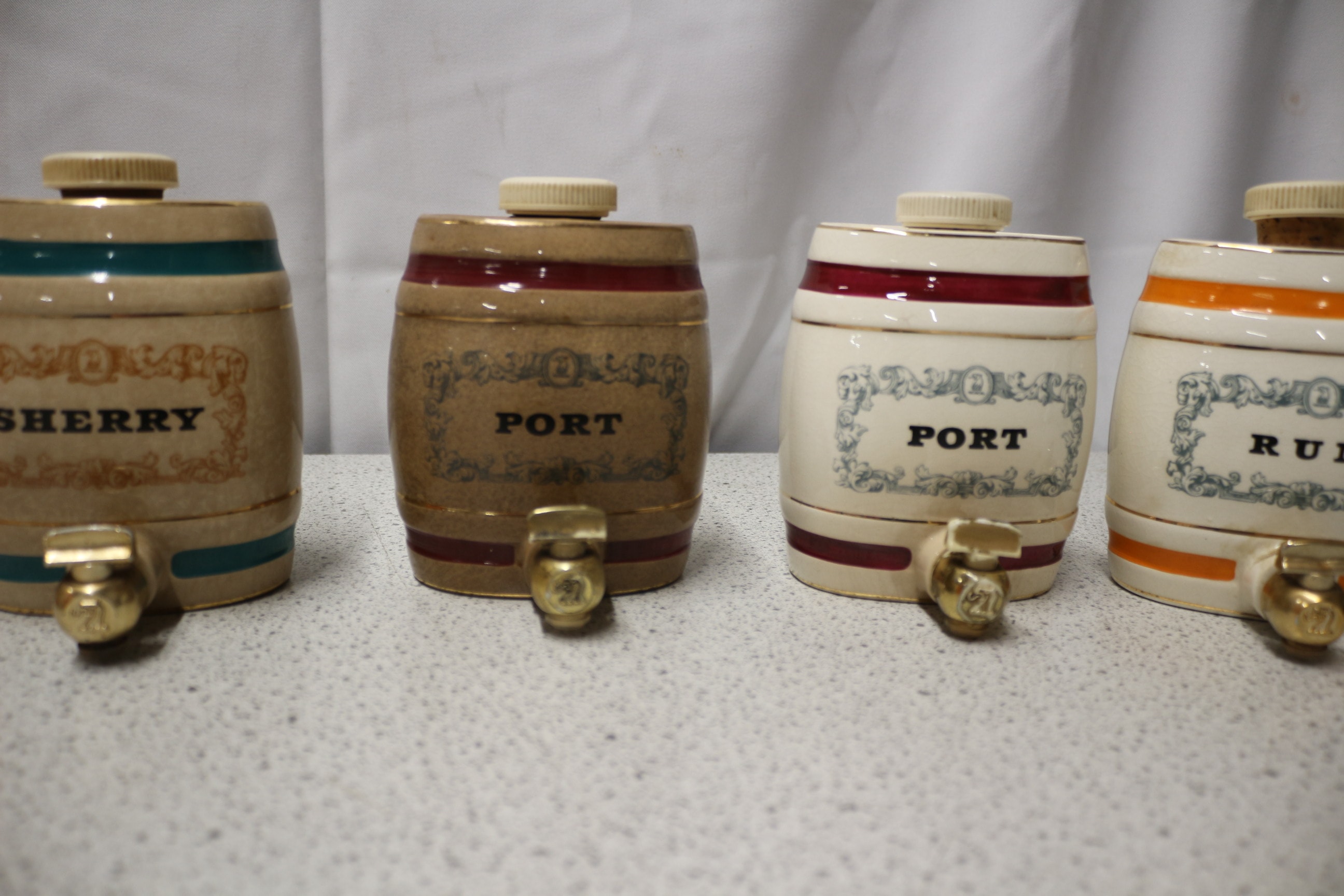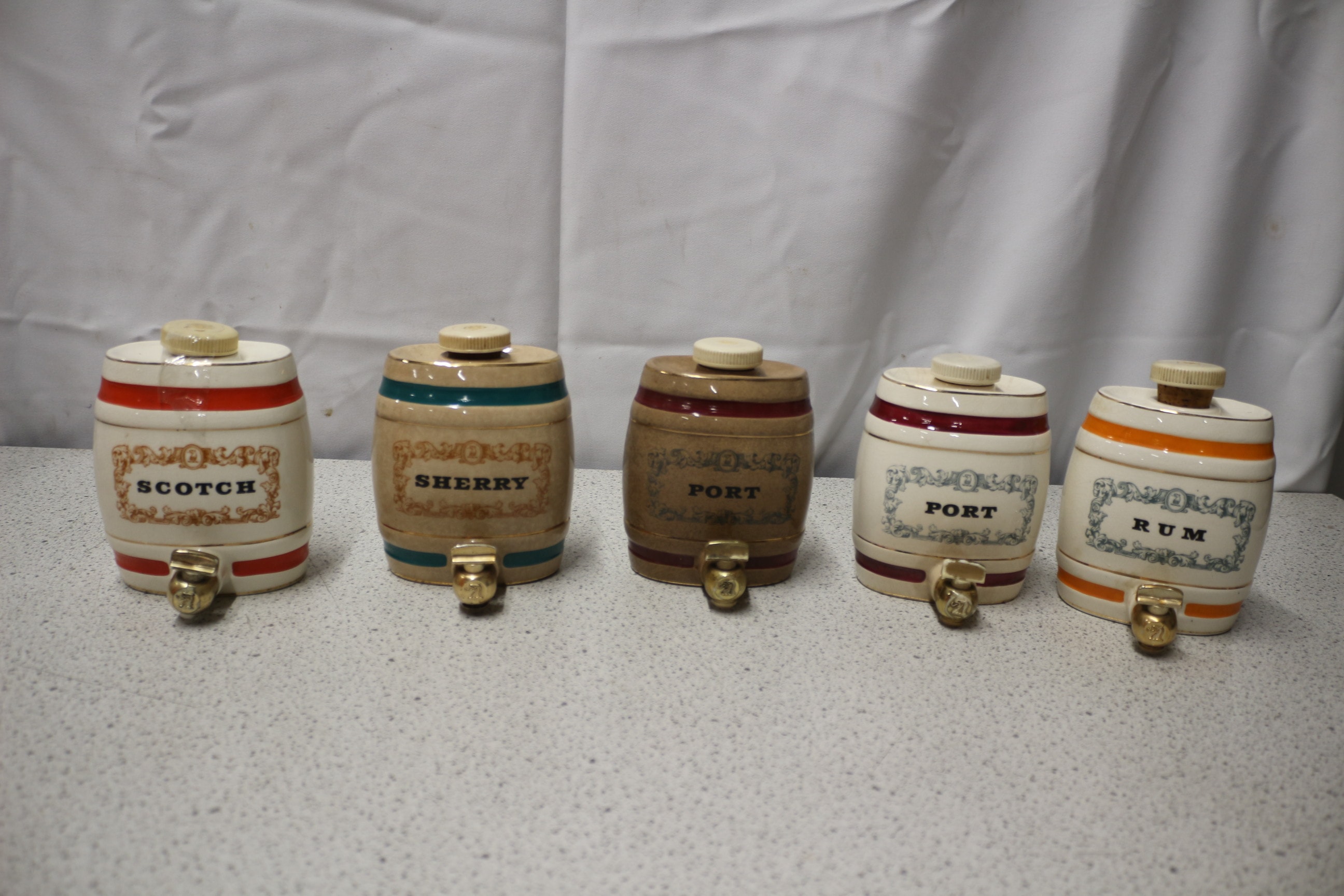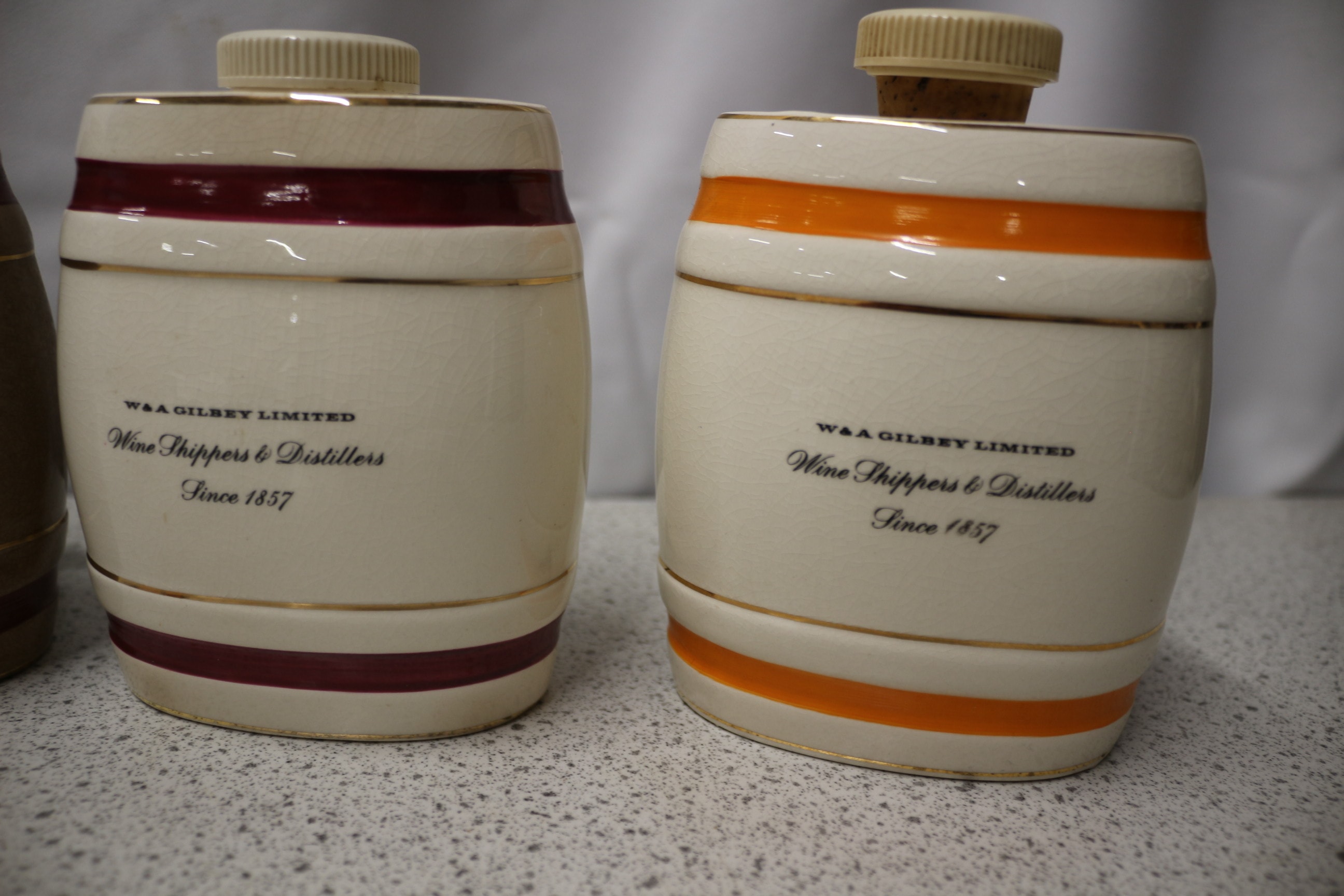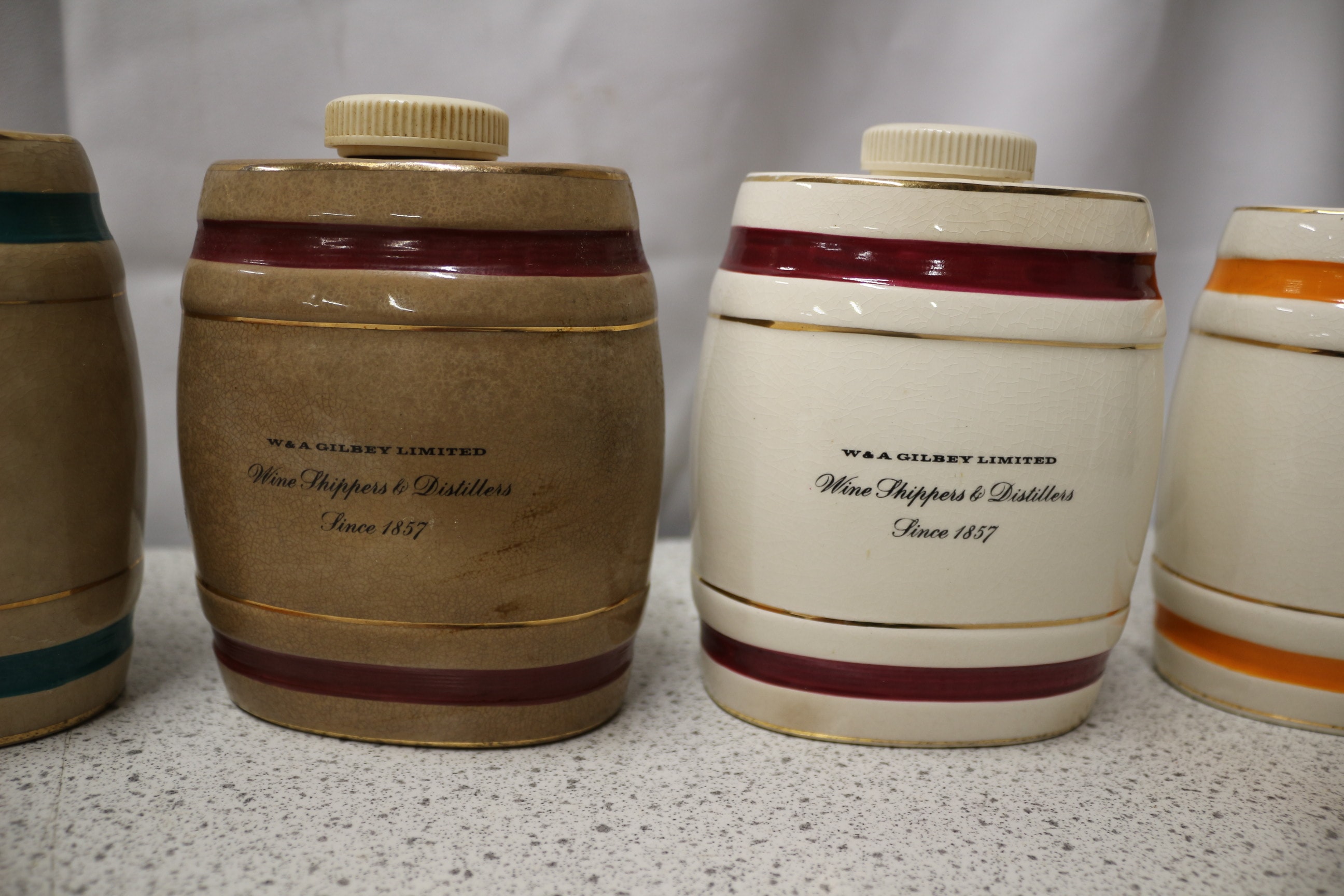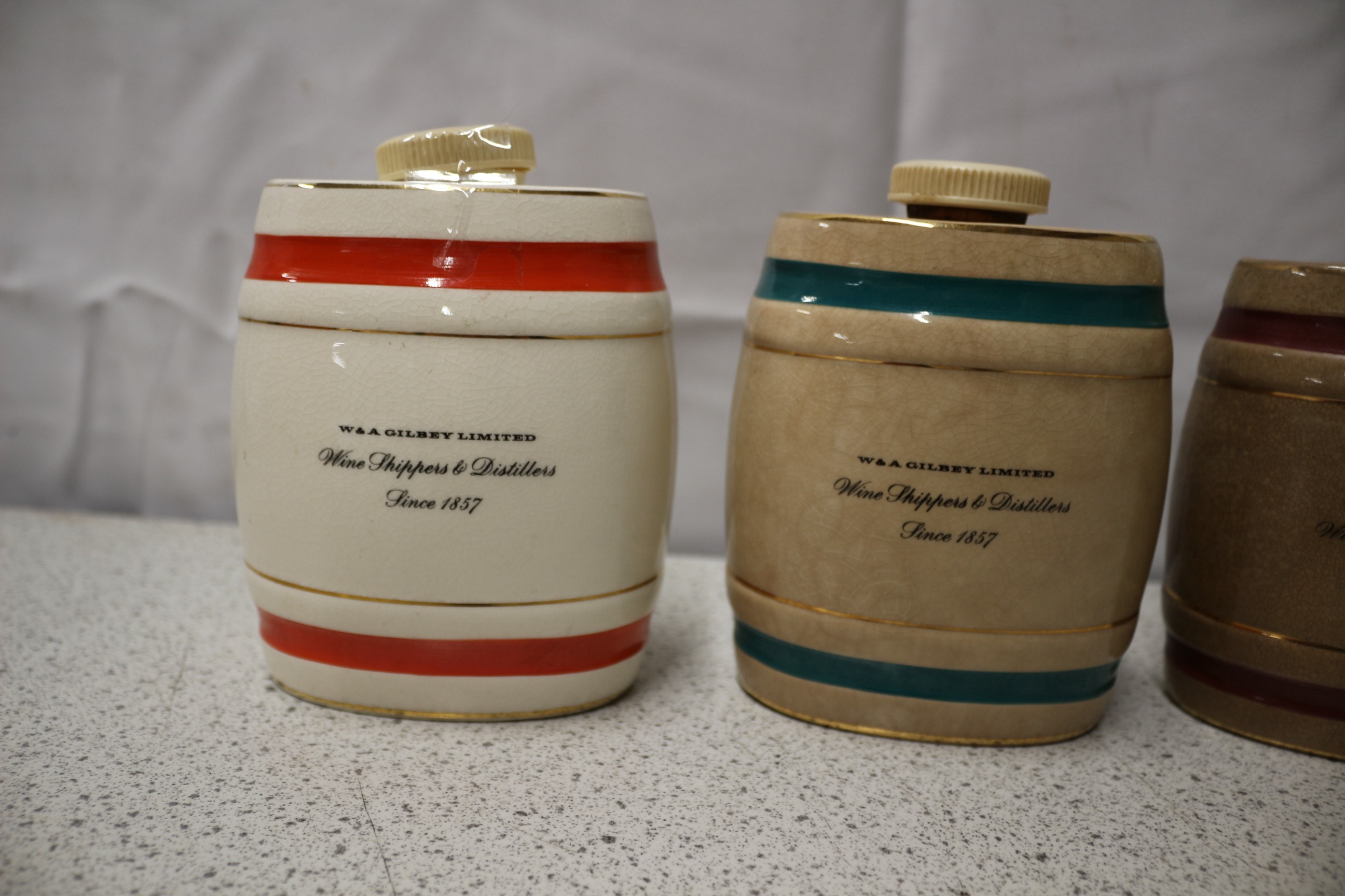 A set of five ceramic barrel-shaped decanters by Royal Victoria Wade England Pottery, in white, beige, and brown with various colored bands and gold accents, labeled “SCOTCH”, “SHERRY”, “PORT” (x2), and “RUM” on the front, and “W & A GILBEY LIMITED Wine Shippers & Distillers Since 1857” on the back.