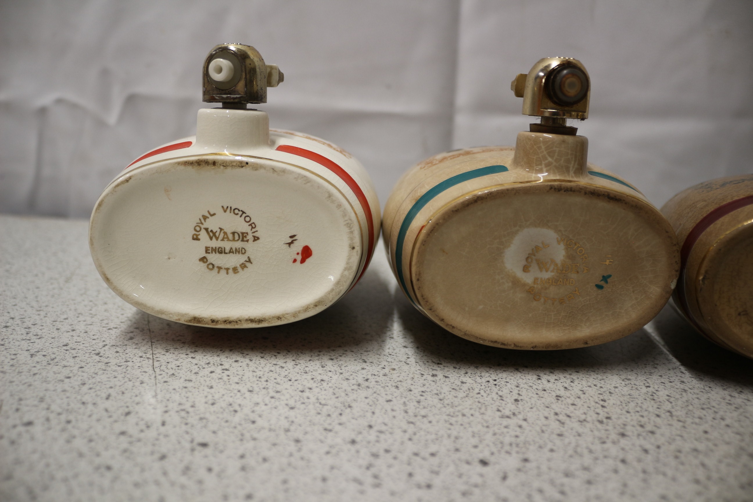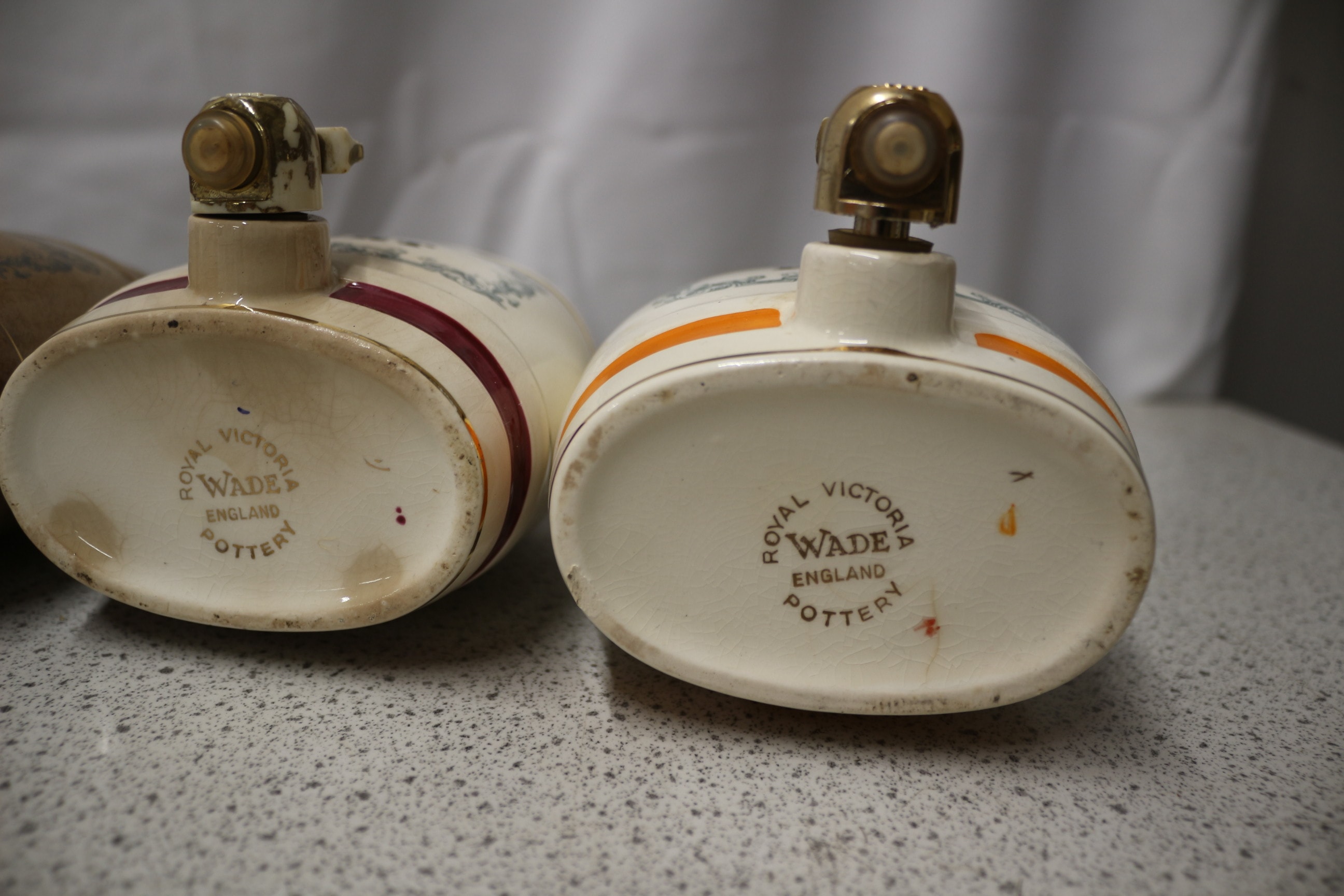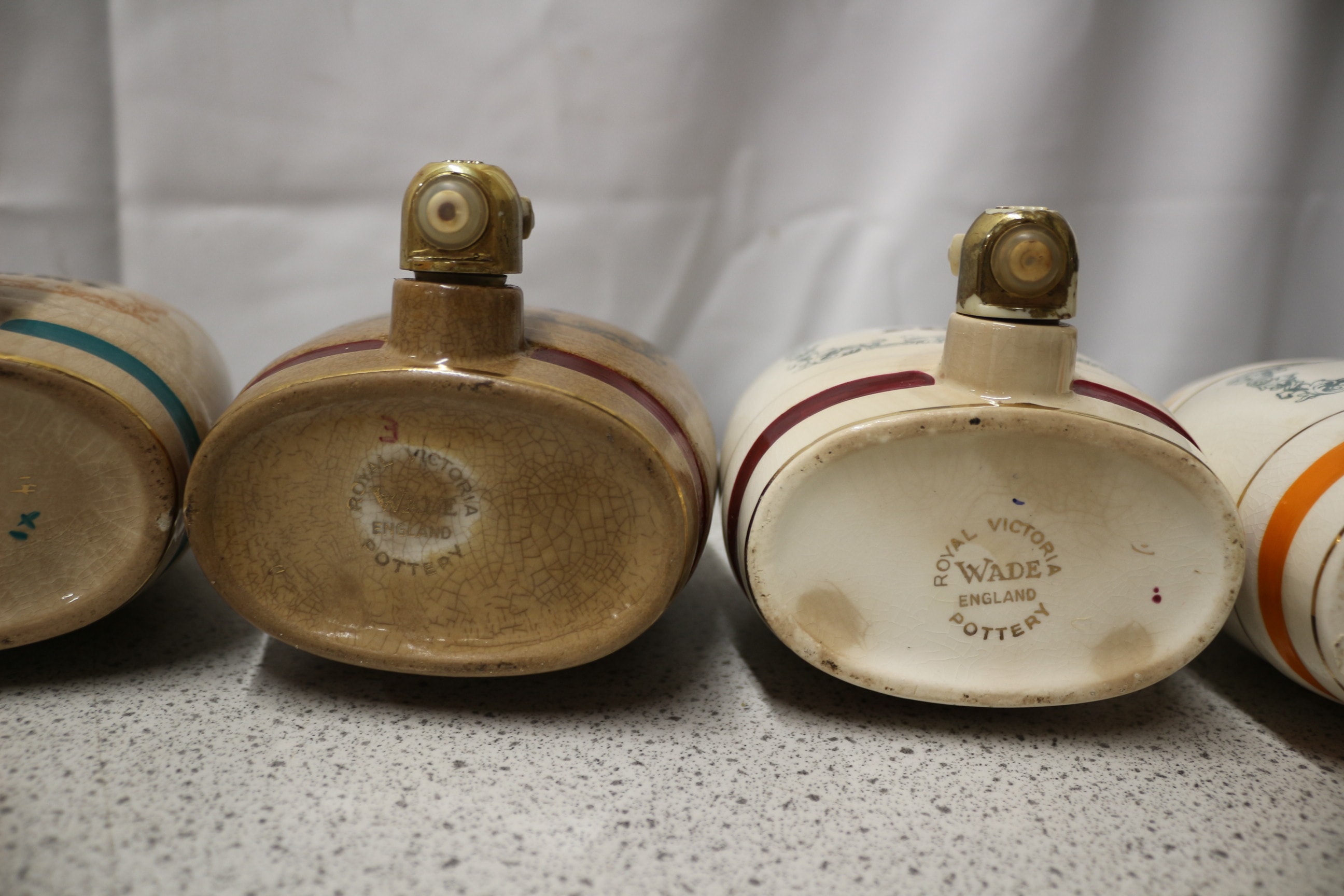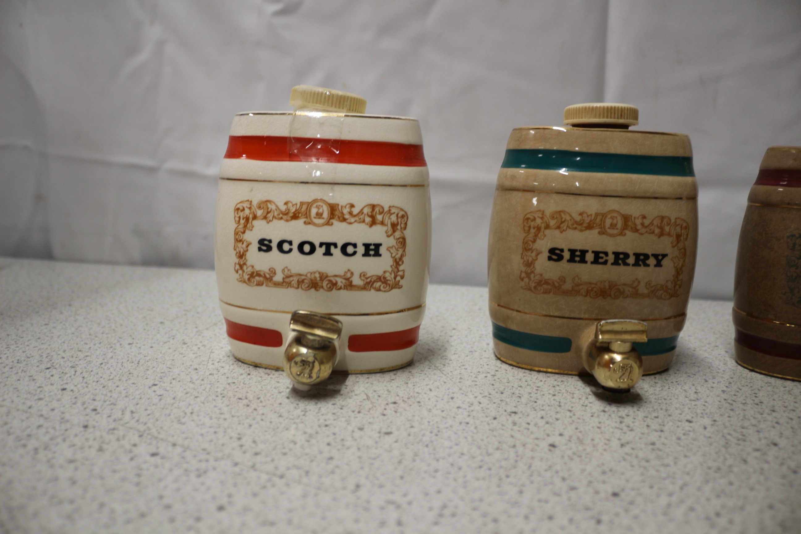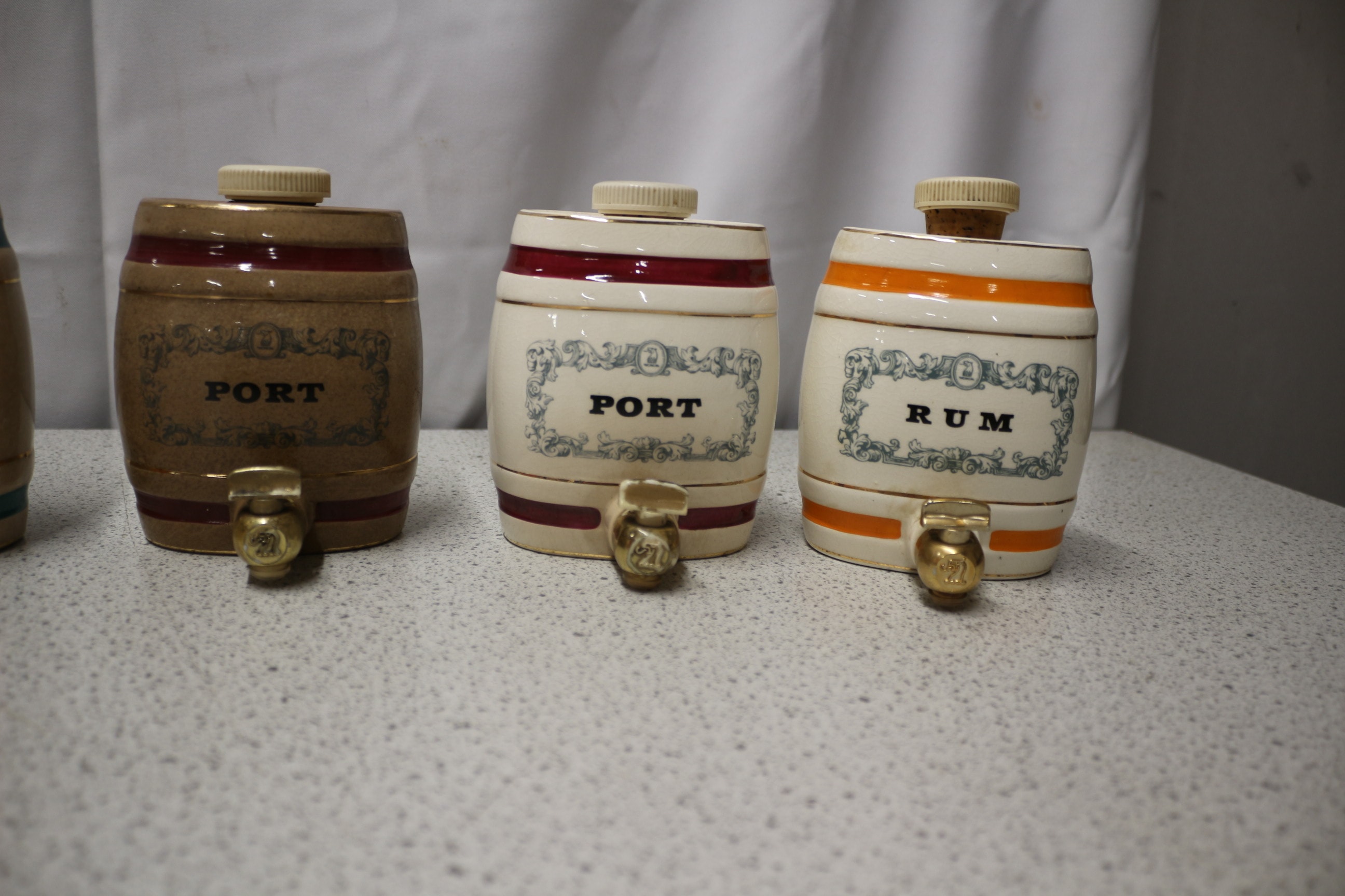 A set of five ceramic barrel-shaped decanters by Royal Victoria Wade England Pottery, in white, beige, and brown with various colored bands and gold accents, labeled “SCOTCH”, “SHERRY”, “PORT” (x2), and “RUM” on the front, and “W & A GILBEY LIMITED Wine Shippers & Distillers Since 1857” on the back.