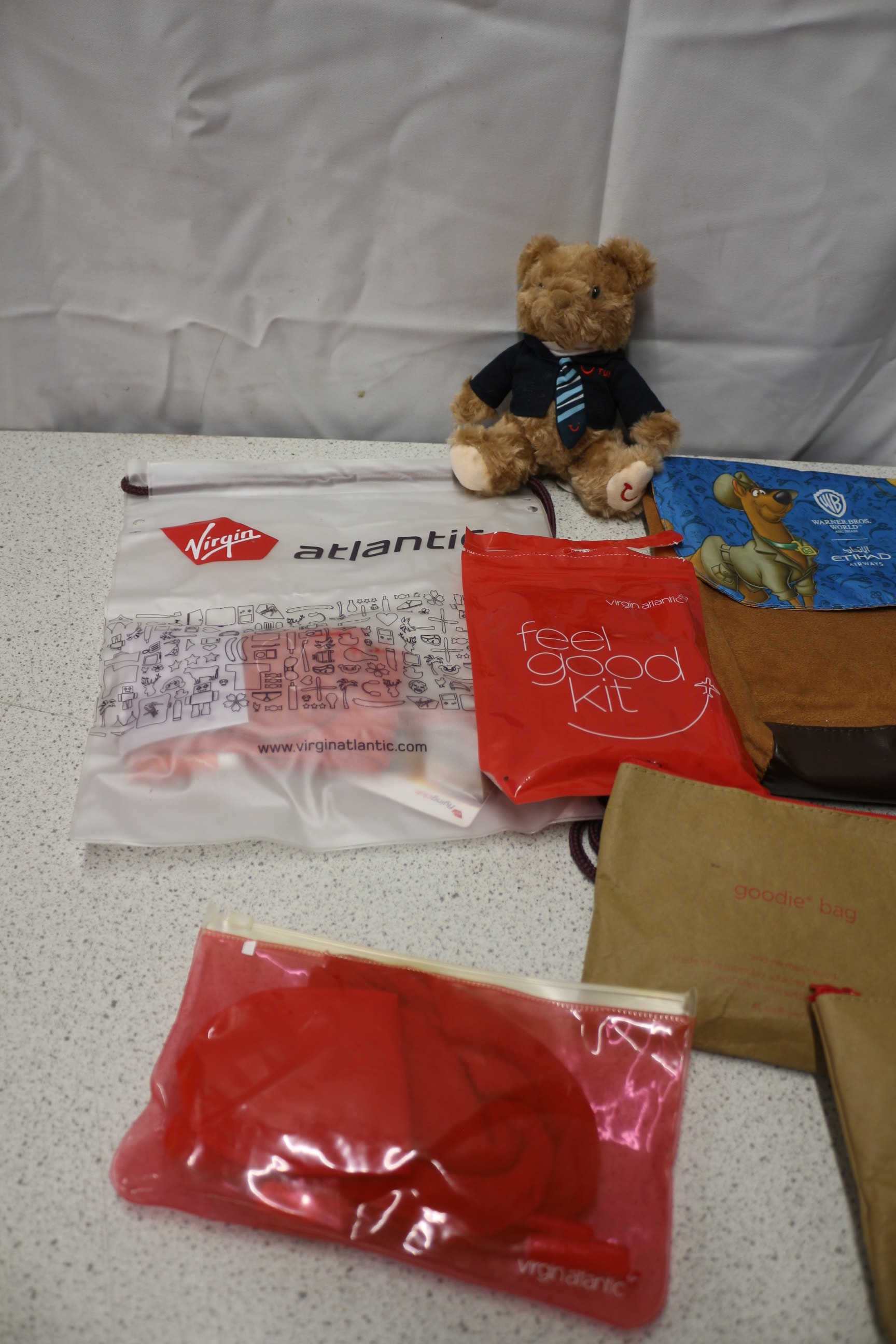 A collection of various airline-branded pouches, goodie bags, a teddy bear, and Scooby Doo items.