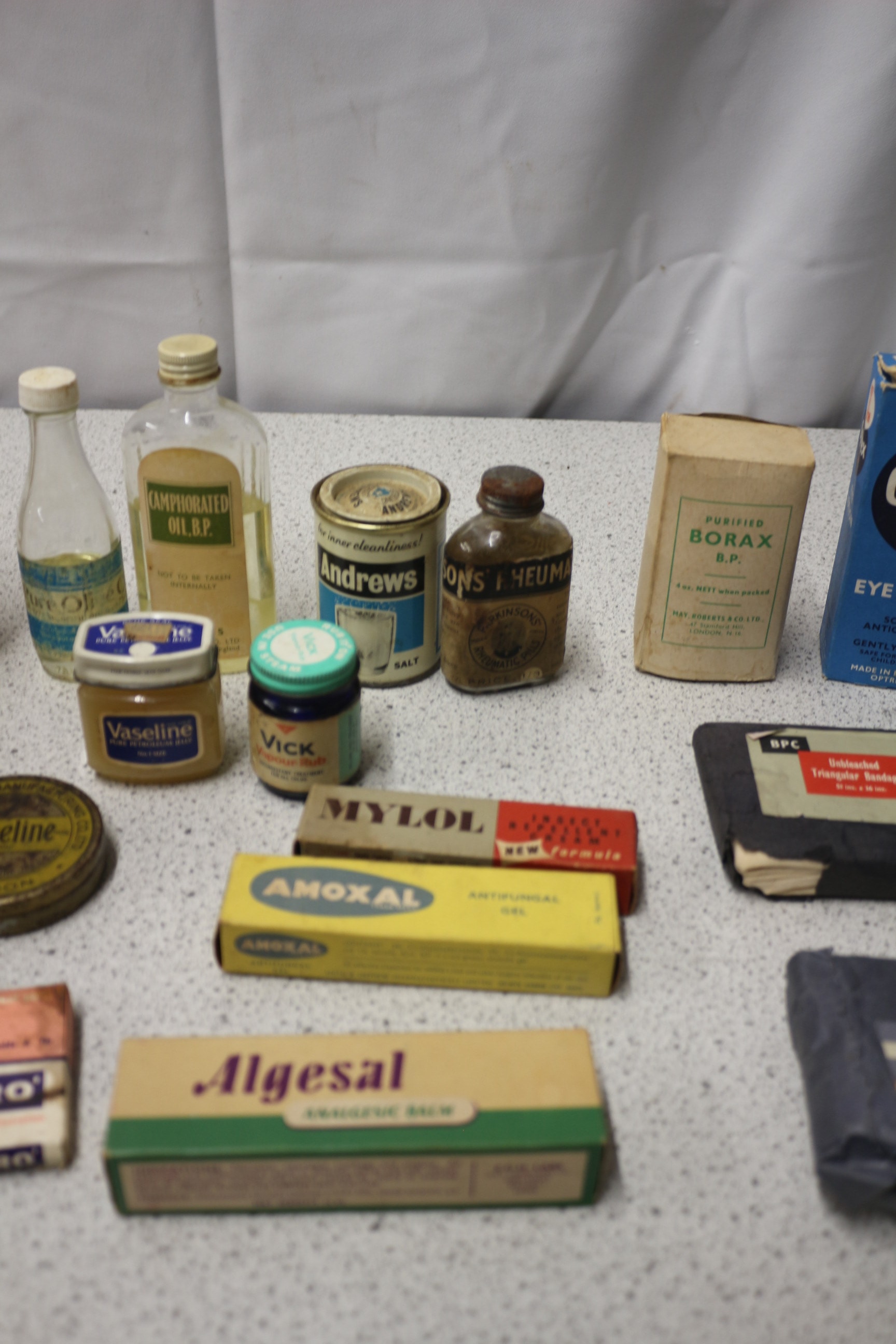 Selection of vintage chemist items including a blue and white box of Optrex EYE LOTION, stating ‘WITH SPECIAL EYE BATH’ and ‘SOOTHING ANTICONGESTIVE ANTISEPTIC’, made in England by Optrex Ltd. Vaseline tin and more