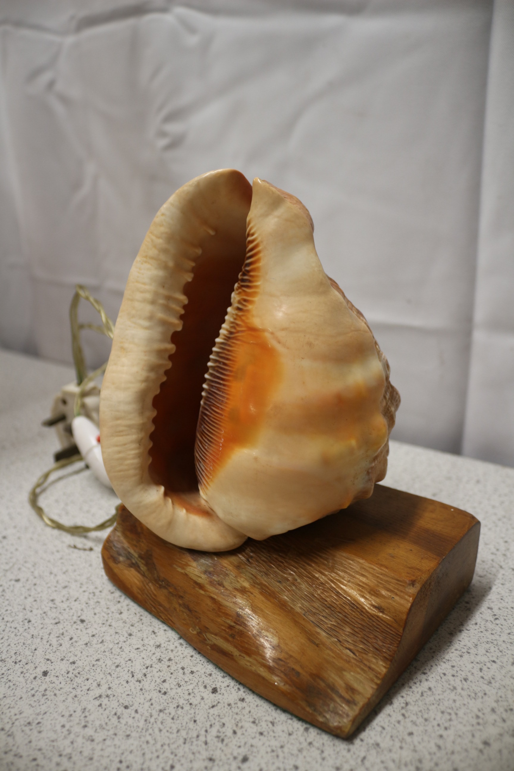 A beige and orange conch-type shell mounted on a light brown wooden base, accompanied by an electrical cord with a white plug and switch, alongside a cream/beige conch-type shell with brown spots and markings. Untested