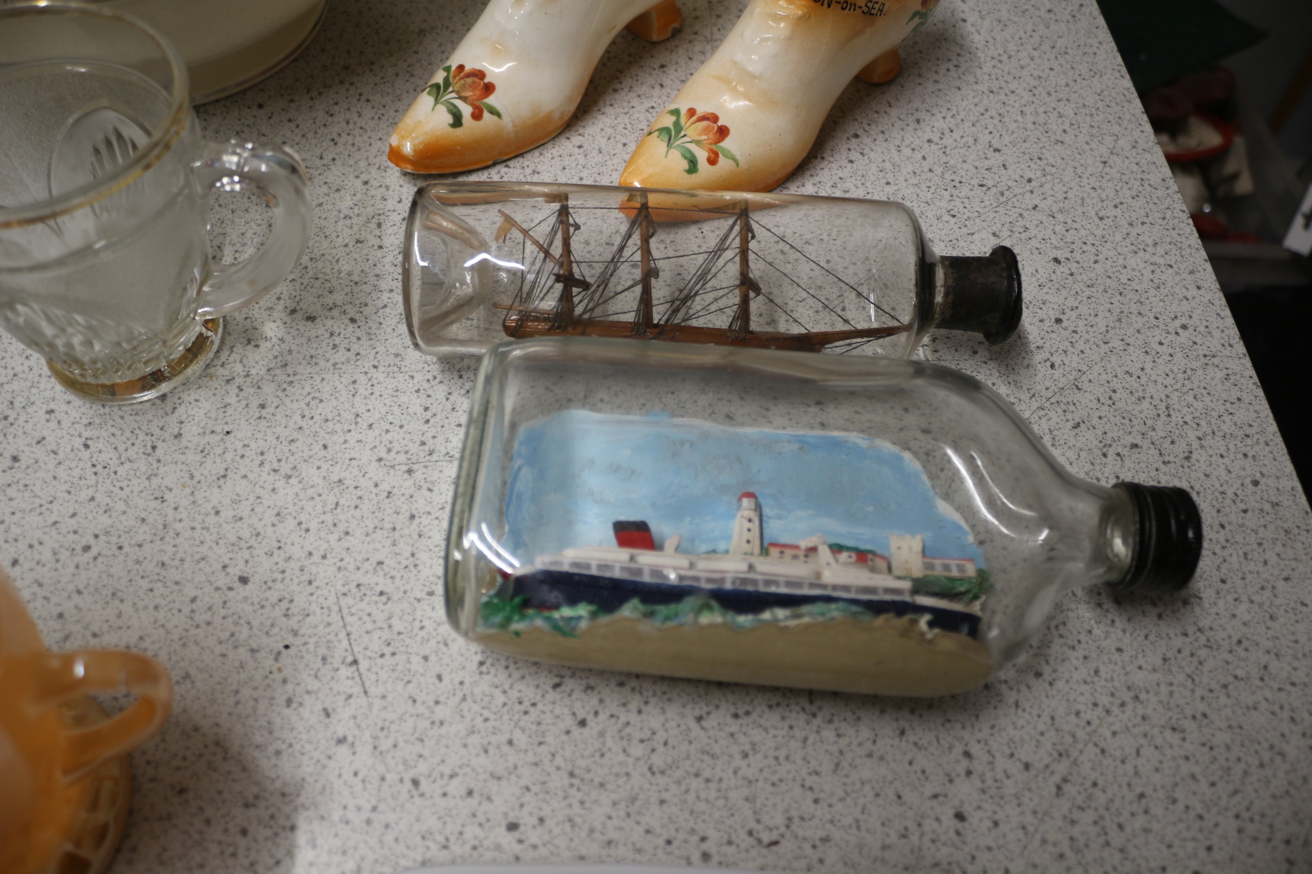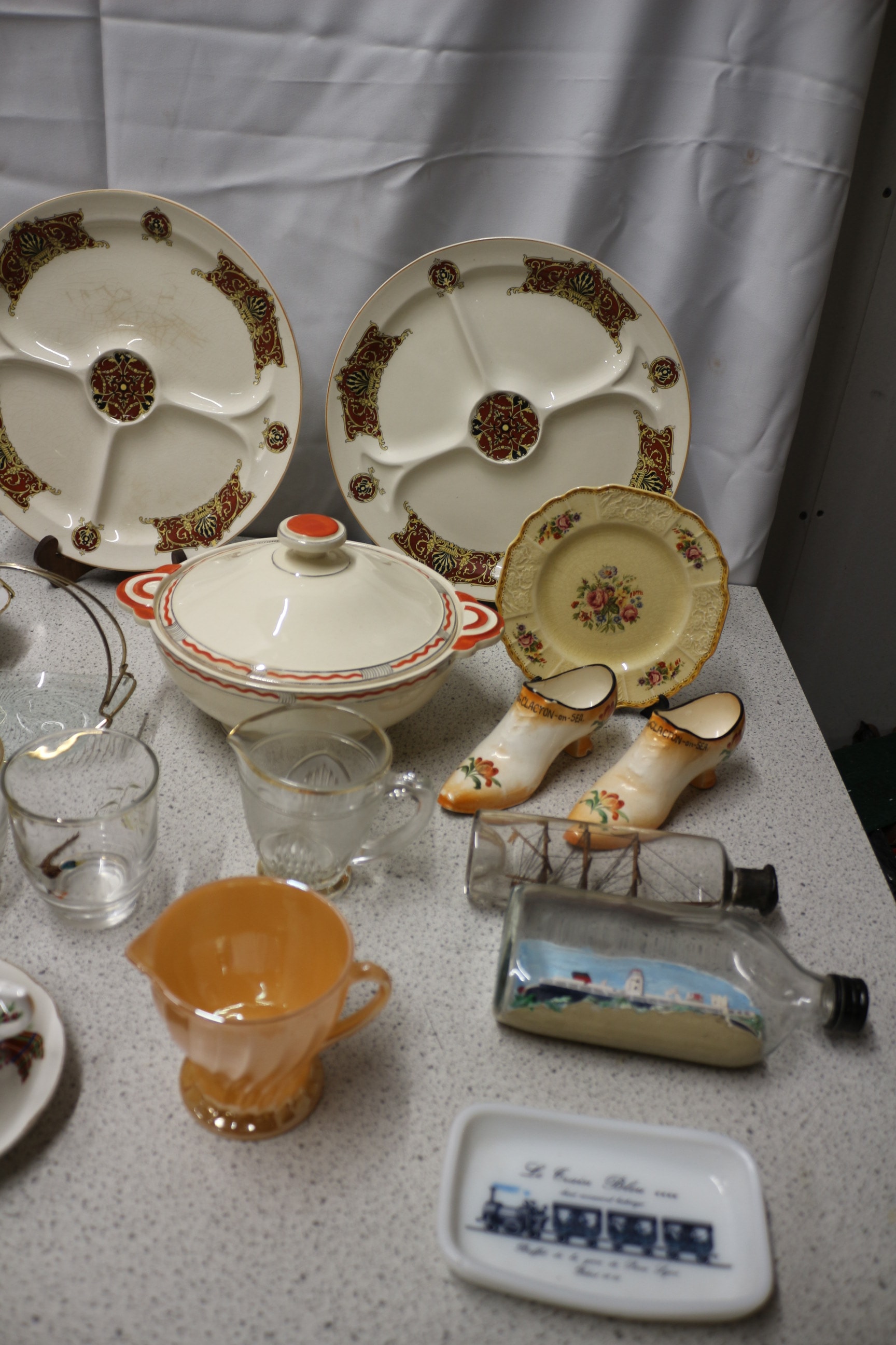 A collection of assorted tableware and decorative items, including two cream segmented platters, an oval white dish, a white covered casserole, a small cream floral plate, two cream ceramic shoes, a set of four clear bird-motif glasses, a clear ‘ER’ ashtray, a clear glass pitcher and mug, ‘Father’ and ‘Balmoral’ teacups and saucers, an orange glass creamer, two scene-filled glass bottles, and a ‘Le train train’ dish.