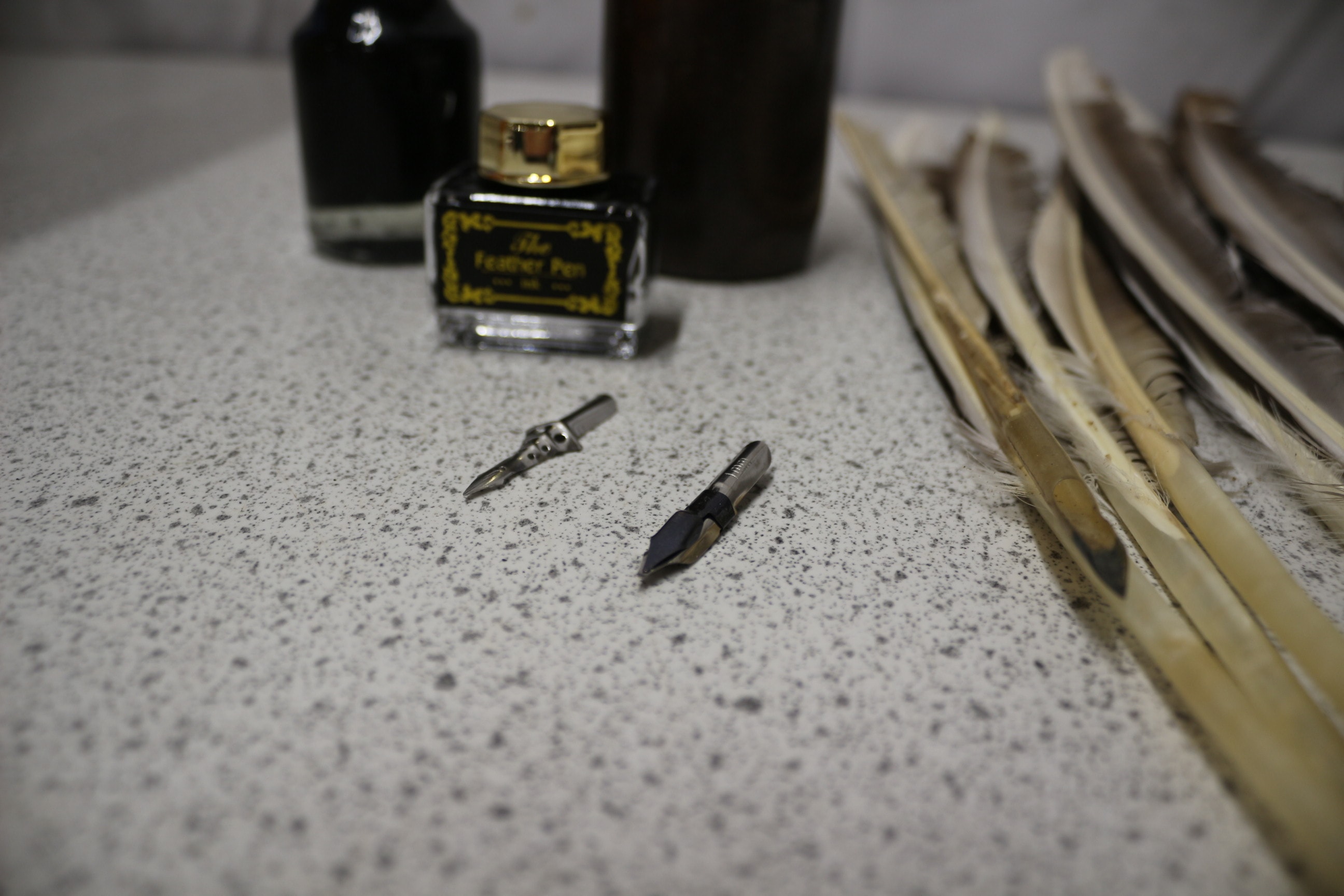 Three ink bottles (one clear glass with cork, one brown ceramic, and one small clear glass with a gold cap labelled “The Feather Pen Ink “), two metal pen nibs, and a collection of quills with a white cylindrical container.