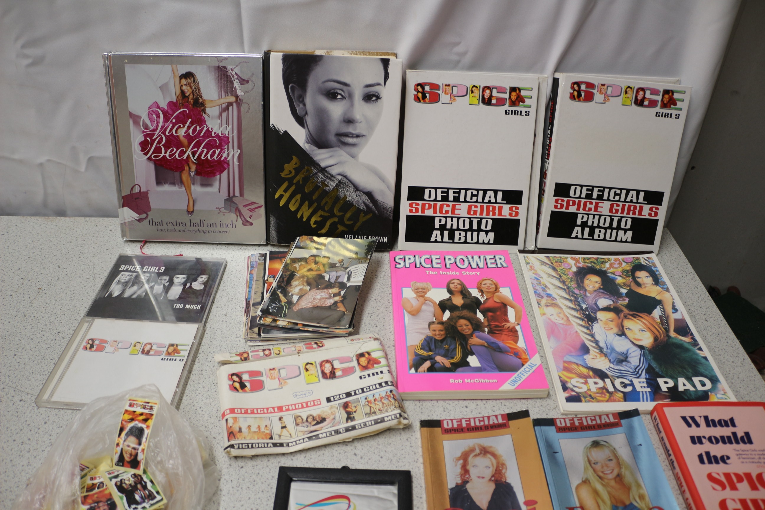 A collection of Spice Girls and individual member memorabilia, including books, two “OFFICIAL SPICE GIRLS PHOTO ALBUM”s, packs of “OFFICIAL SPICE GIRLS PHOTOS 120 TO COLLECT”, “SPICE GIRLS” CD cases, booklets for “Geri”, “Emma”, and “Mel B”, and a framed “SPICE GIRLS” picture.