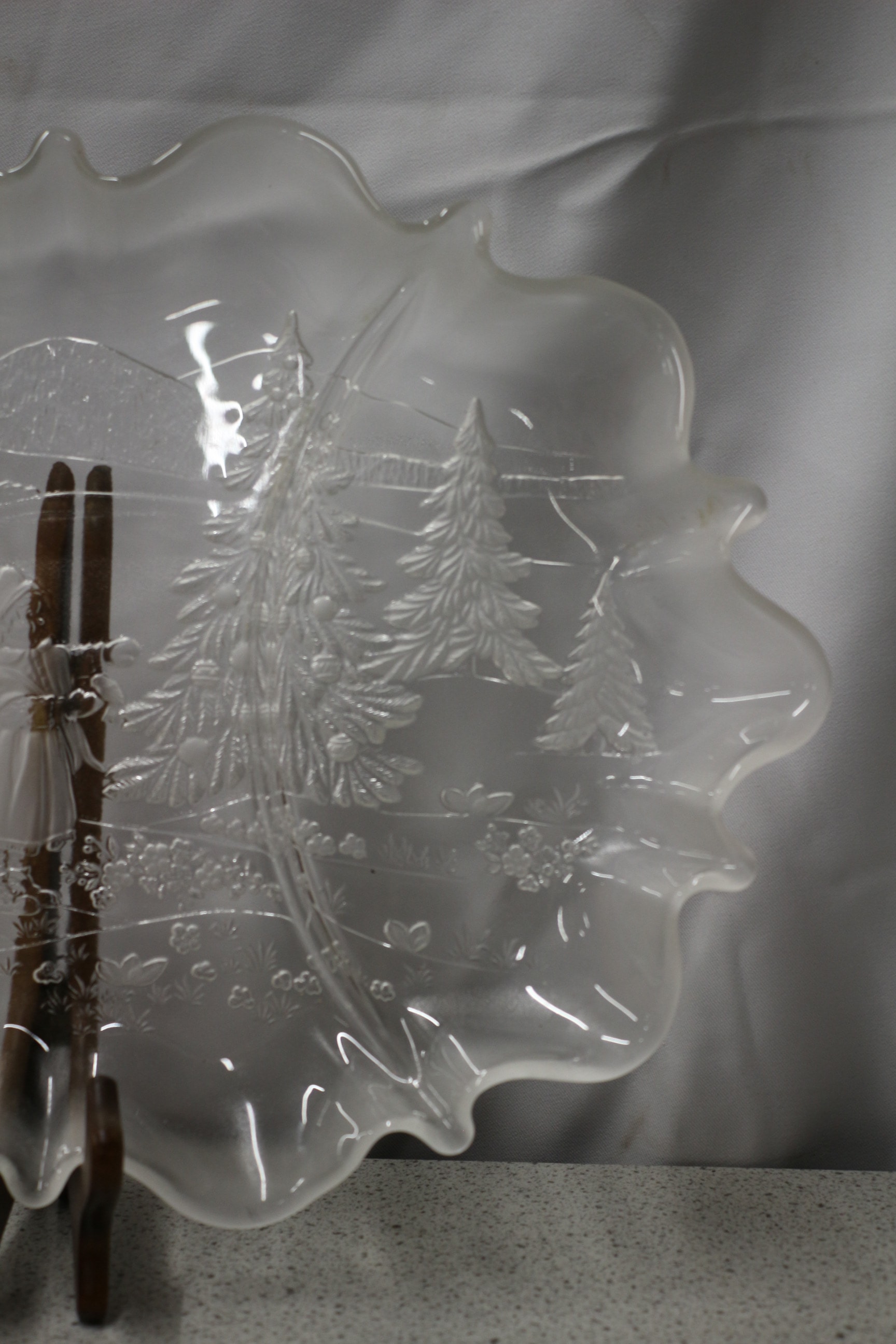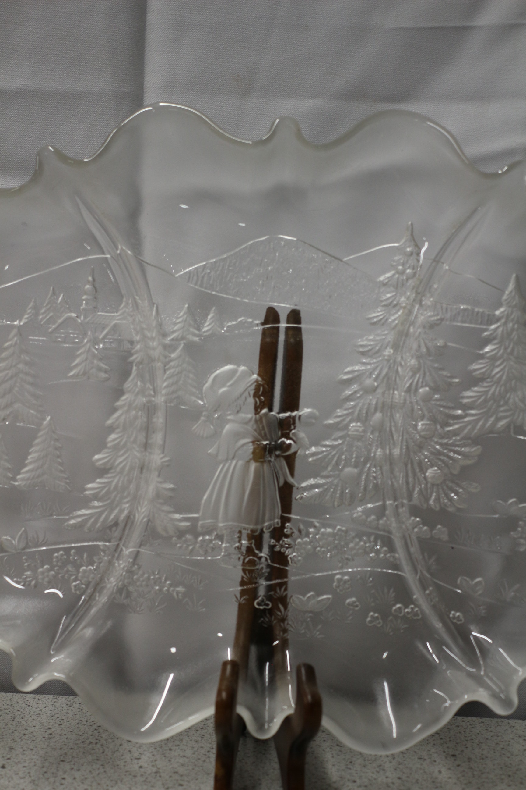 A clear and frosted glass decorative plate with a fluted edge, featuring an etched winter scene of trees, mountains, and a figure. 43cm wide