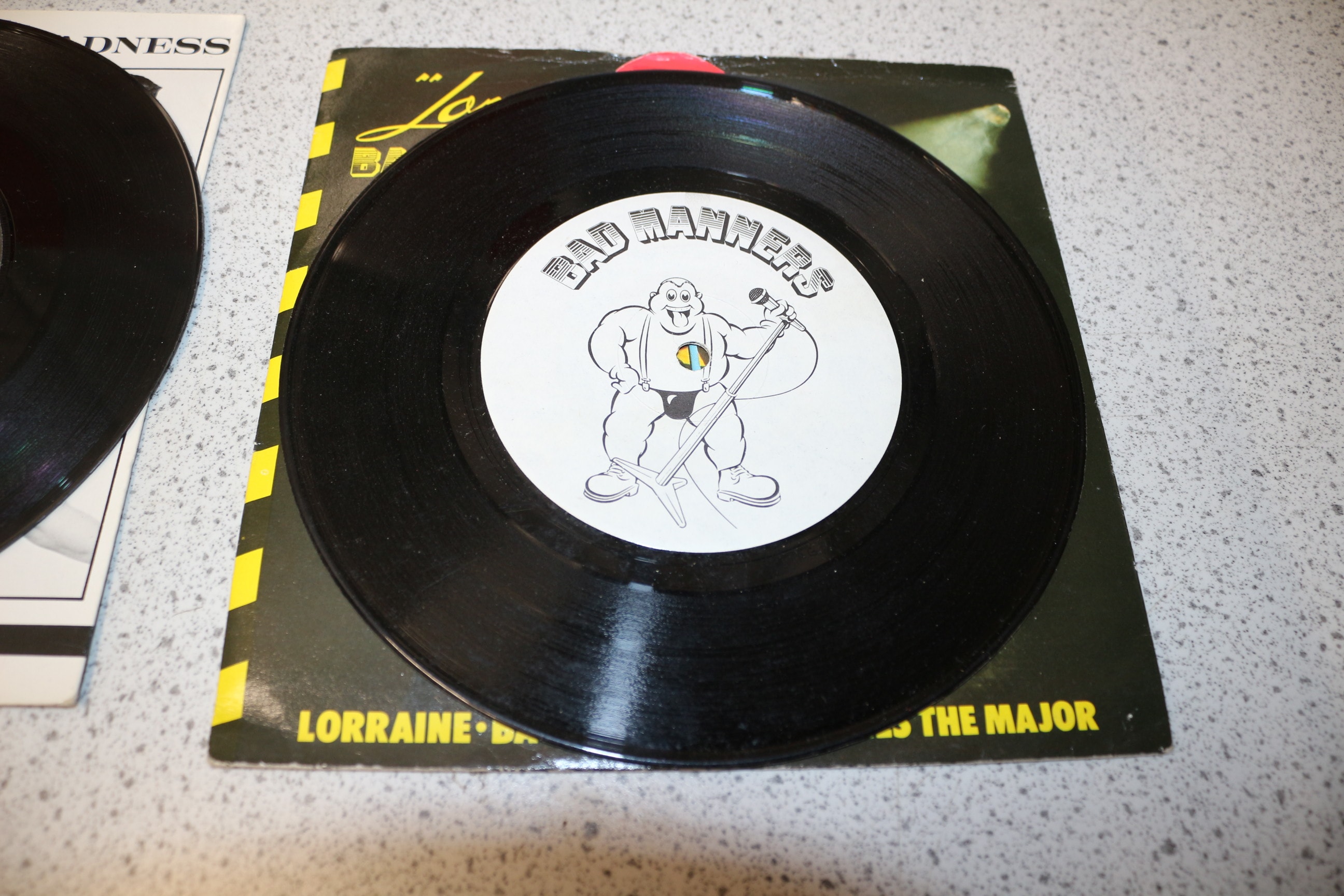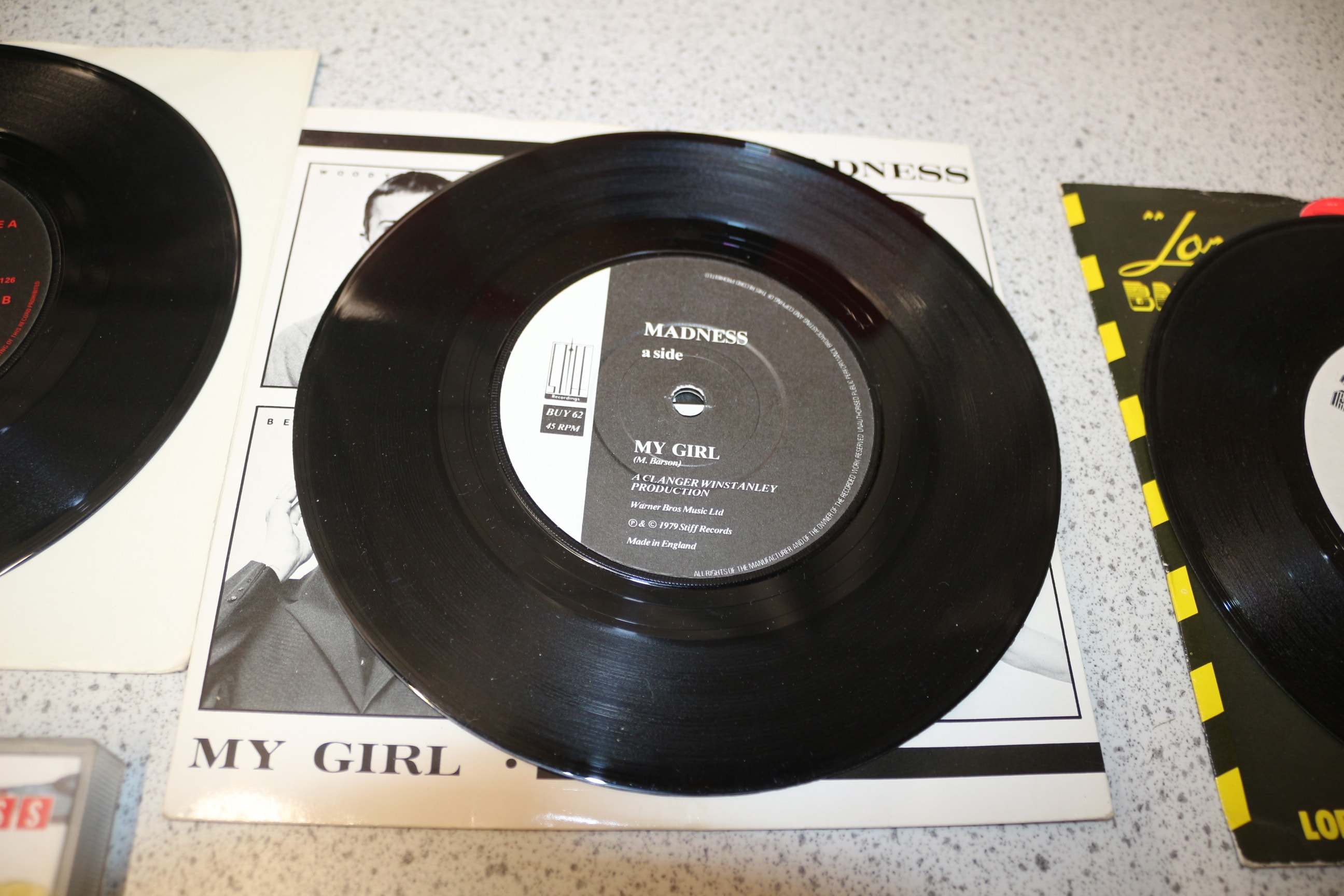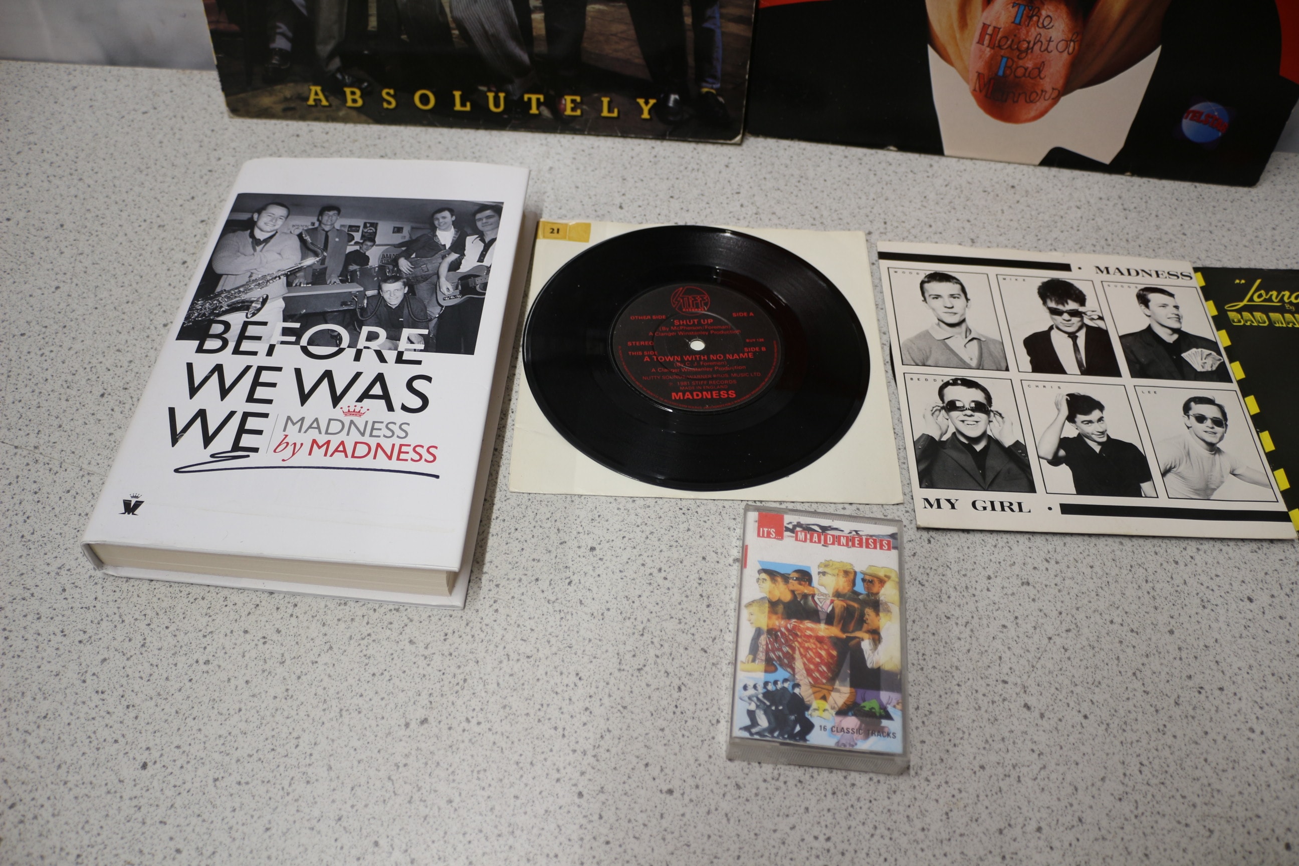 A collection featuring two black vinyl LPs by Madness (‘Absolutely’) and Bad Manners (‘The Height Of Bad Manners…’), one white hardcover book ‘Before We Was We – Madness by Madness’, two black vinyl 7-inch singles by Madness (‘My Girl’) and Bad Manners (‘Lorraine’), and one clear cassette tape ‘Its’ Superfuzz’.