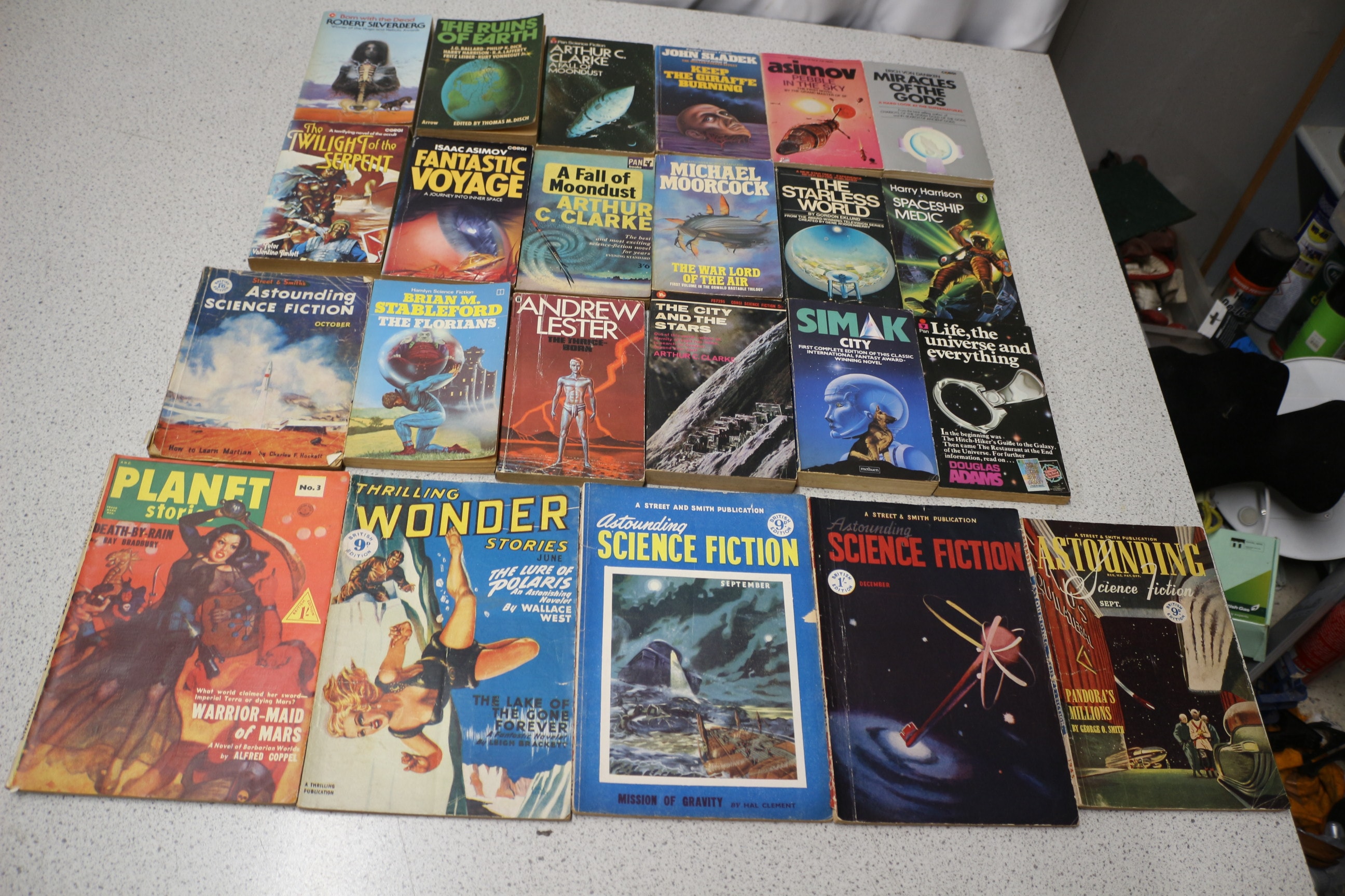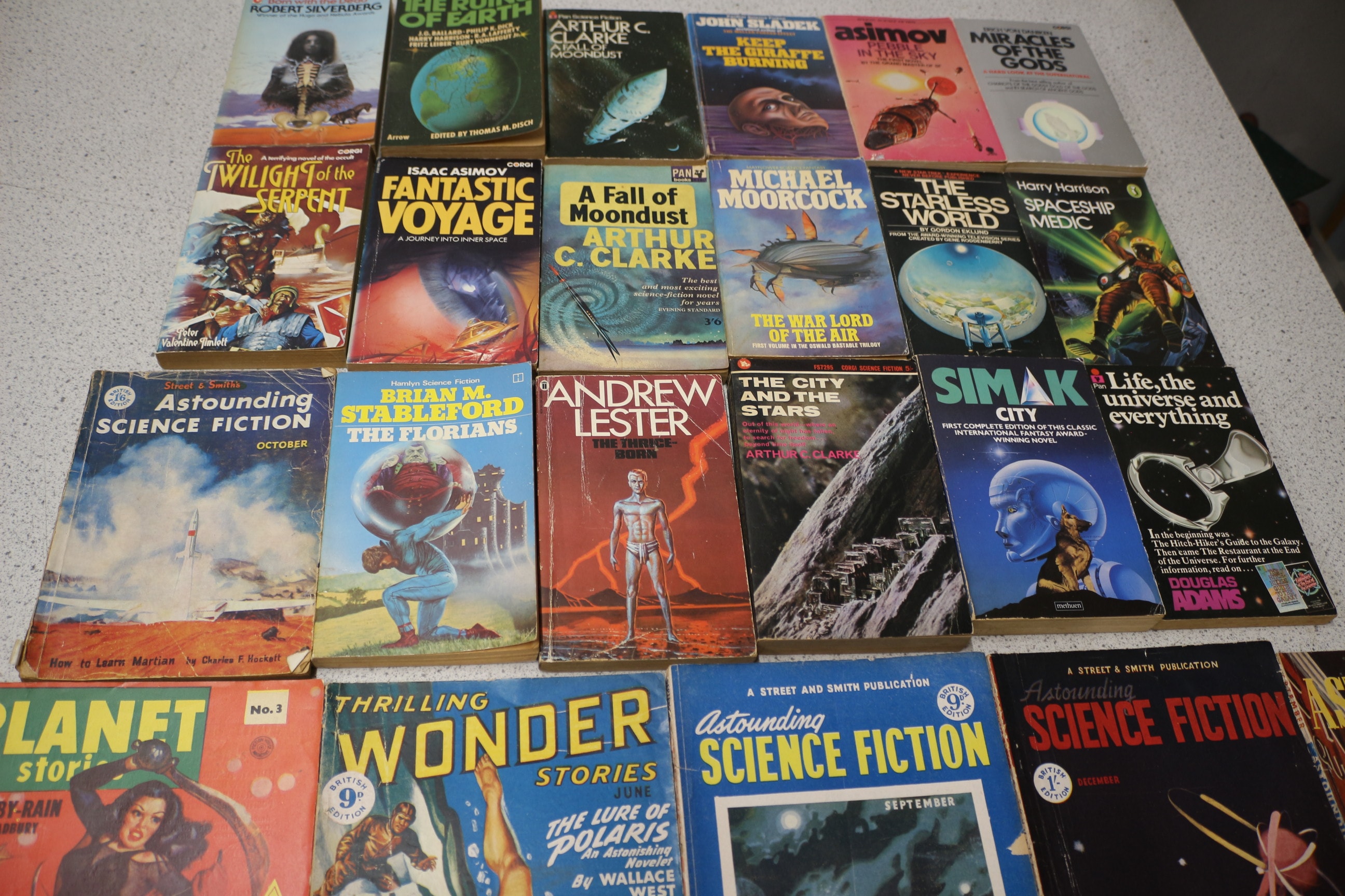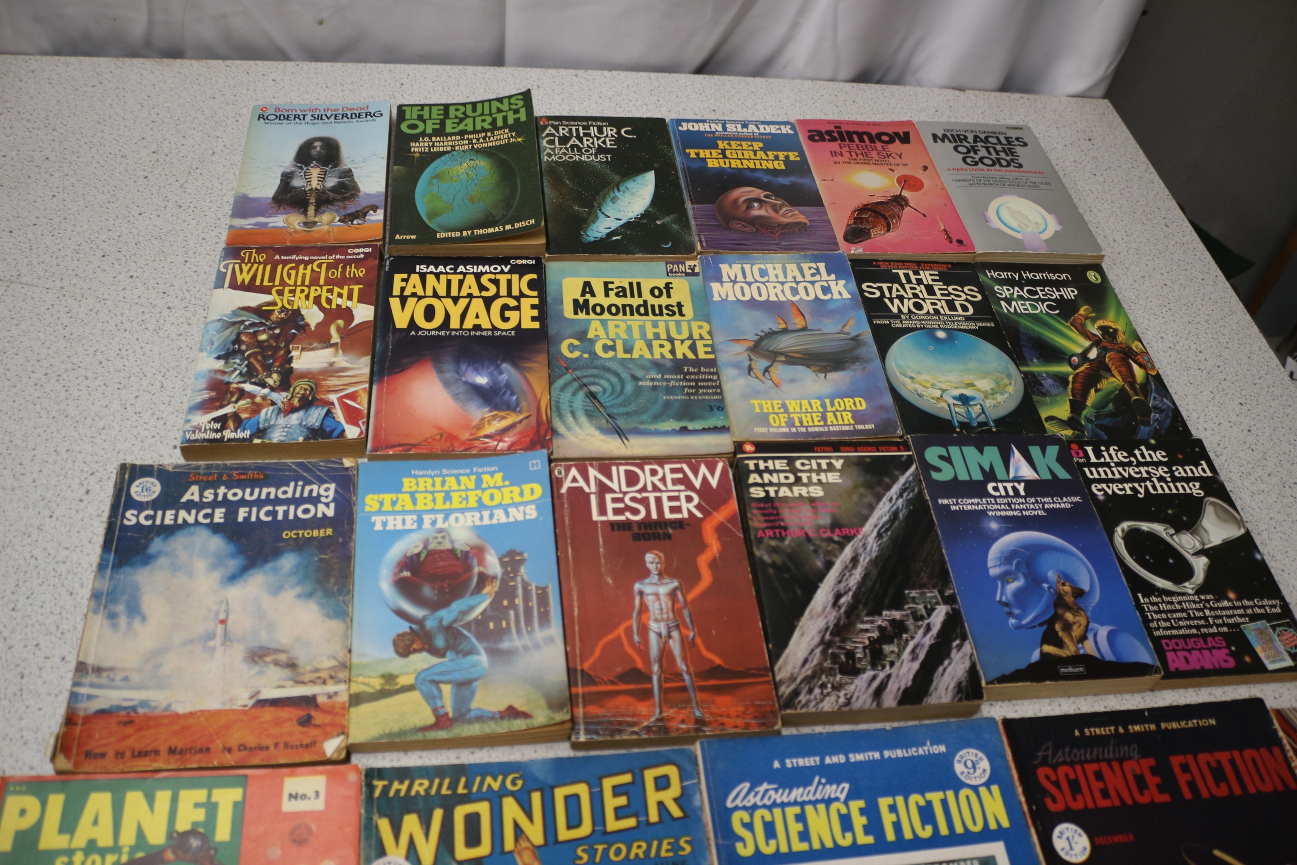 Collection vintage science fiction paperback books and pulp magazines by authors like Robert Silverberg and Isaac Asimov, featuring diverse covers and brands including Astounding Science Fiction, Corgi, and Pan.