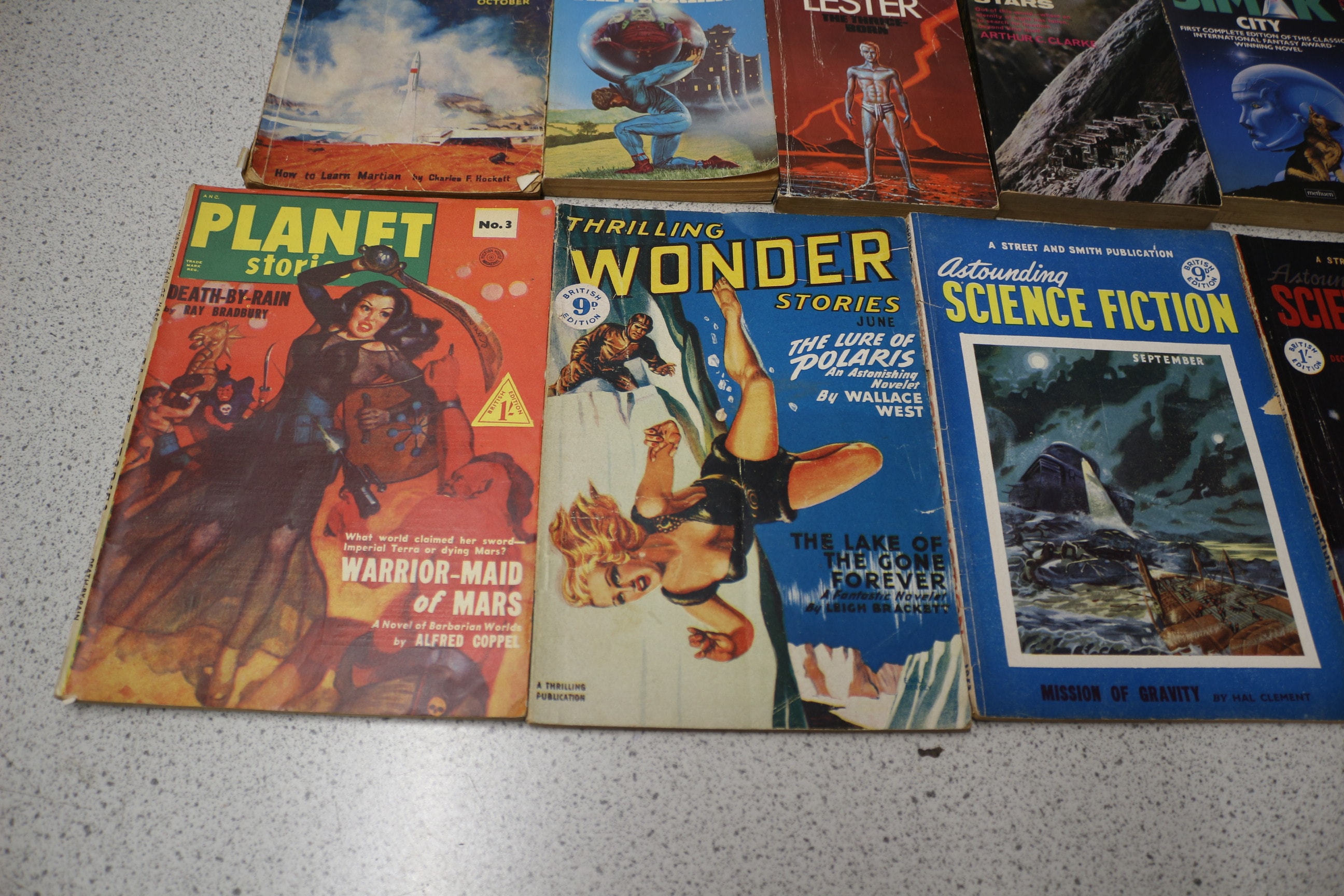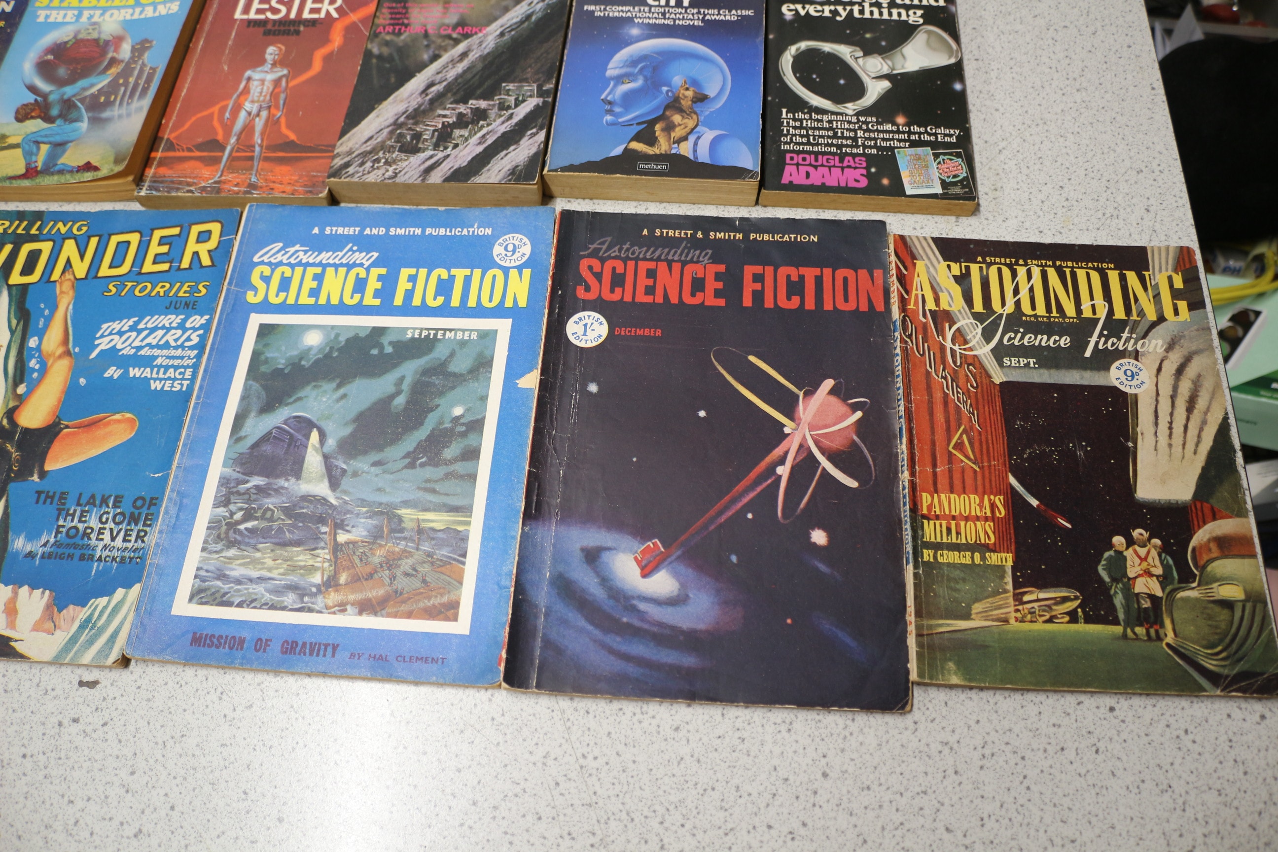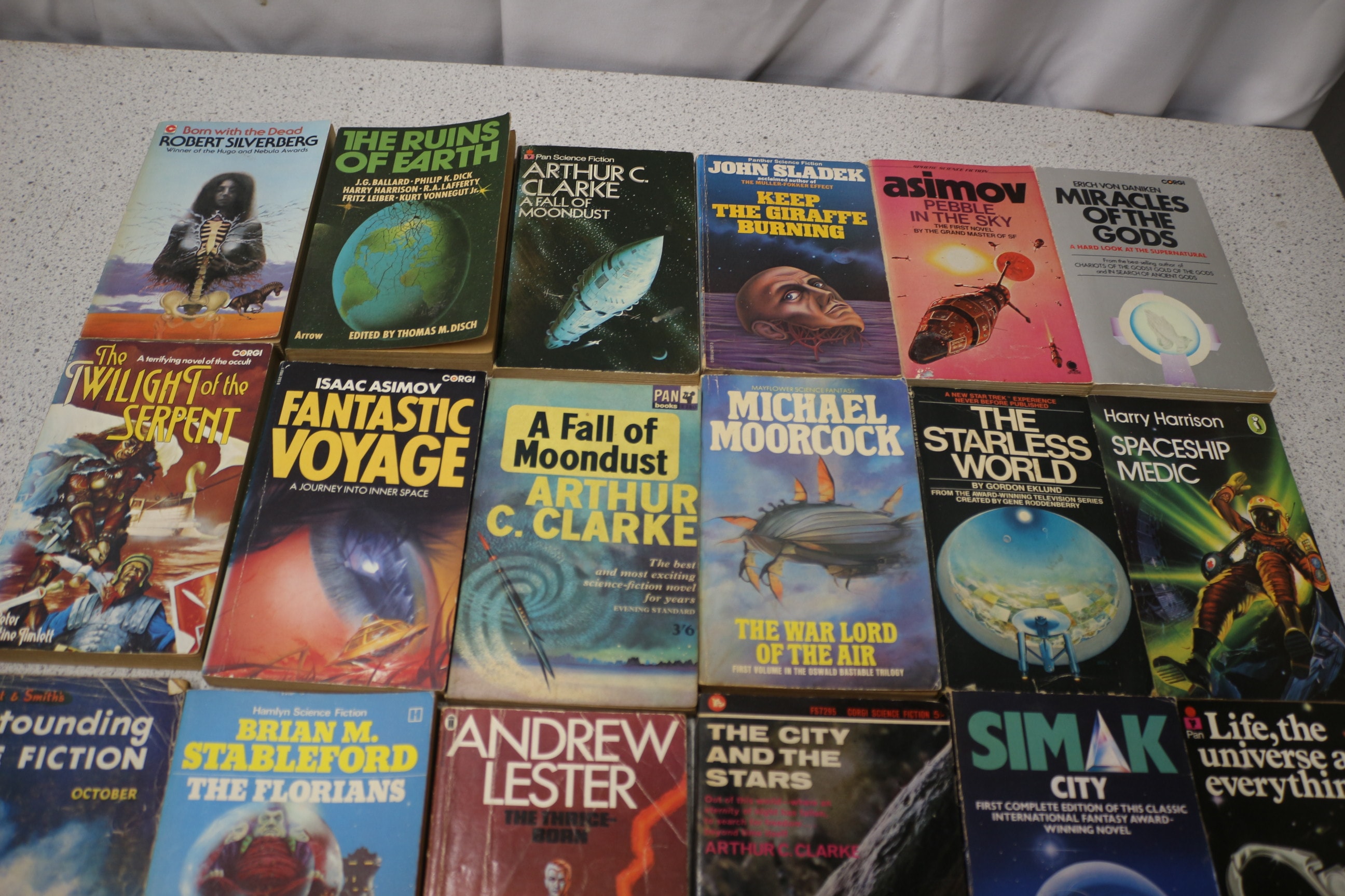Collection vintage science fiction paperback books and pulp magazines by authors like Robert Silverberg and Isaac Asimov, featuring diverse covers and brands including Astounding Science Fiction, Corgi, and Pan.