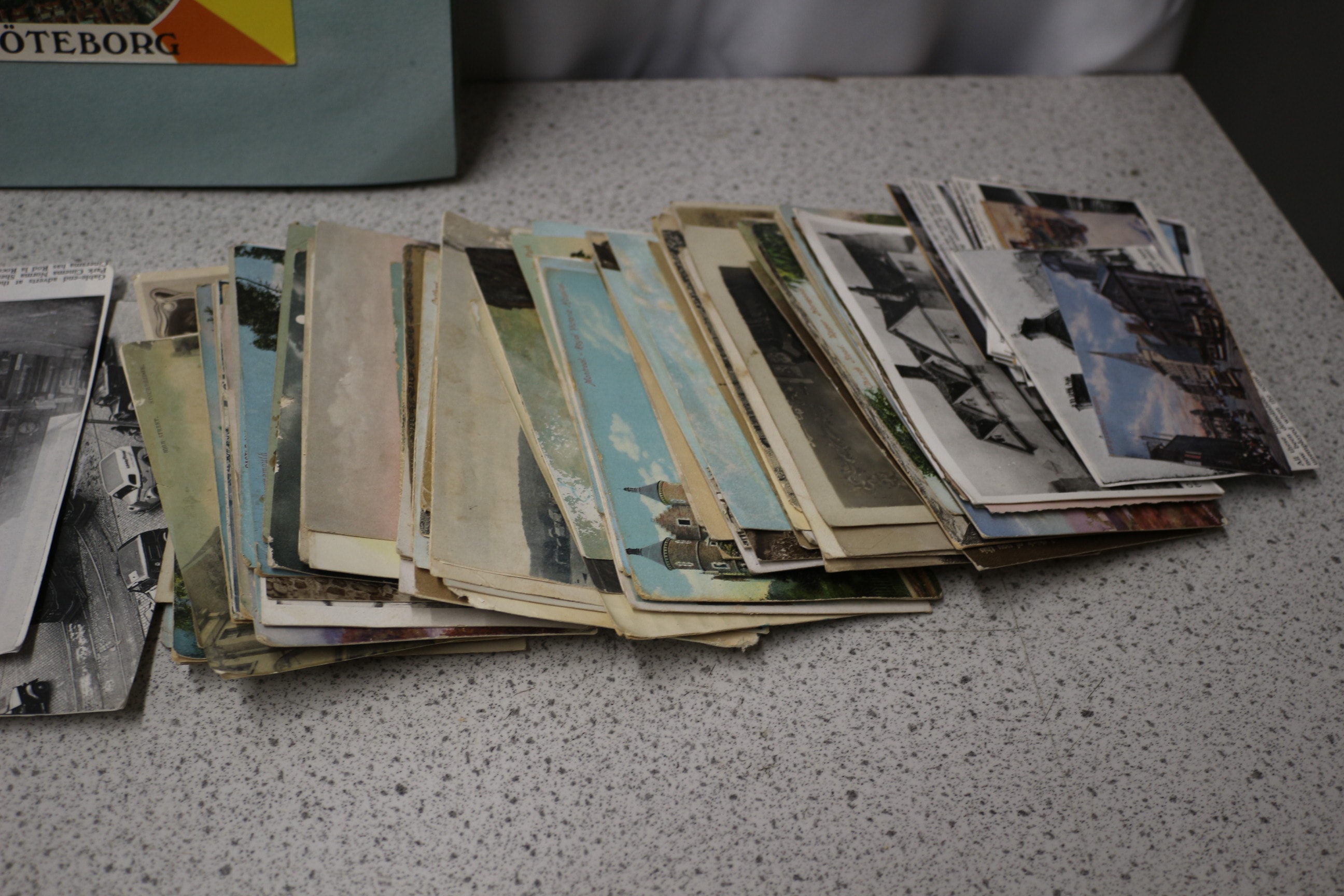 A light blue open scrapbook displays four colourful postcards from Calella de la Costa, Polzeath Cornwall, Imperial Gardens Cheltenham, and Göteborg Sweden, alongside two large stacks of loose black and white, sepia, and color postcards and photographs, including one with visible brand names ‘OXO’, ‘BOVRIL’, and ‘SUNLIGHT SOAP’. Some Pre war