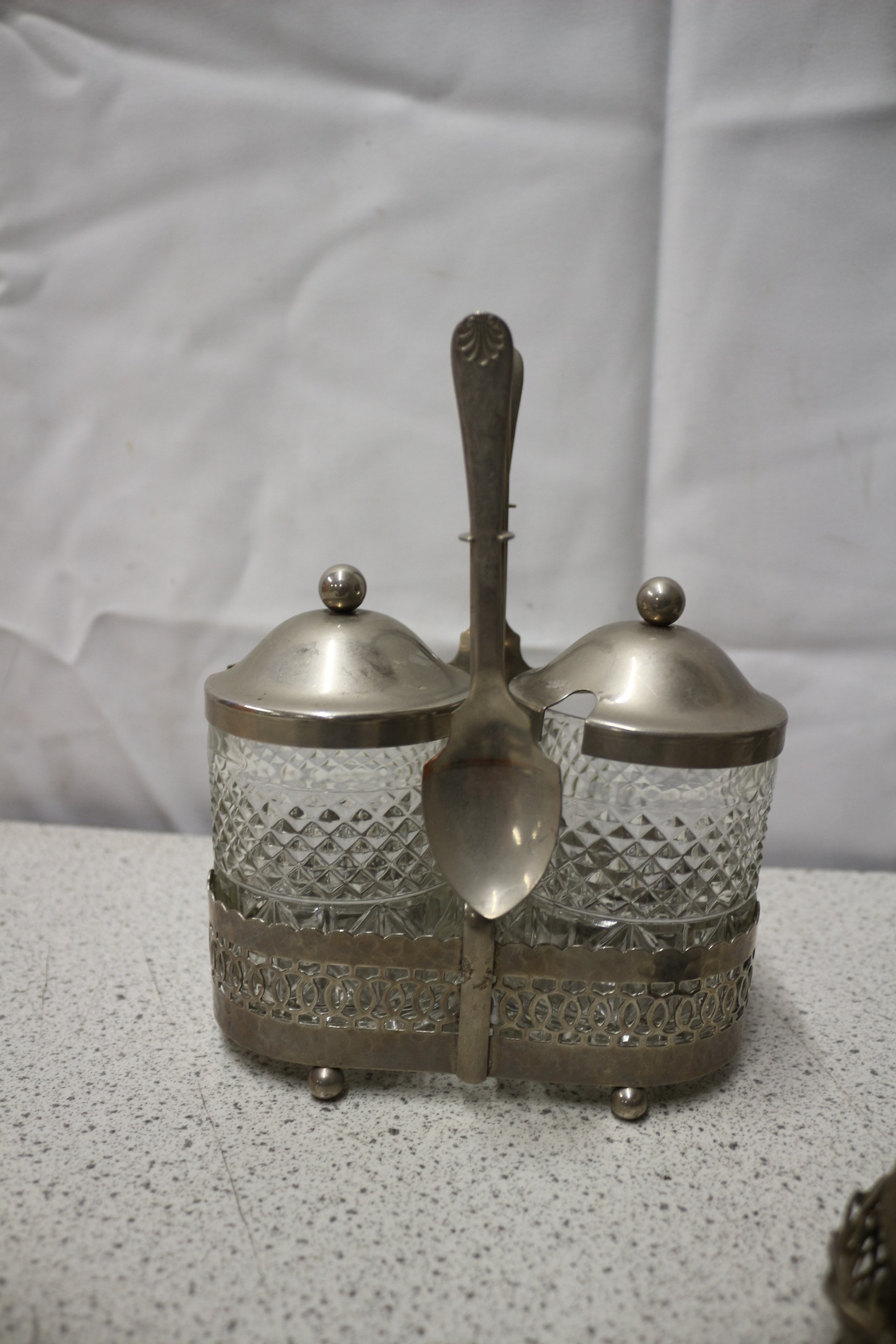 A cruet set, a small fluted dish, two woven baskets, two bird-shaped lidded containers, and five assorted serving utensils (tongs, spatula, two ladles/spoons) of tarnished silver-toned metal kitchen and serving ware.