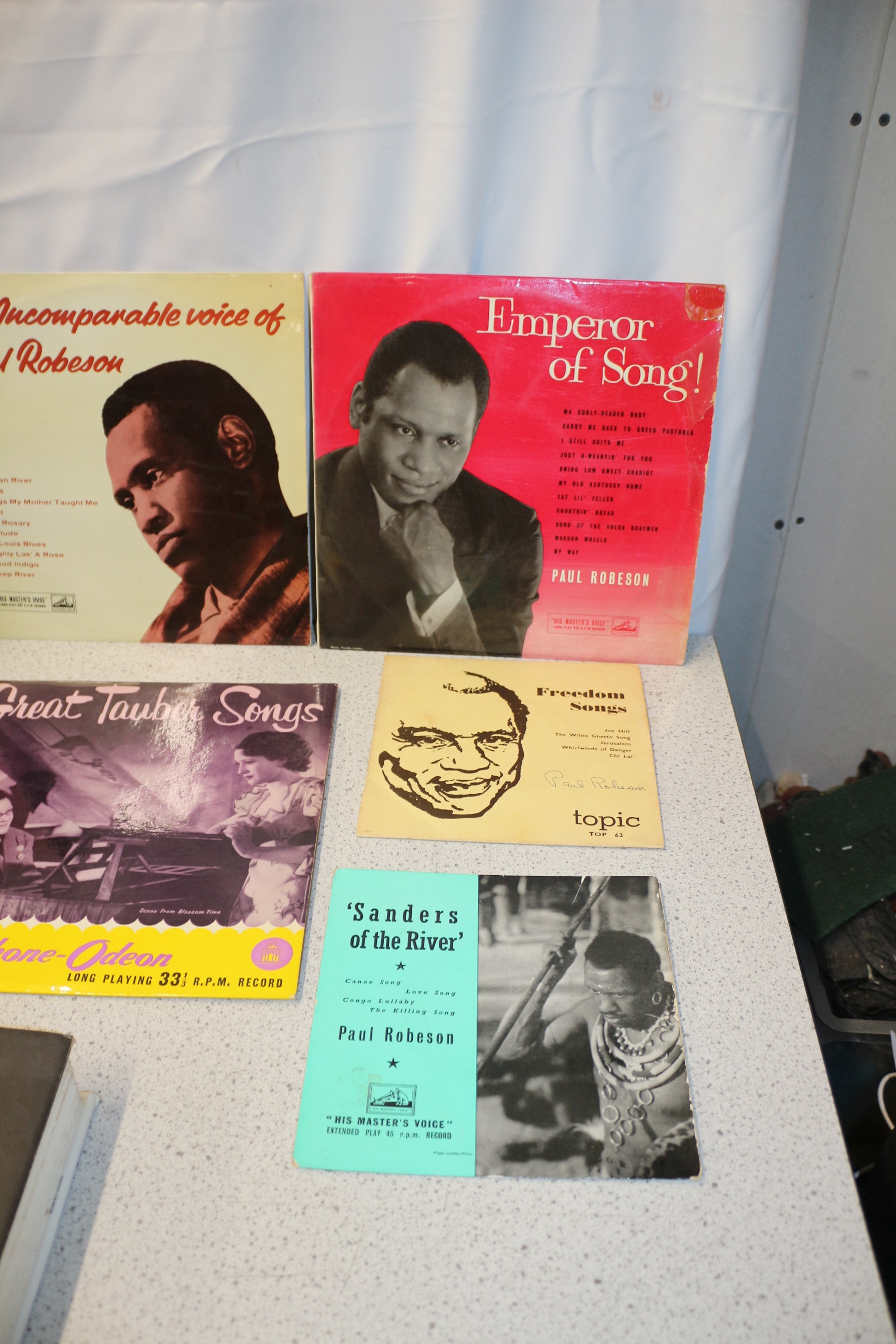 A collection of three Paul Robeson LPs, one loose record, three Paul Robeson EPs/singles, and a Paul Robeson biography by Martin Duberman.