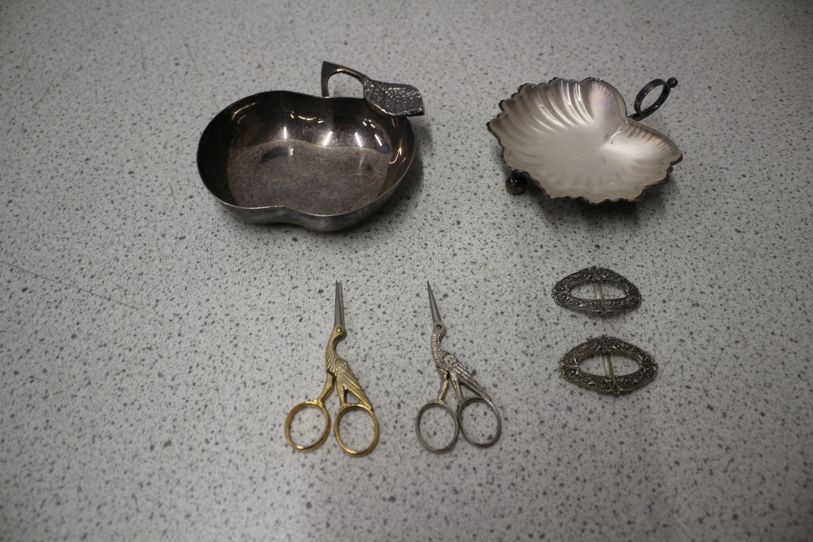 A collection of silver-coloured items including an apple-shaped dish, a shell-shaped dish marked ‘WALKER & HALL’S FRIGID PLATE’, two crane-shaped embroidery scissors, and two ornate oval buckles.