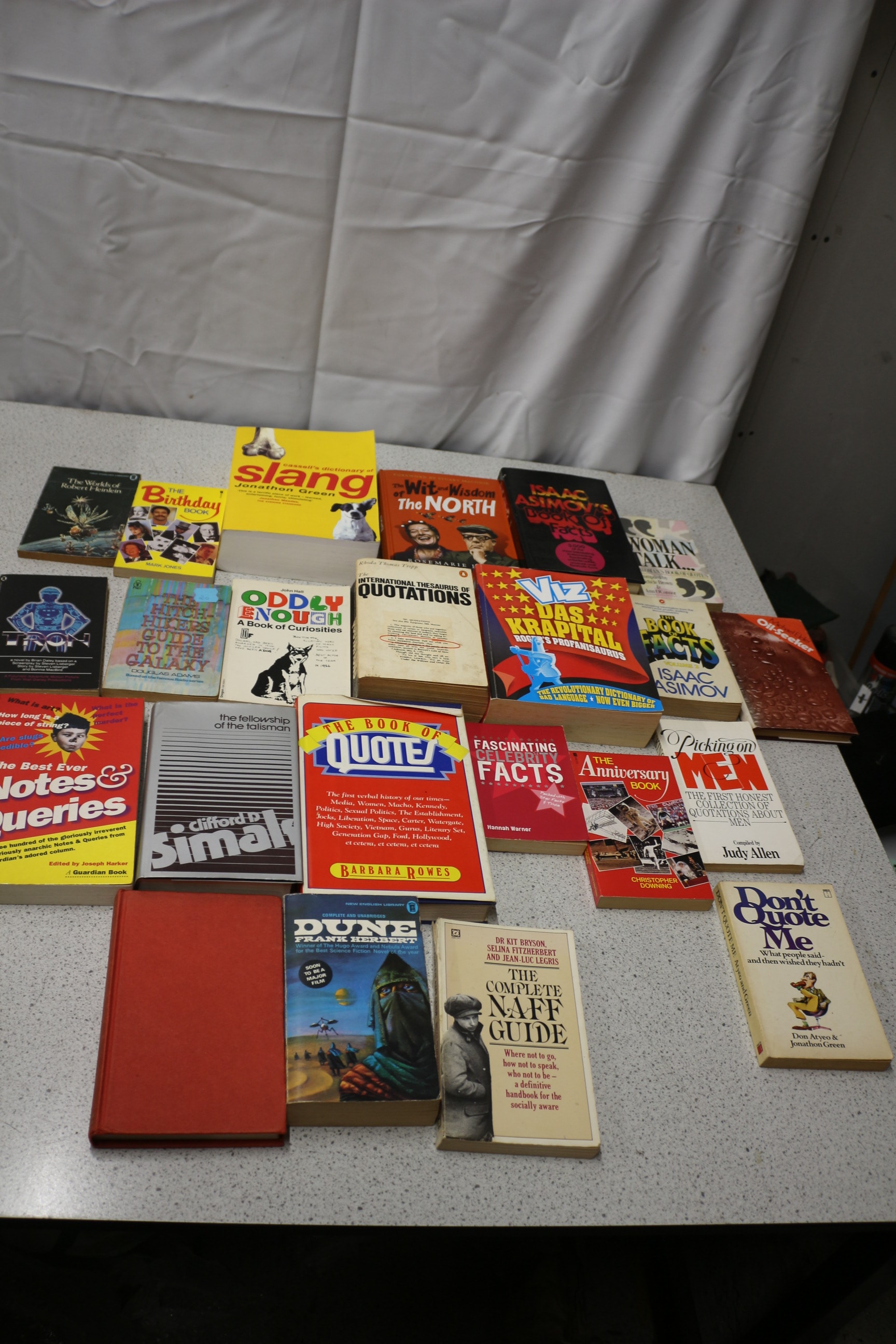 A lot of 23 assorted paperback and hardcover books in various colours, including titles such as “slang Jonathan Green, ” “ISAAC ASIMOV’S BOOK OF FACTS, ” “DUNE FRANK HERBERT, ” “THE HITCH-HIKERS GUIDE TO THE GALAXY Douglas Adams, ” and “THE COMPLETE NAFF GUIDE Dr Kit Bryson.”