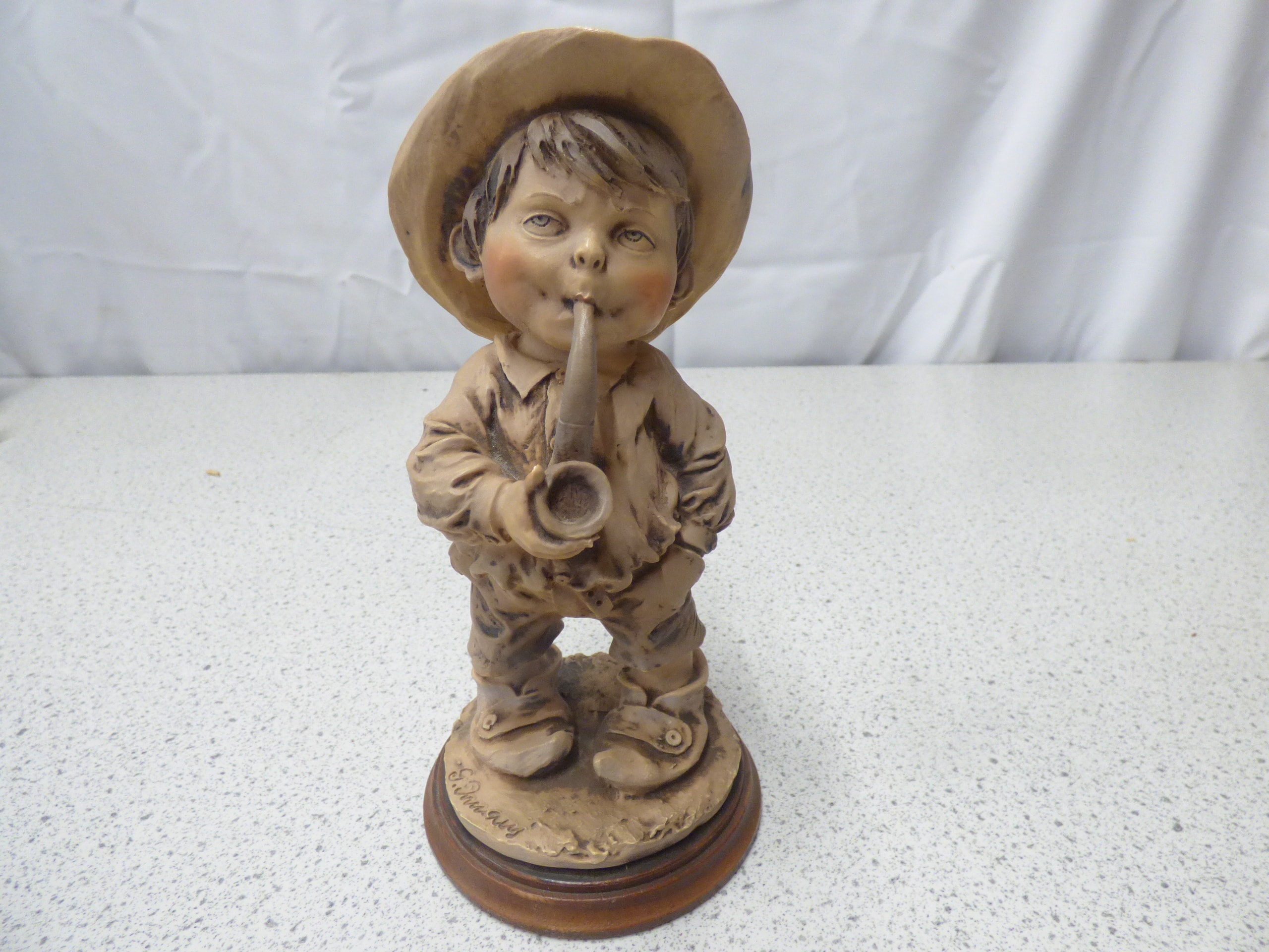 A beige, brown, and tan figurine of a boy wearing a hat and smoking a pipe, signed on its base. 20cm tall